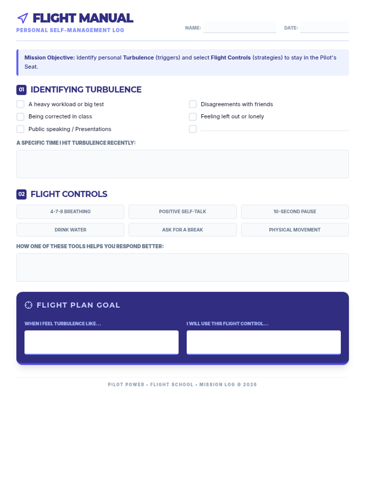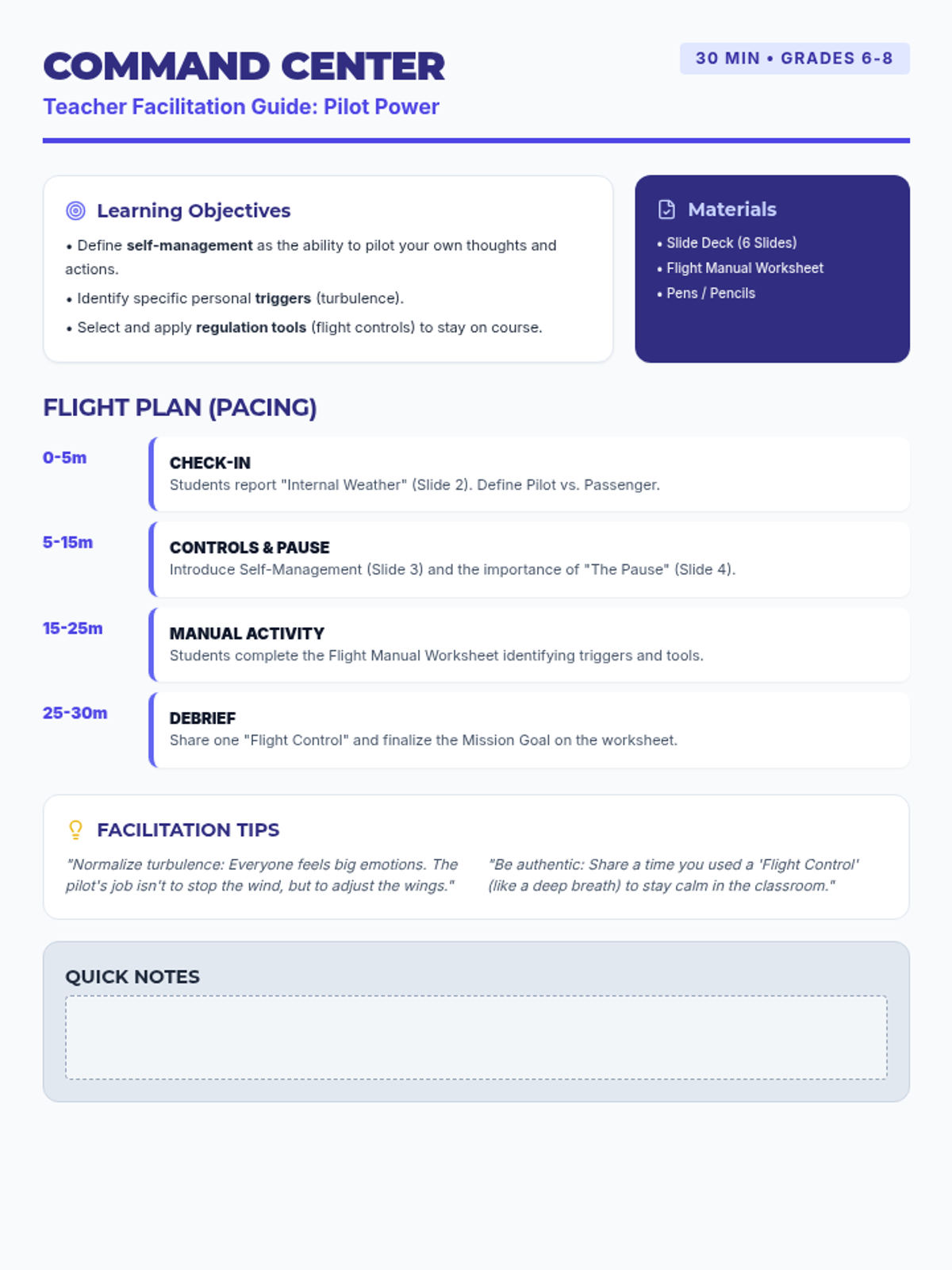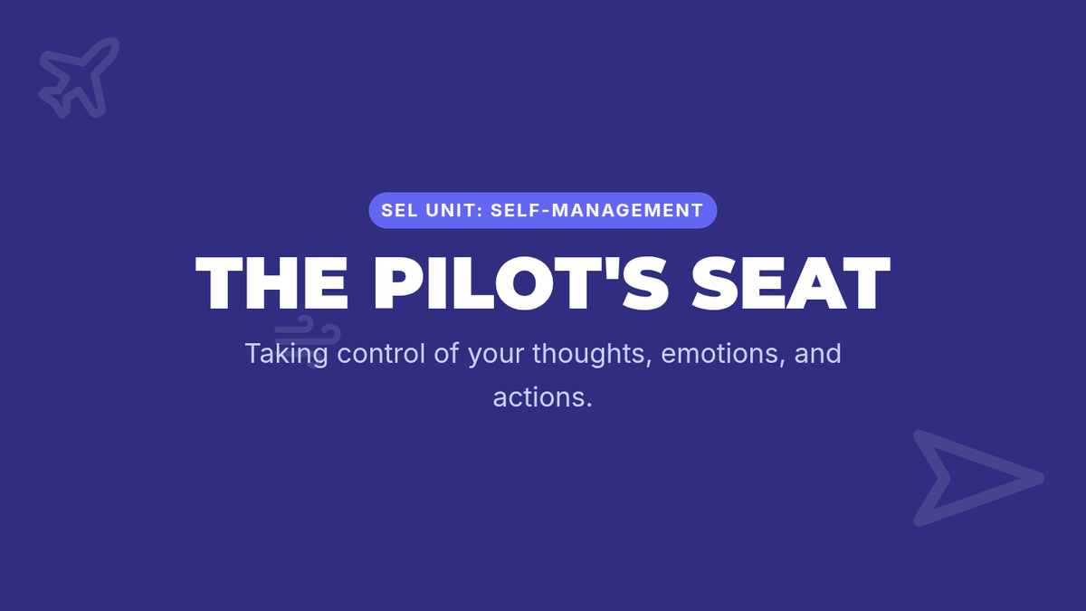 A 30-minute introductory lesson on self-management and self-regulation for middle schoolers, using a 'Pilot' metaphor to navigate emotions and actions.