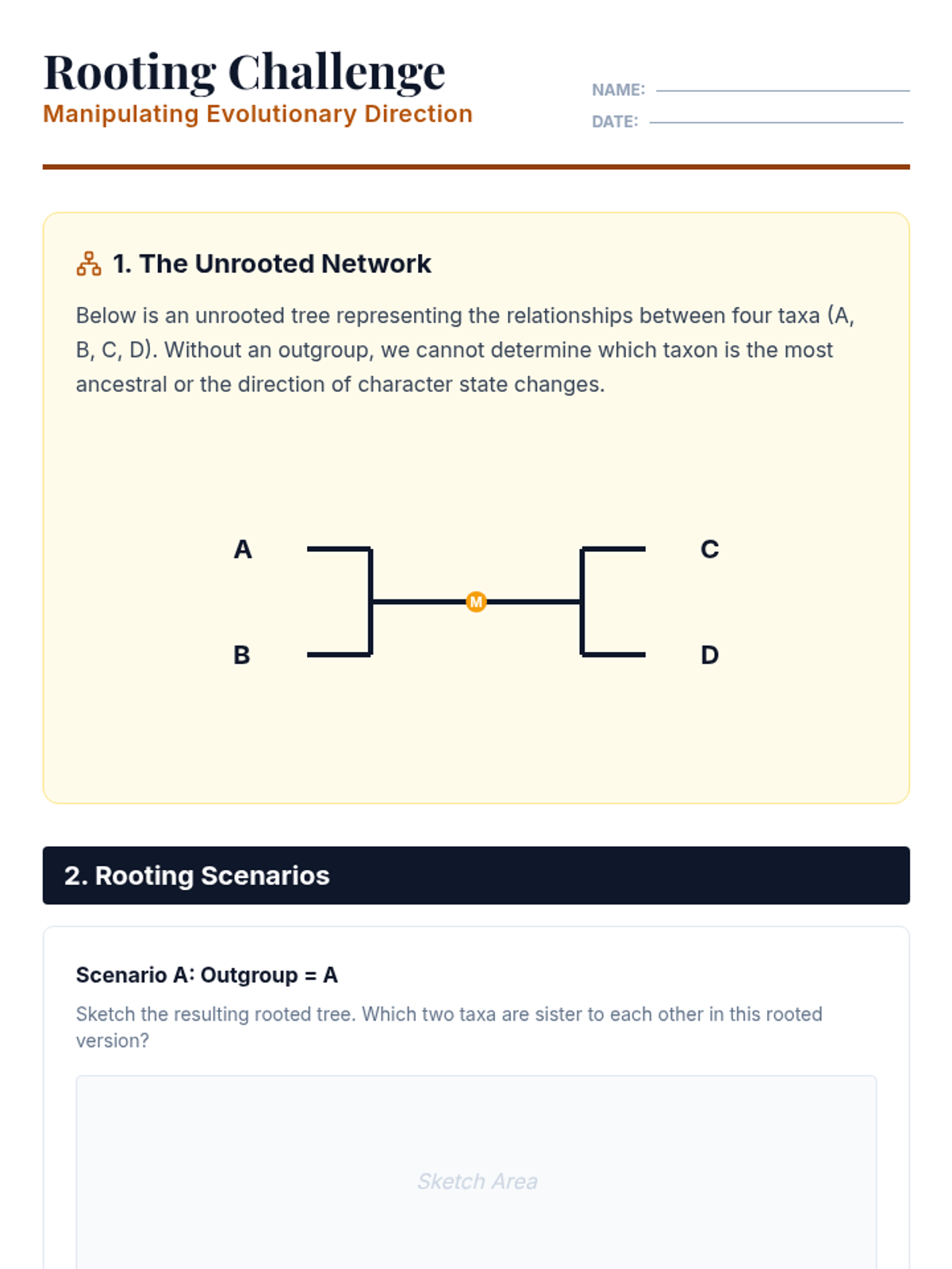 Students explore how the choice of an outgroup determines the root of the tree and the polarity of evolutionary change. They manipulate tree diagrams to see how changing the root alters the interpreted relationships.