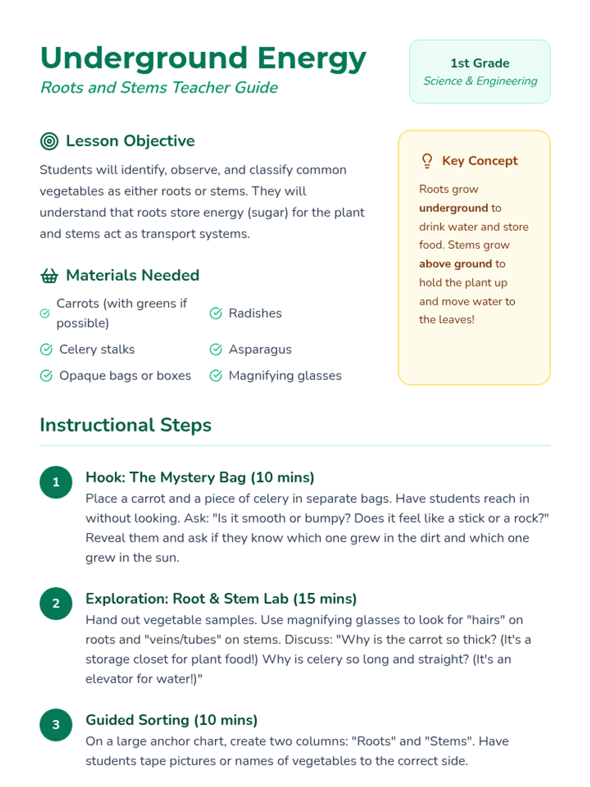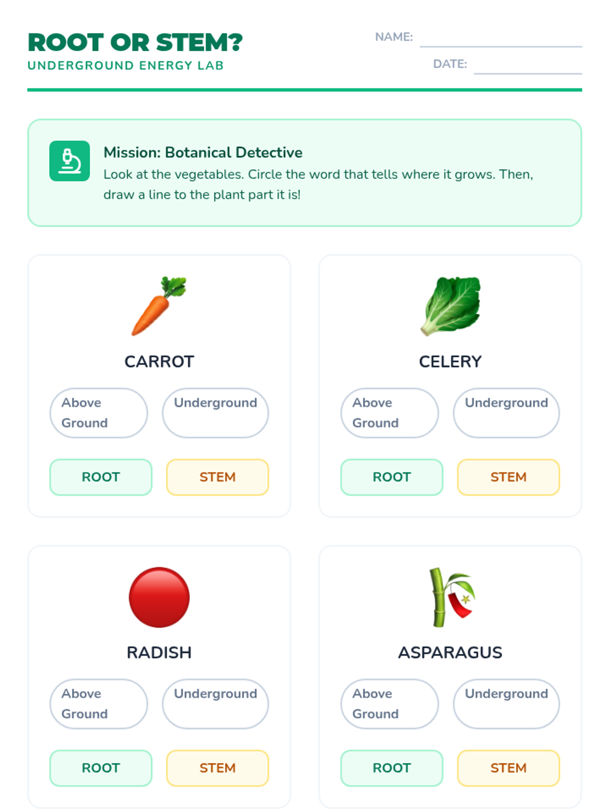 Students identify and classify vegetables that are roots (carrots, radishes) and stems (celery, asparagus), exploring why plants store energy in these parts.