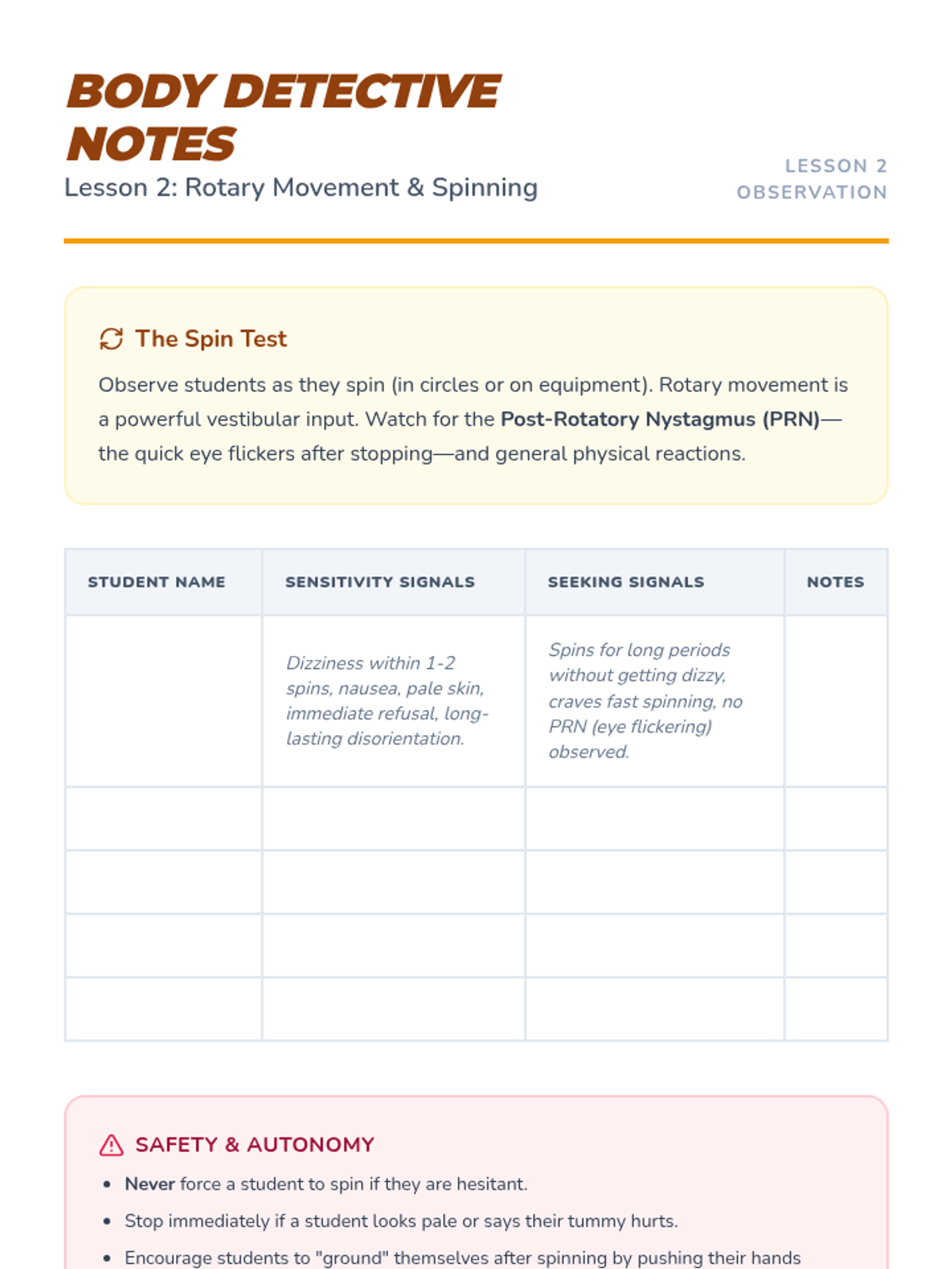 Students explore rotary movement through spinning activities to identify preferences for intense vestibular input versus sensitivity to dizziness.
