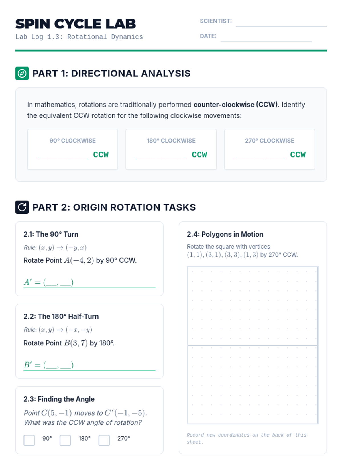 Students perform rotations around a center point, analyzing the relationship between the center, angle, and distance of points during the motion.