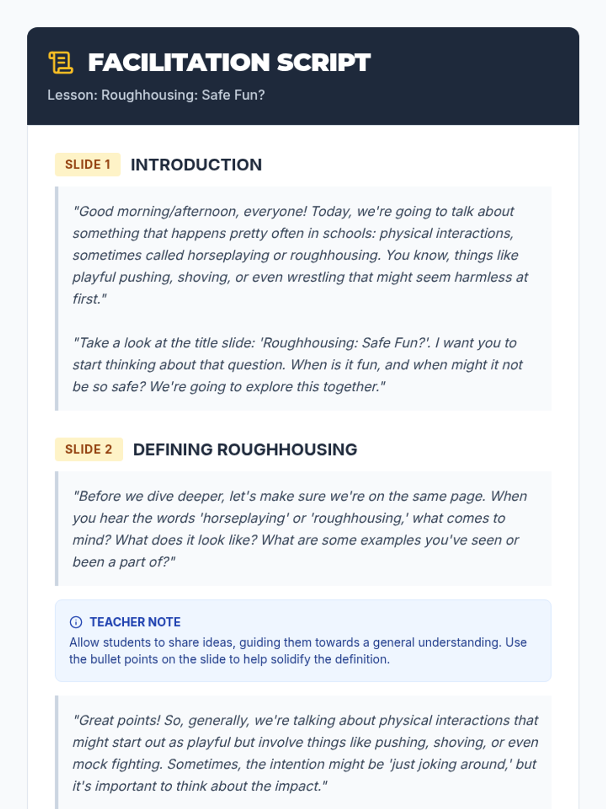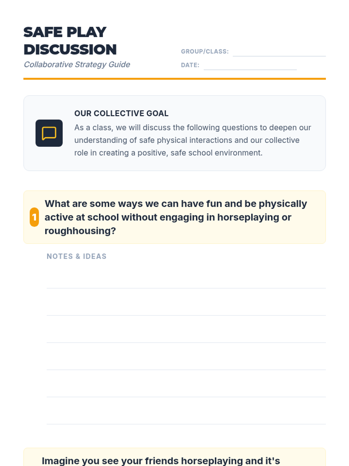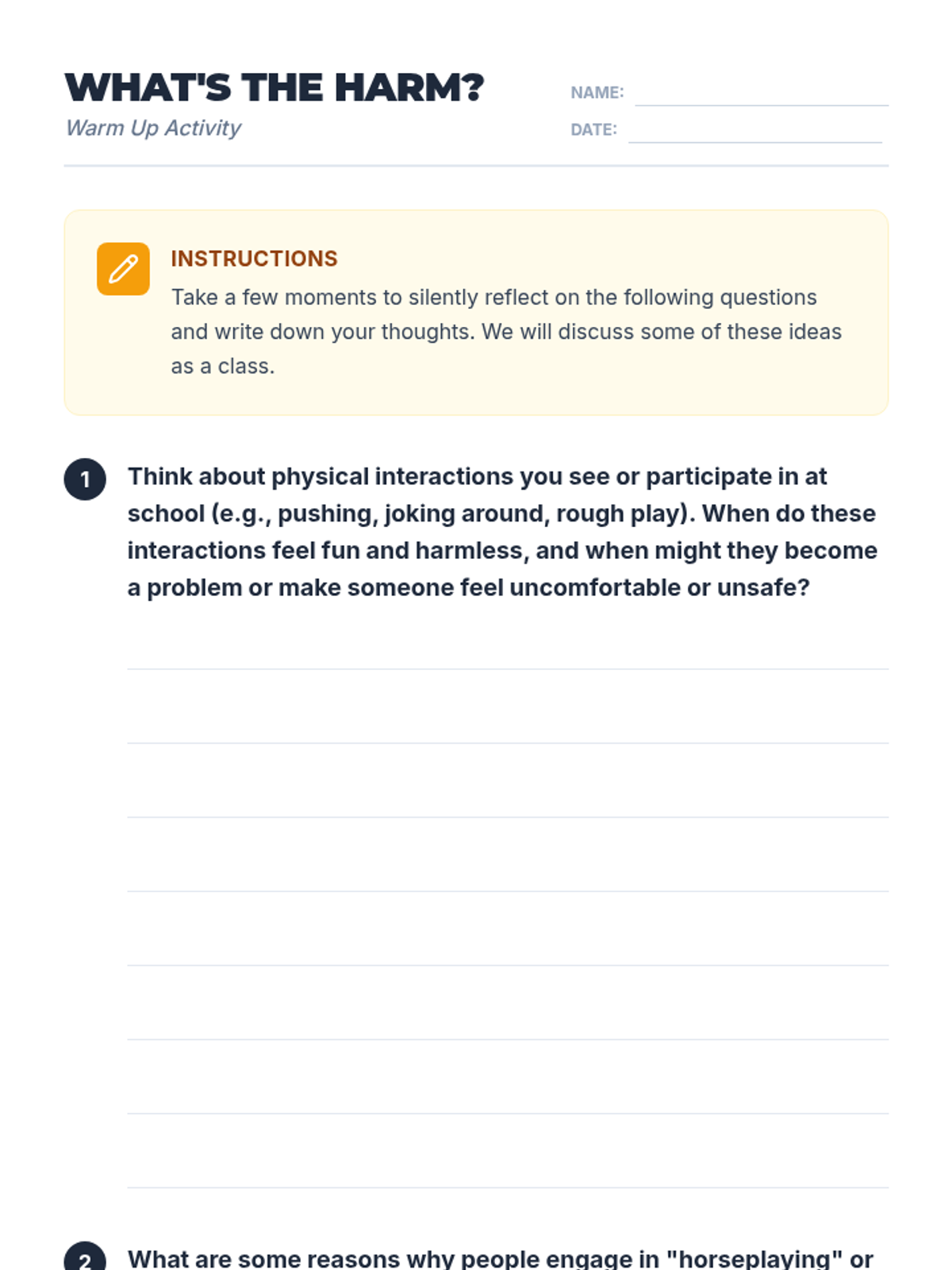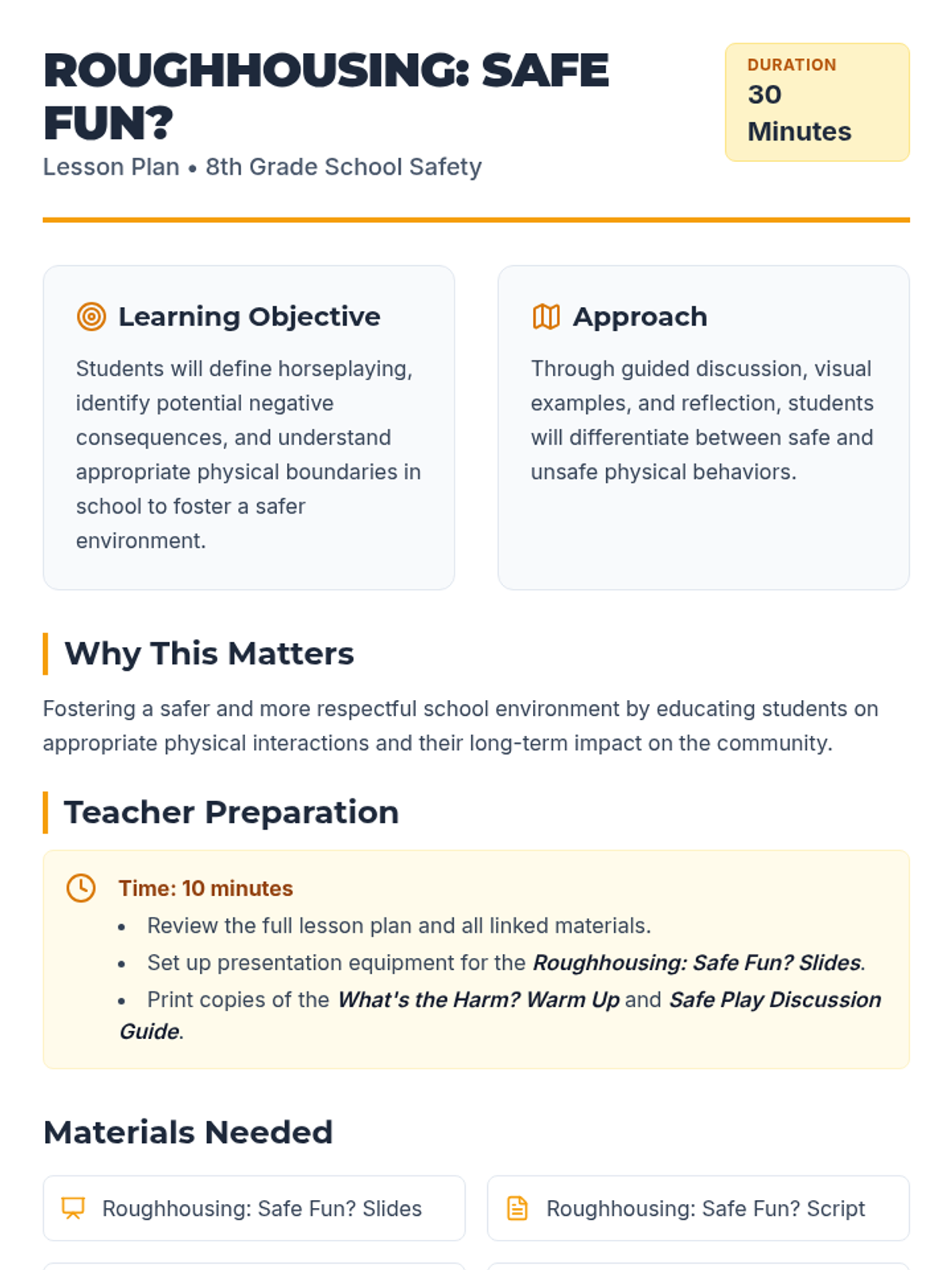 This 30-minute lesson for 8th-grade students explores the impact of horseplaying and roughhousing in a school setting, fostering a safer and more respectful environment. Students will learn to distinguish between appropriate and inappropriate physical interactions, understanding the potential consequences and promoting responsible behavior.
