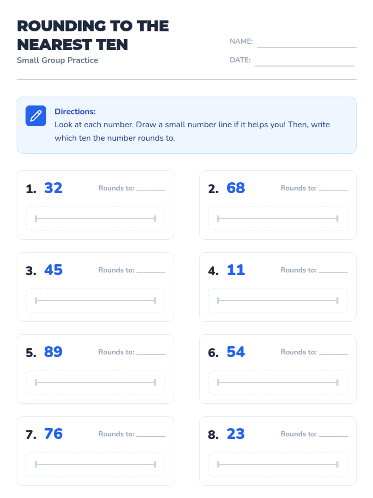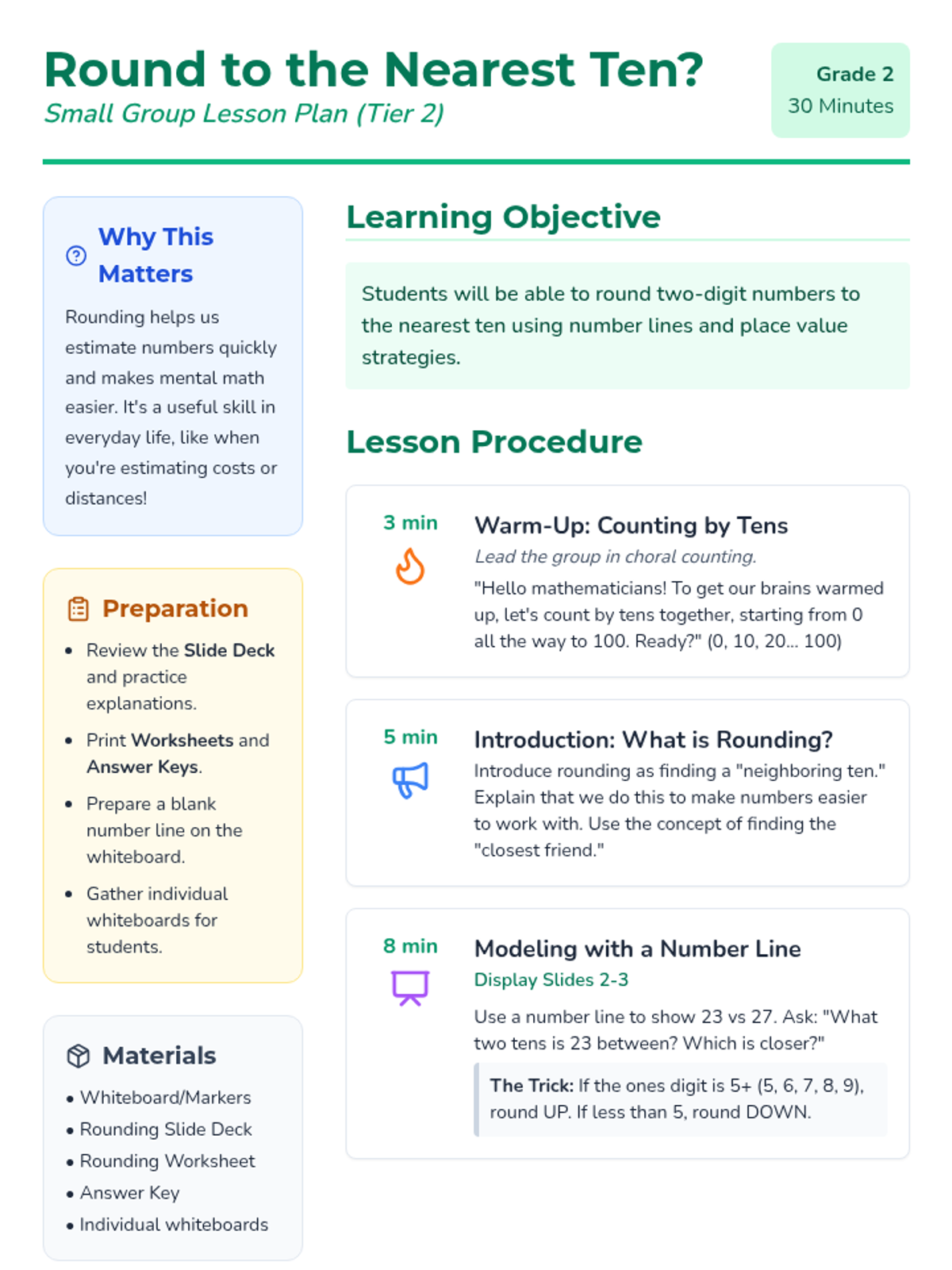 This 30-minute lesson helps 2nd-grade students master rounding two-digit numbers to the nearest ten using number lines and place value understanding. It's designed for a small group requiring additional support in this key foundational math skill.
