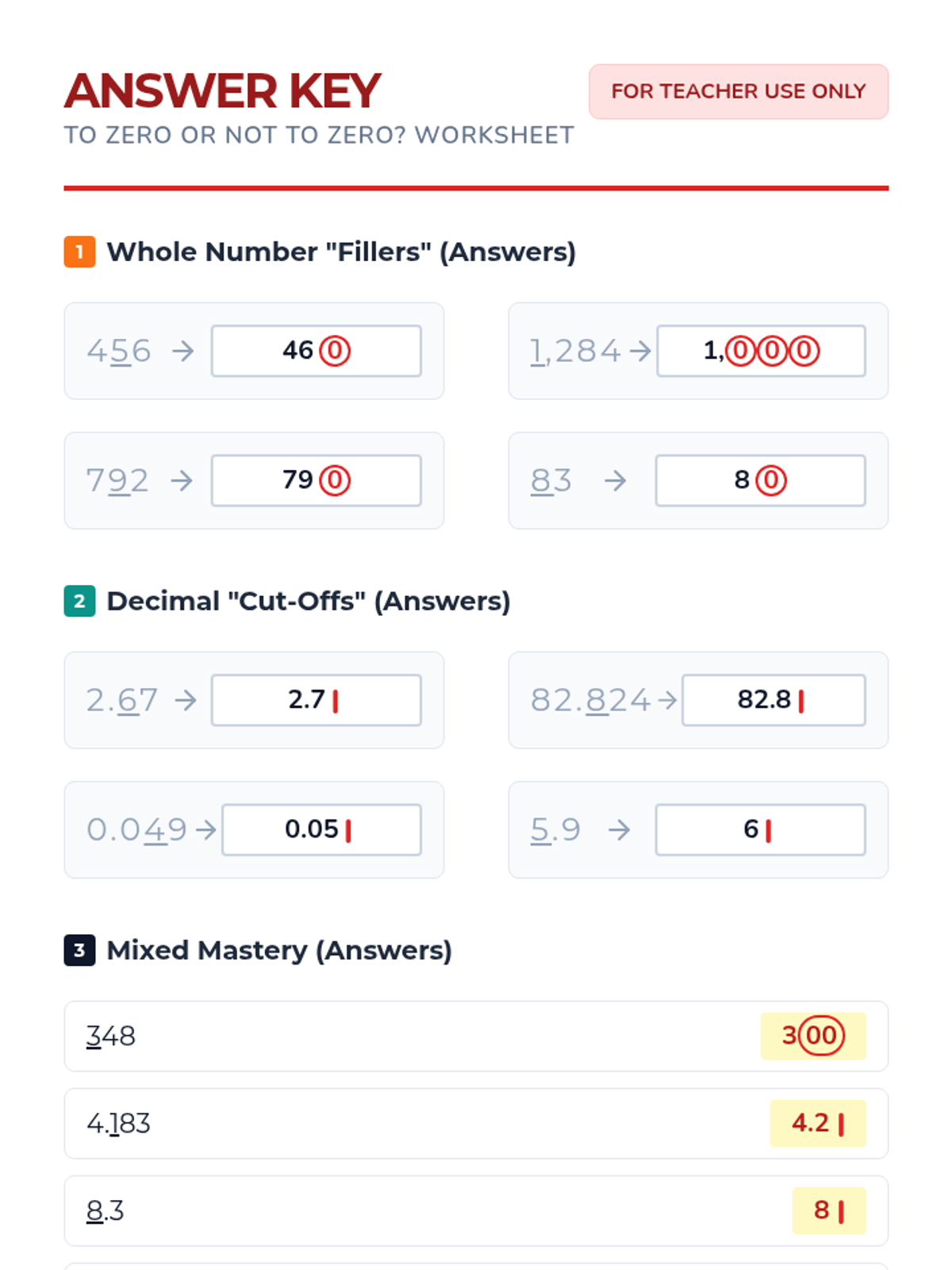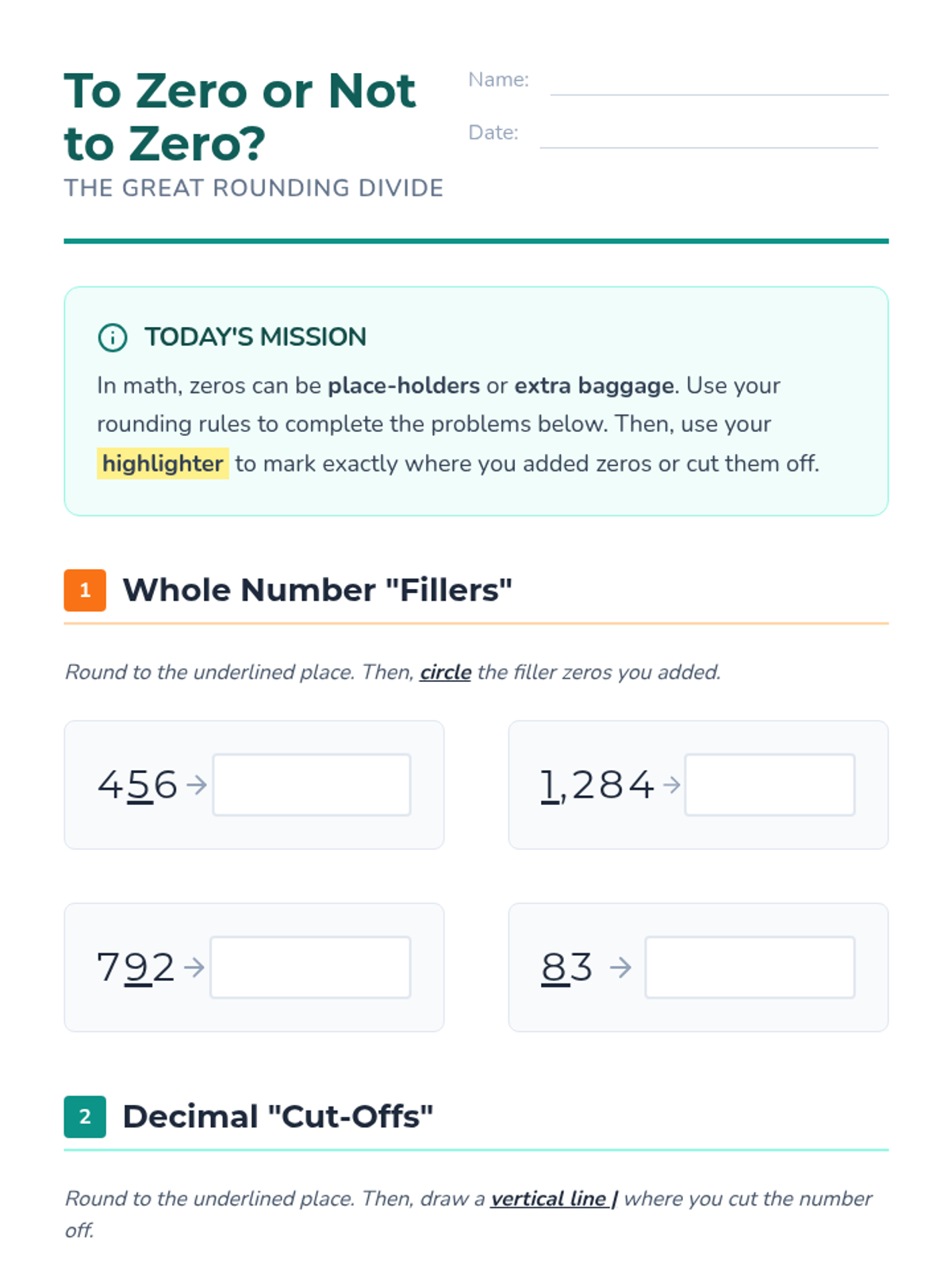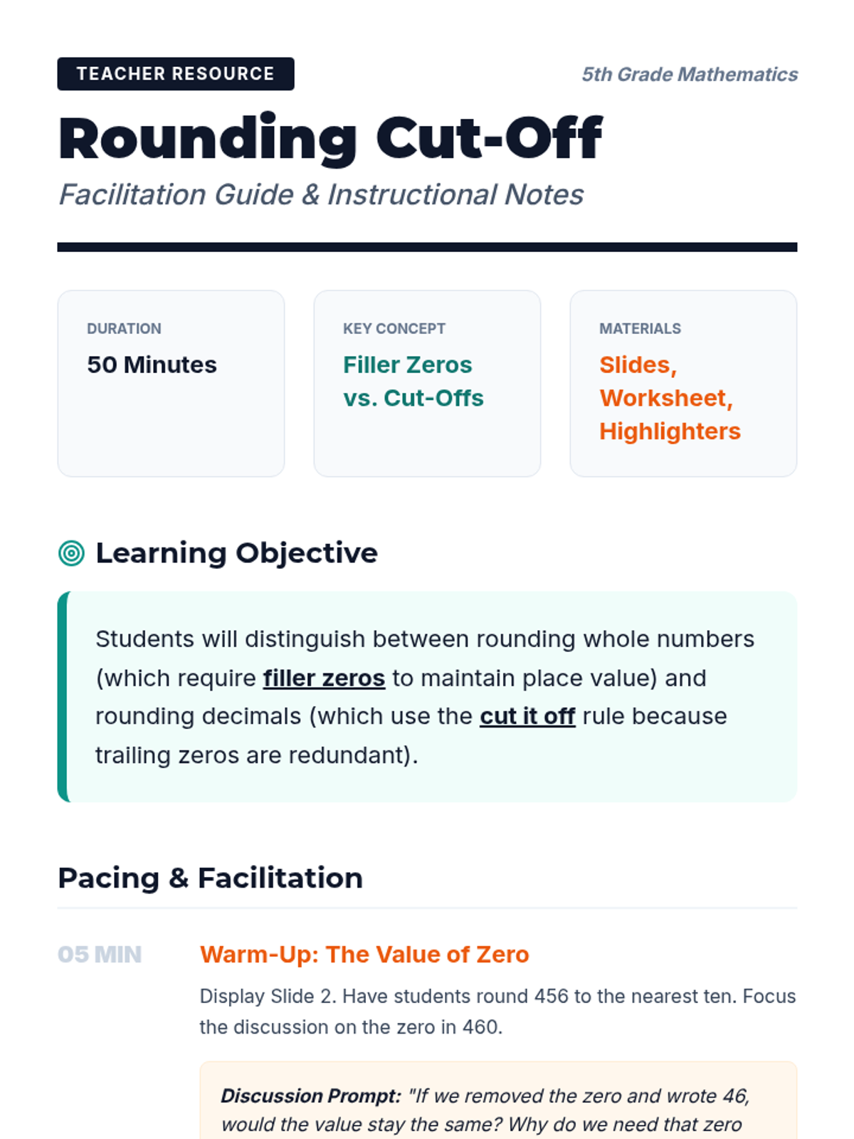 A 5th-grade math lesson focused on the distinction between rounding whole numbers (filling with zeros) and rounding decimals (cutting off digits). Includes a slide deck with an embedded video, a guided practice worksheet, and a teacher facilitation guide.