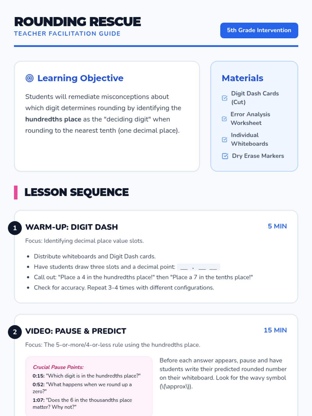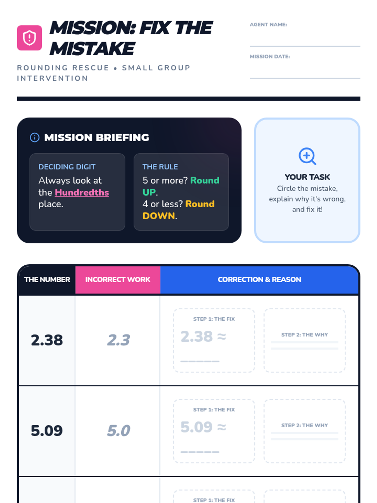 A targeted small-group intervention focusing on rounding decimals to one decimal place by identifying the correct 'deciding' digit in the hundredths place.