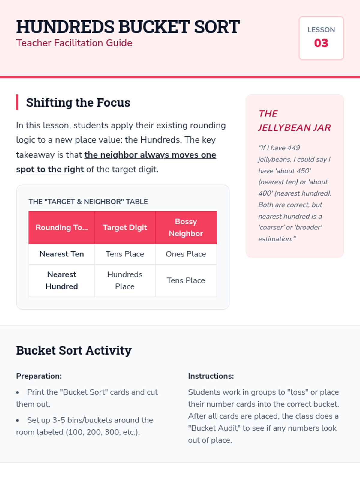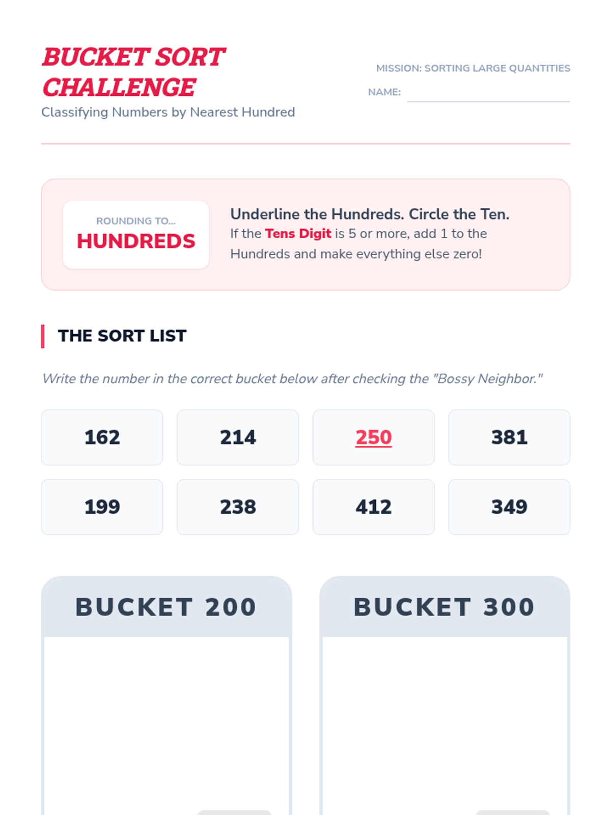 Students extend rounding skills to the nearest hundred using buckets and sorting activities to classify three-digit numbers.