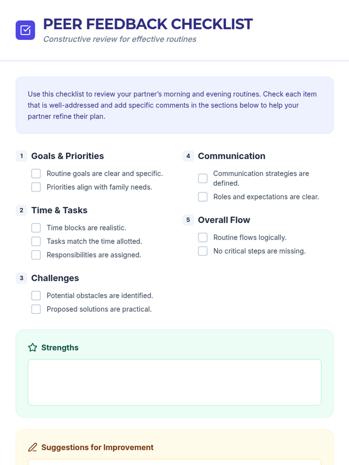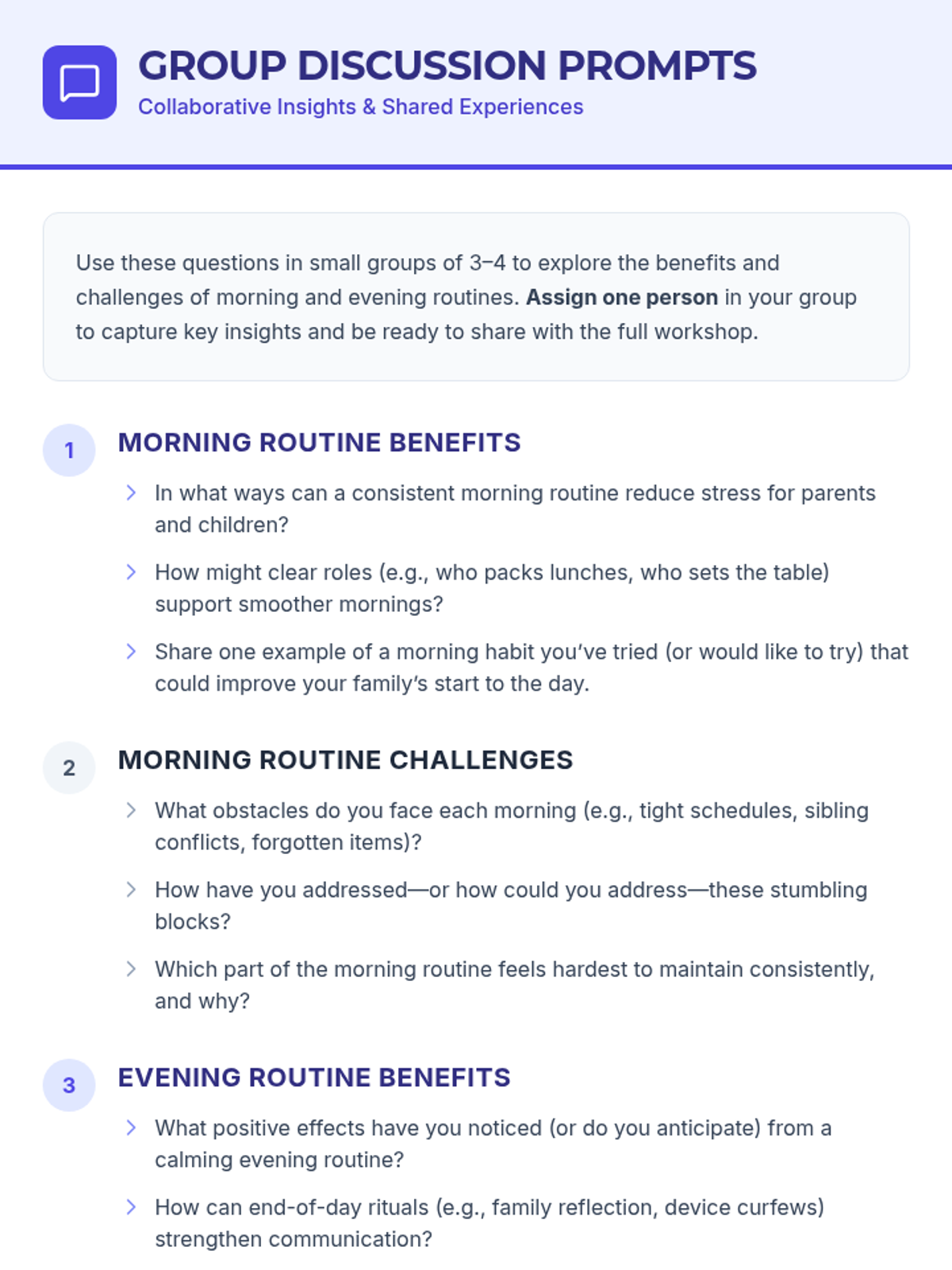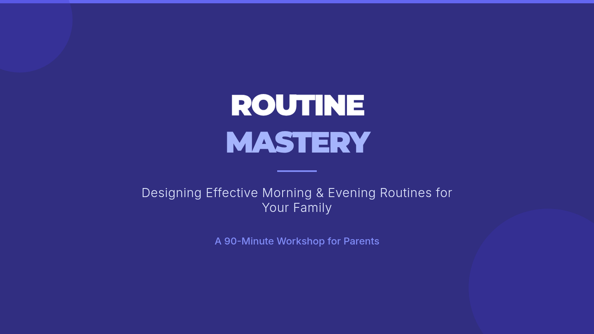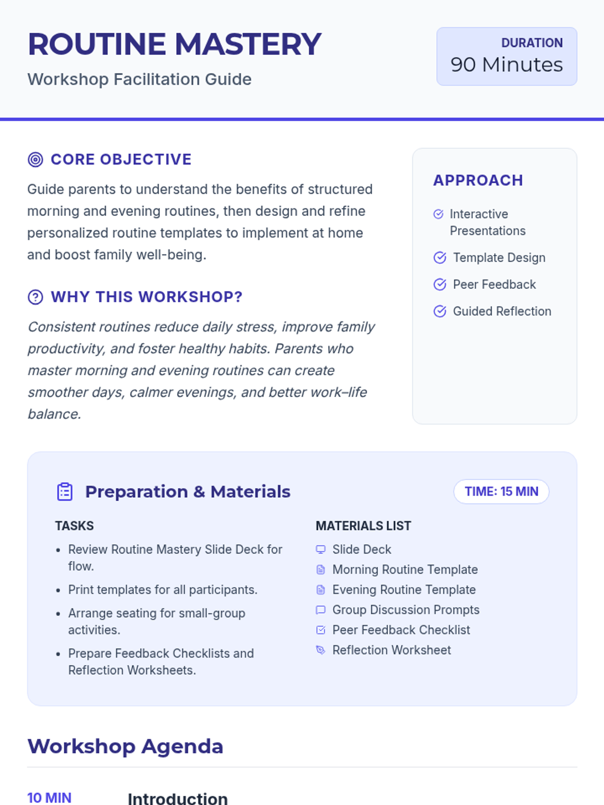 A 90-minute workshop for parents focused on designing effective morning and evening routines to reduce stress and improve family productivity. Participants will create personalized templates and engage in peer feedback sessions.