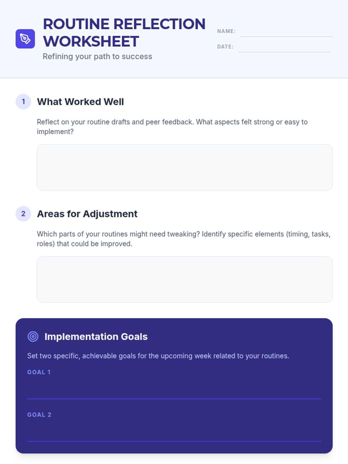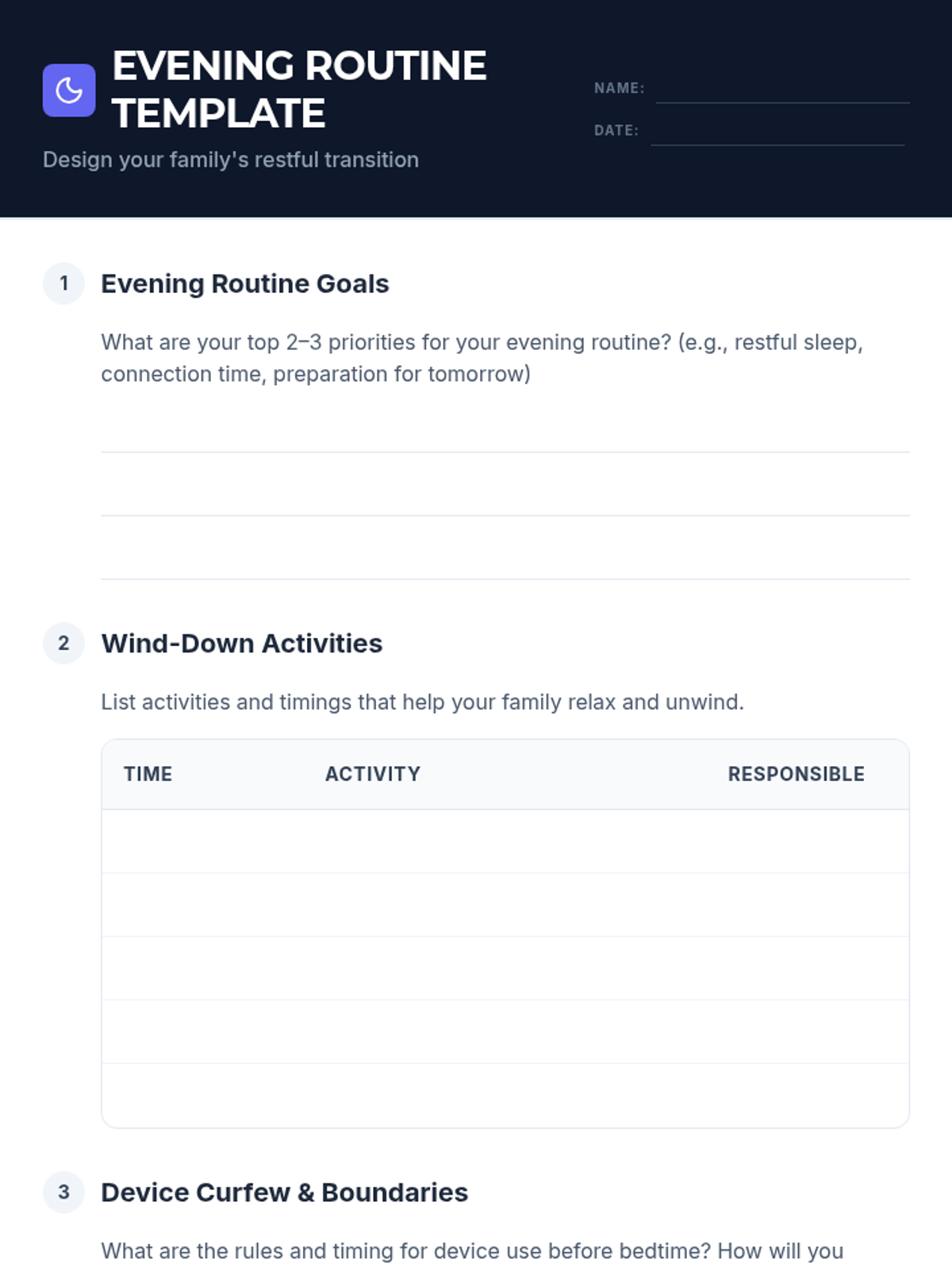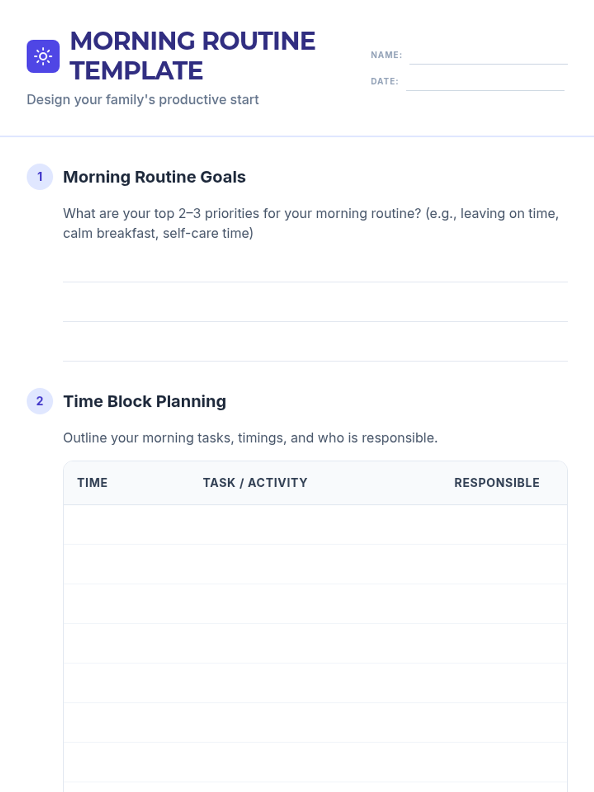A 90-minute workshop for parents focused on designing effective morning and evening routines to reduce stress and improve family productivity. Participants will create personalized templates and engage in peer feedback sessions.