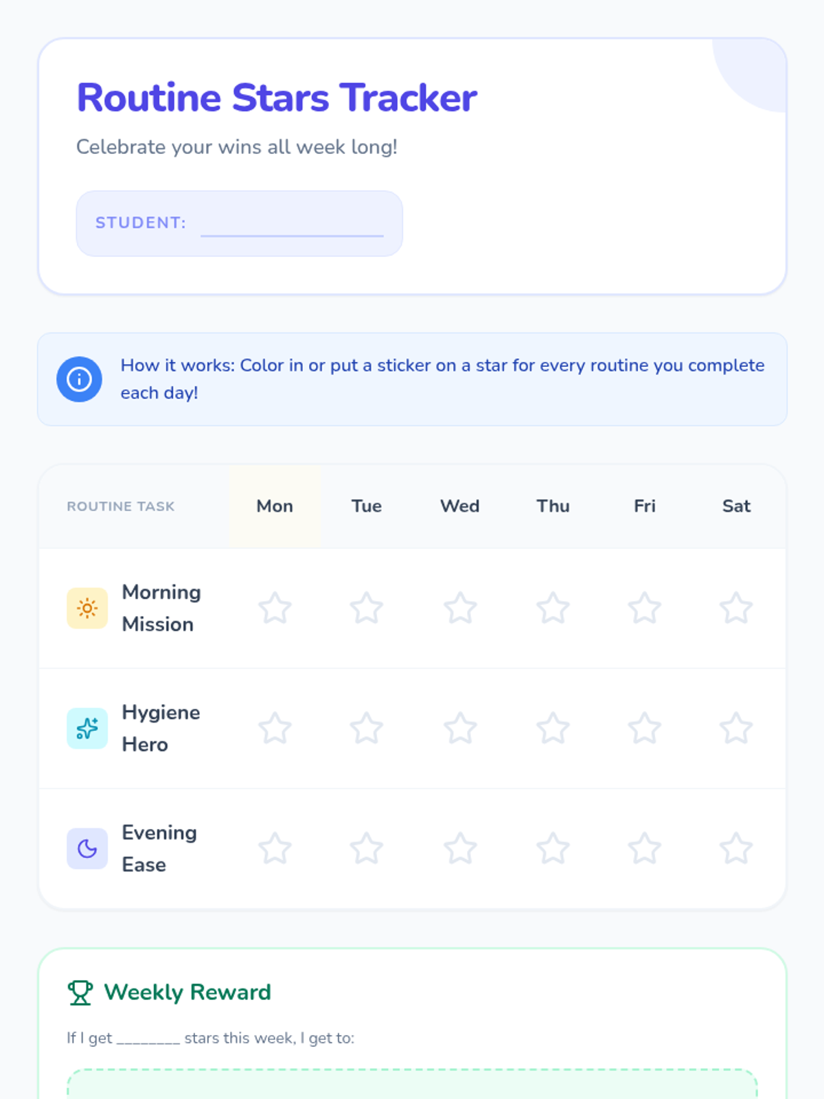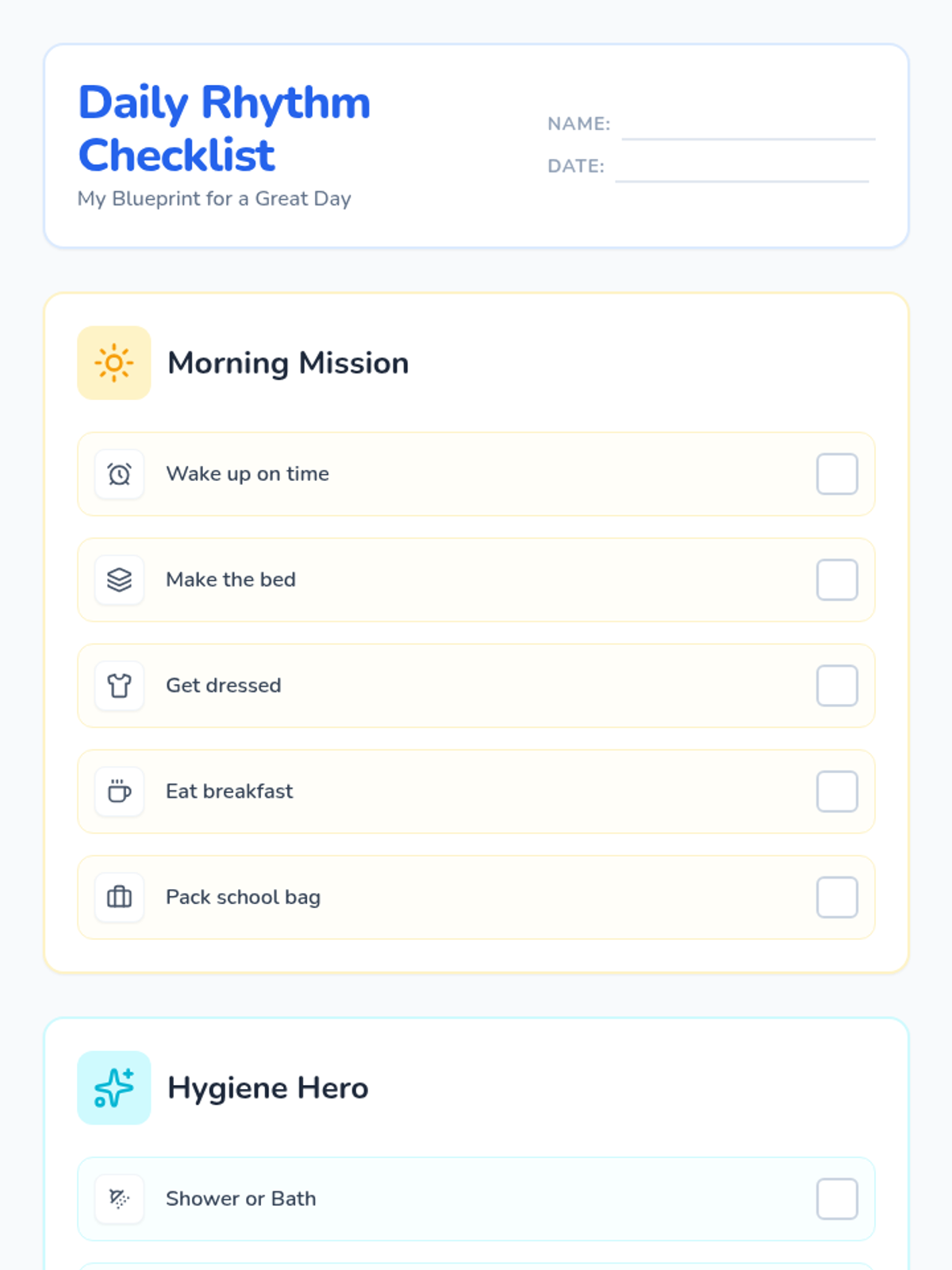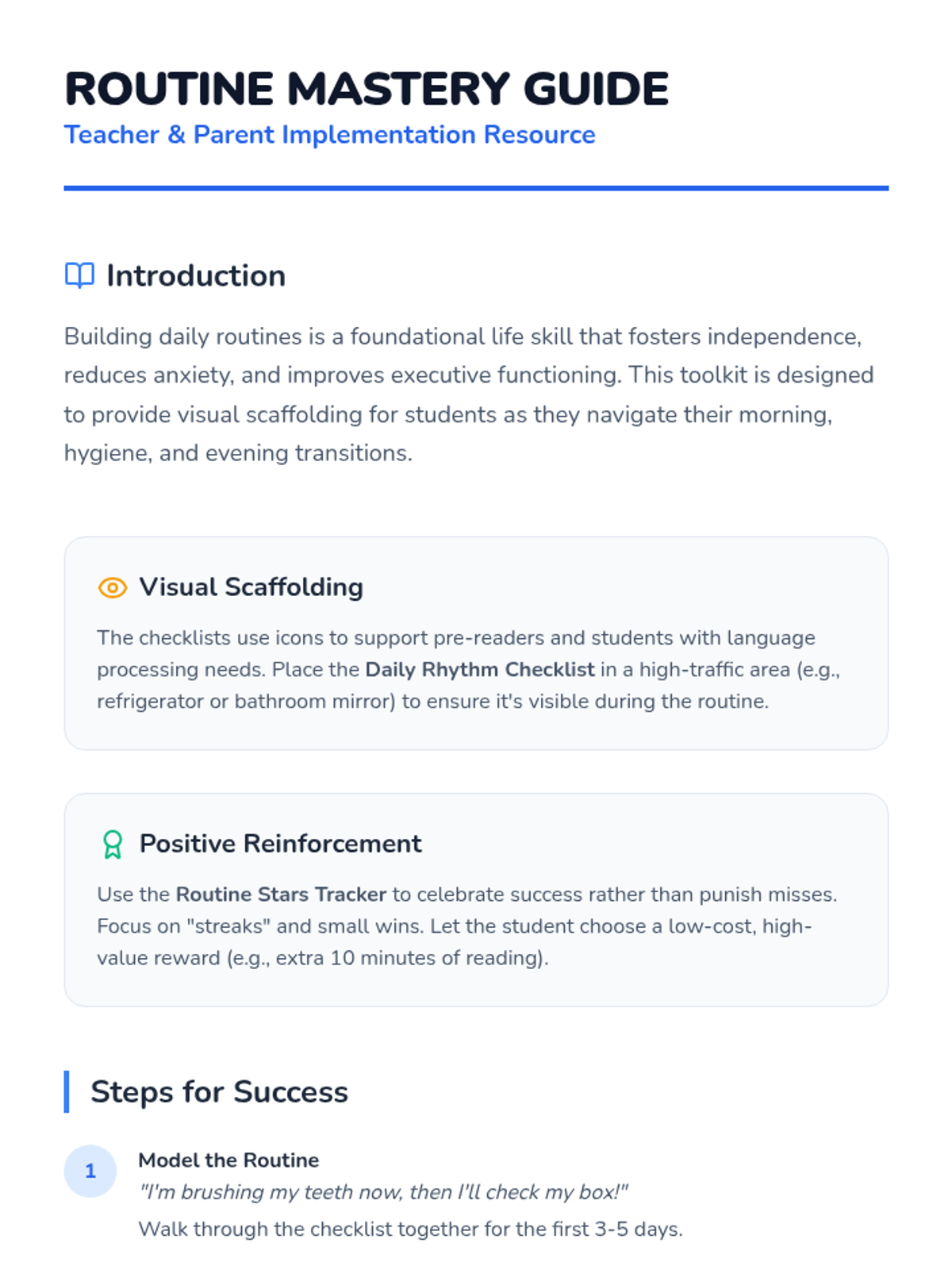 A lesson designed to help students master their daily routines through visual checklists and tracking tools. This lesson focuses on building independence in morning, hygiene, and evening tasks.