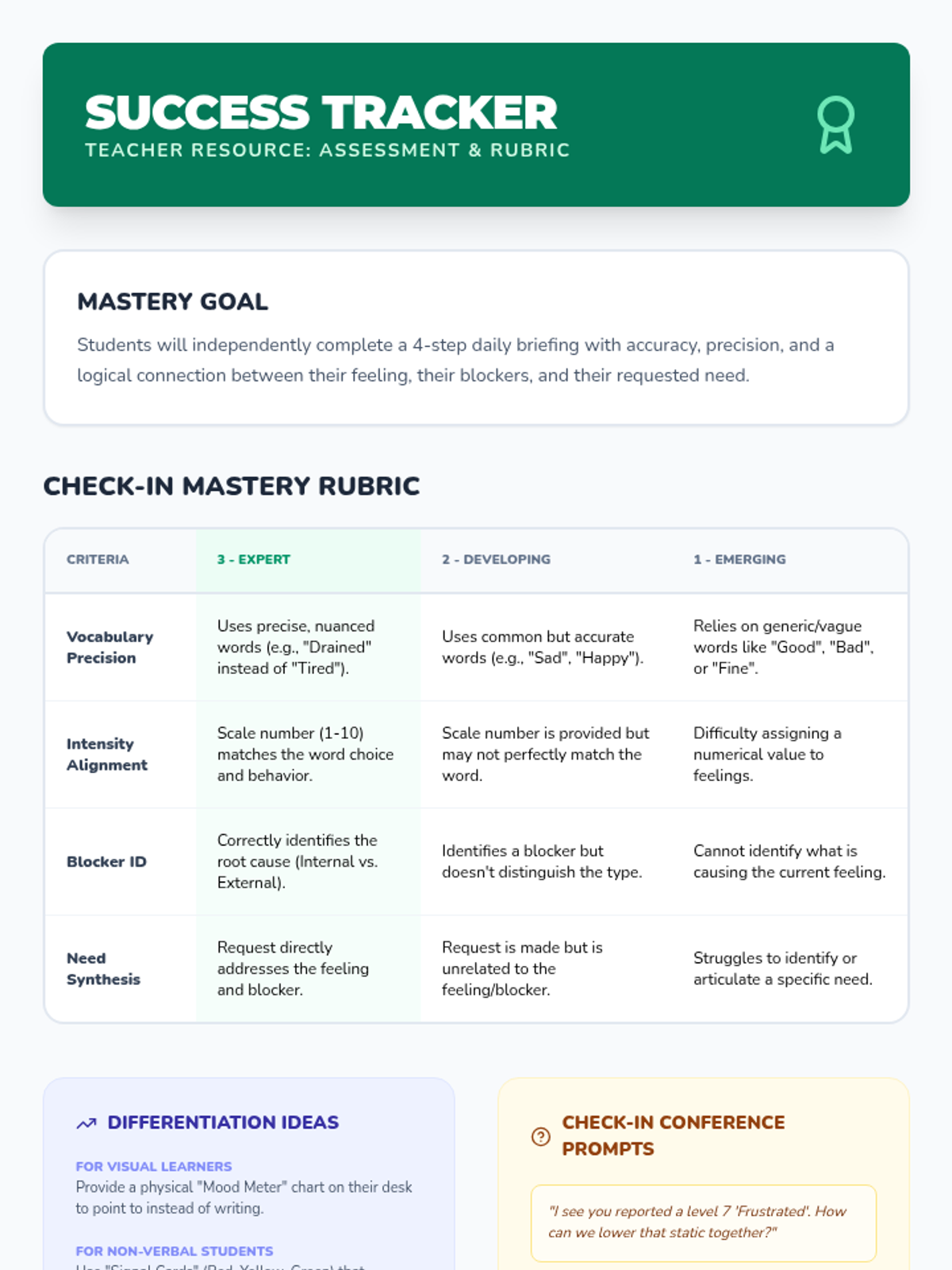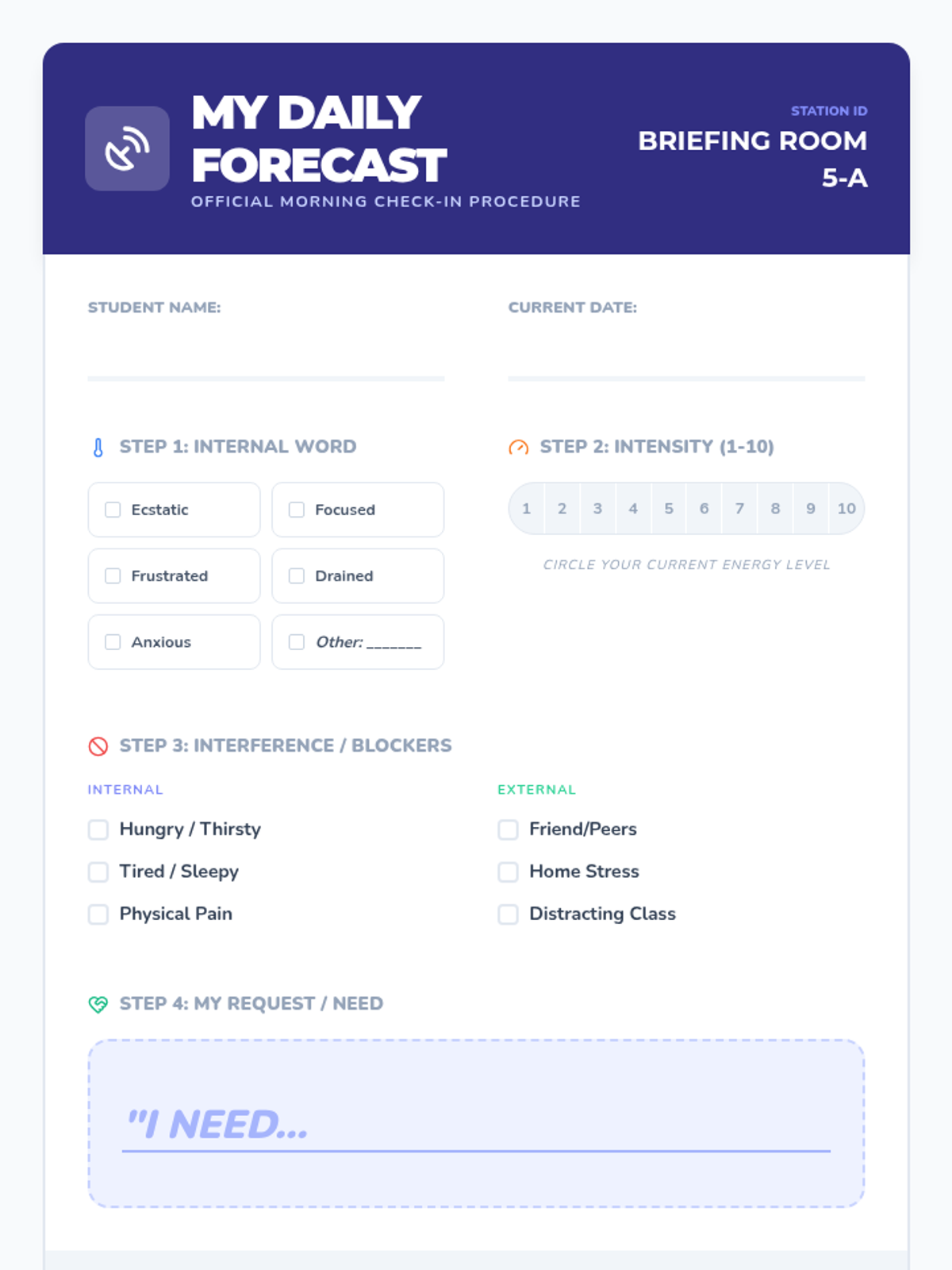 Students synthesize all skills by practicing a full daily check-in routine through various fictional and real-life scenarios.