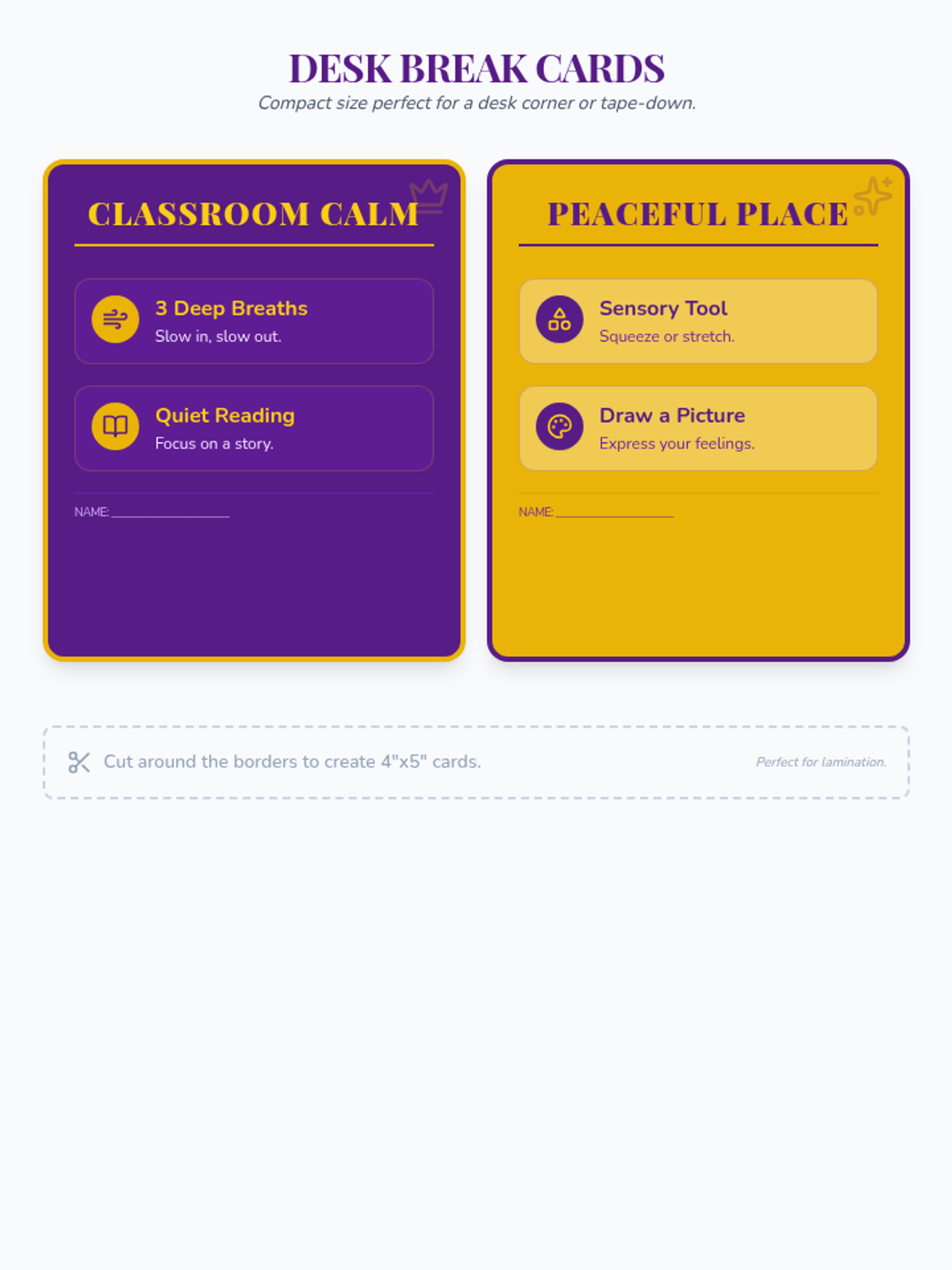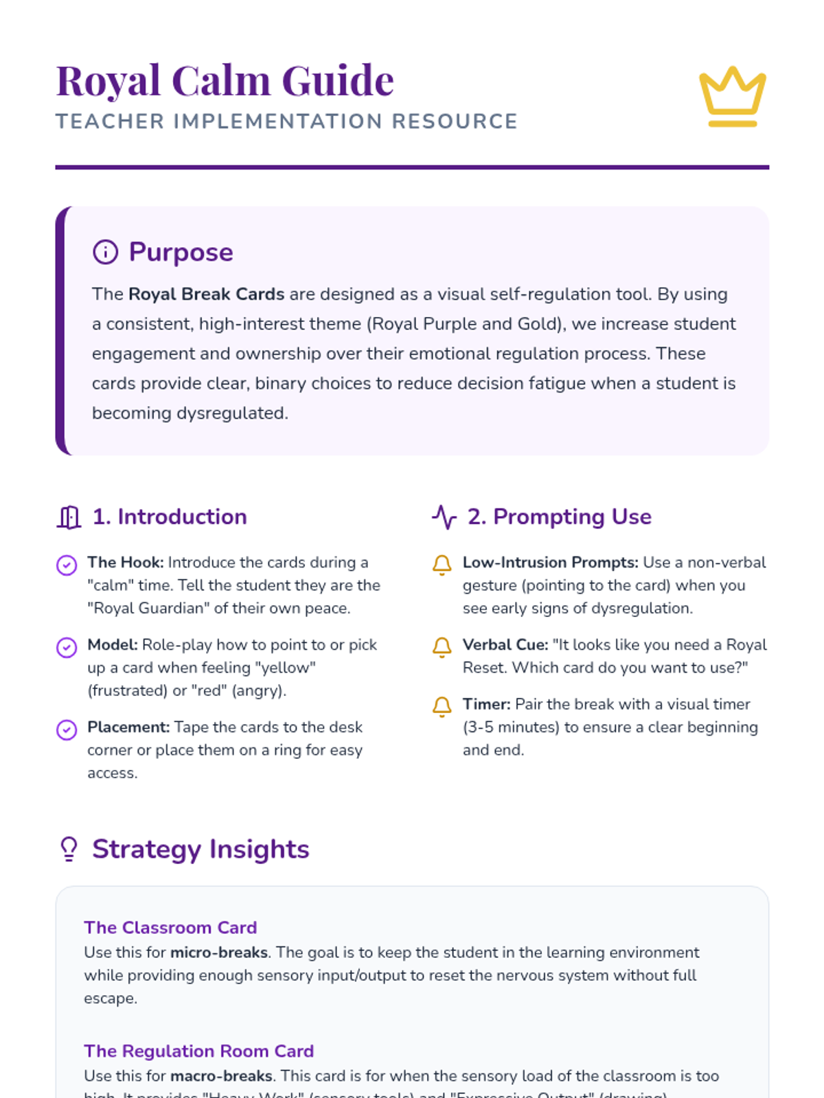 A specialized set of resources designed to help students self-regulate using 'Royal Break Cards'. This lesson includes the visual aids themselves along with a guide for educators to implement these tools effectively in both classroom and sensory environments.