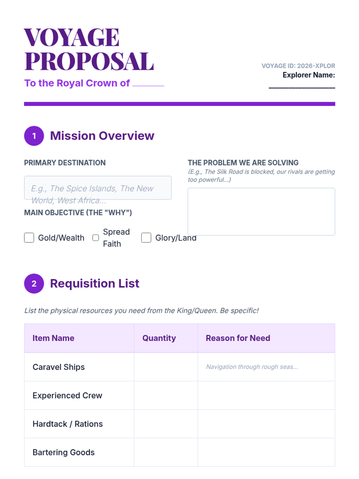 Students take on the role of explorers pitching their voyages to European monarchs, focusing on financial literacy, ROI, and persuasive speaking.