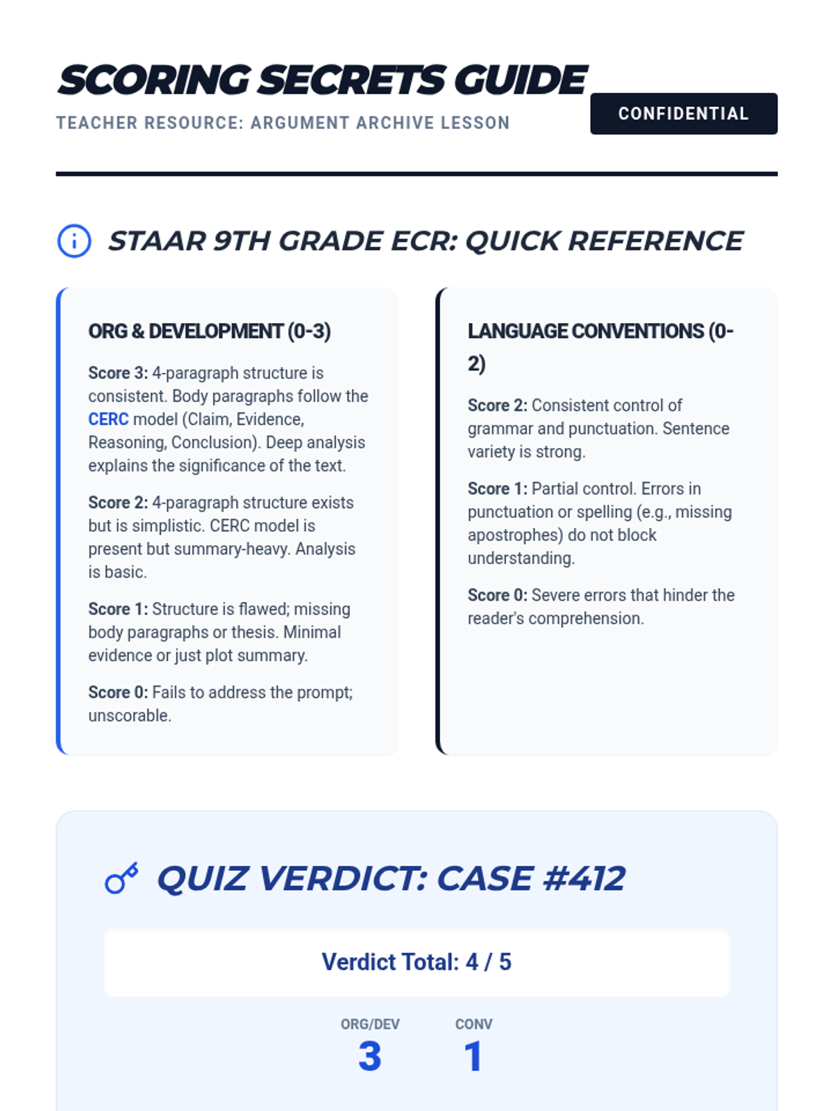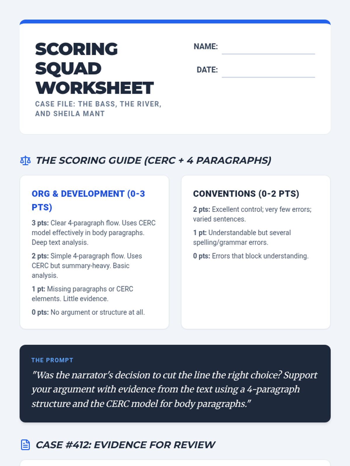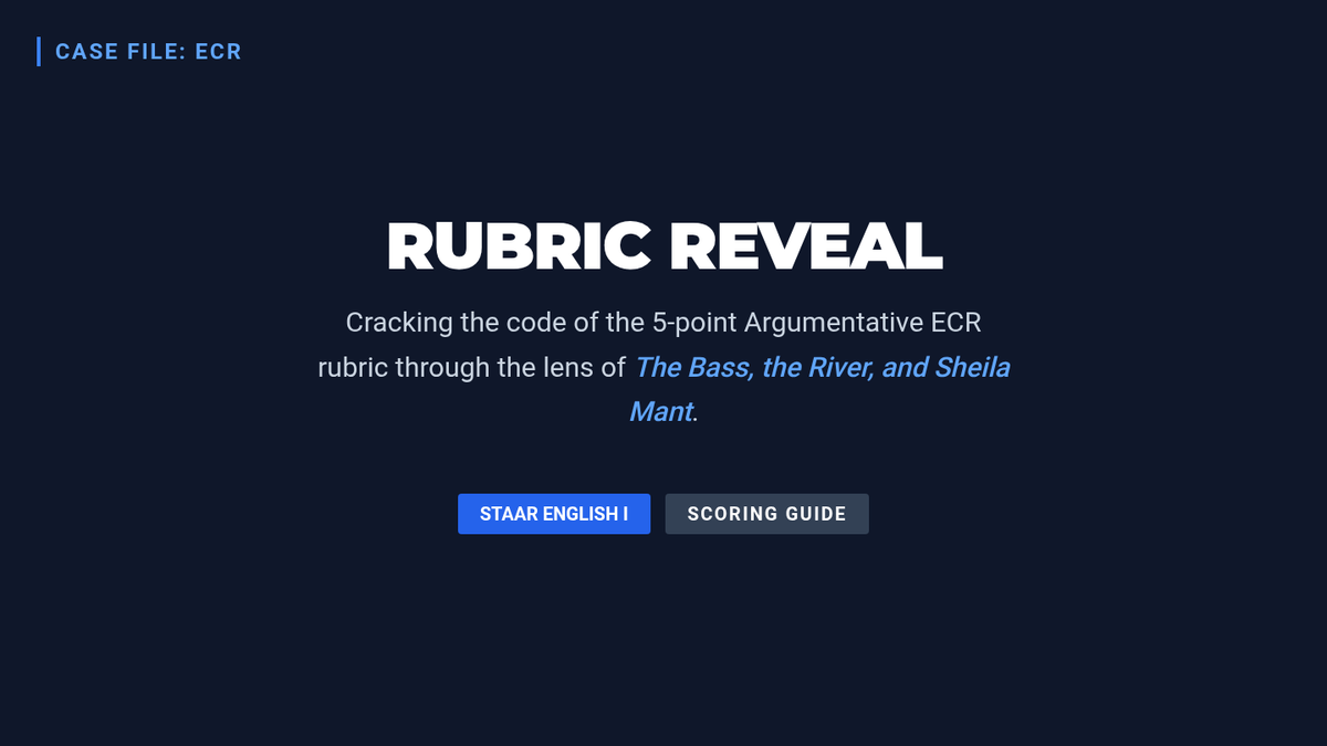 This lesson breaks down the 5-point STAAR English I Argumentative ECR rubric using 'The Bass, the River, and Sheila Mant' as a central text. Students analyze graded examples and practice scoring a new essay to master the criteria for evidence, organization, and conventions.