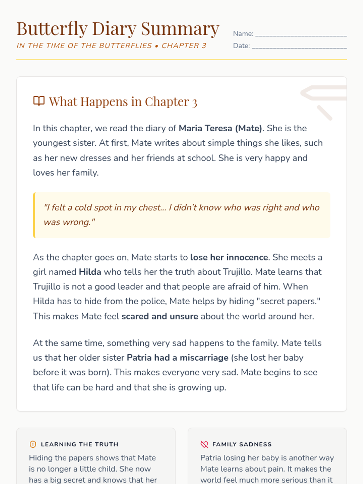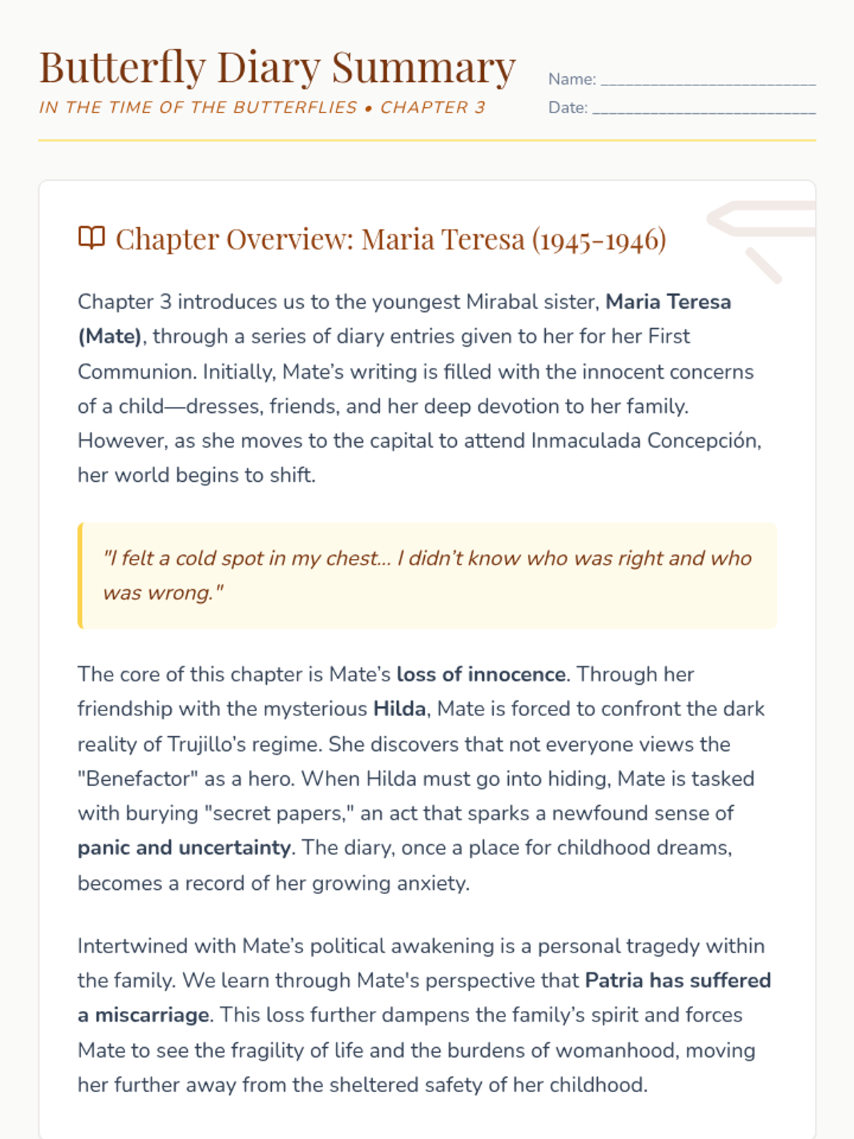 A focused study of Chapter 3 of Julia Alvarez's 'In the Time of the Butterflies', focusing on Maria Teresa's loss of innocence and her first glimpses into the political reality of Trujillo's Dominican Republic.