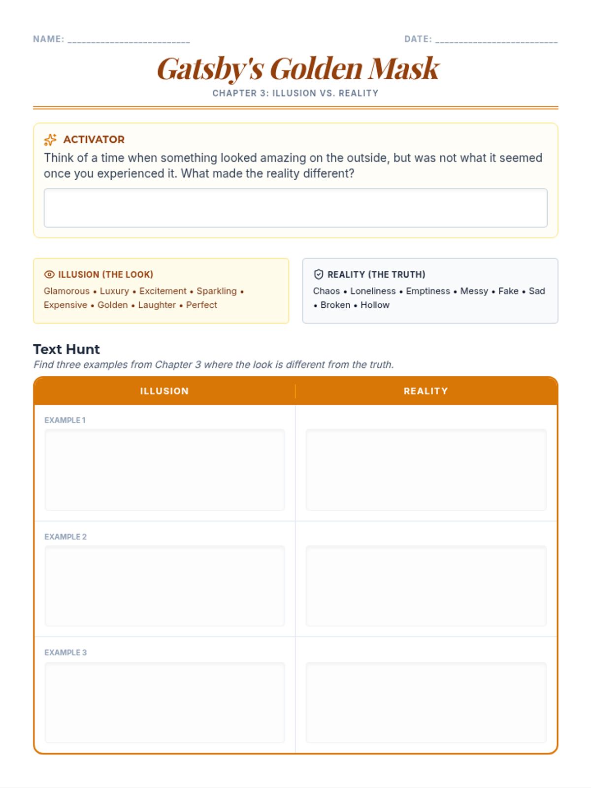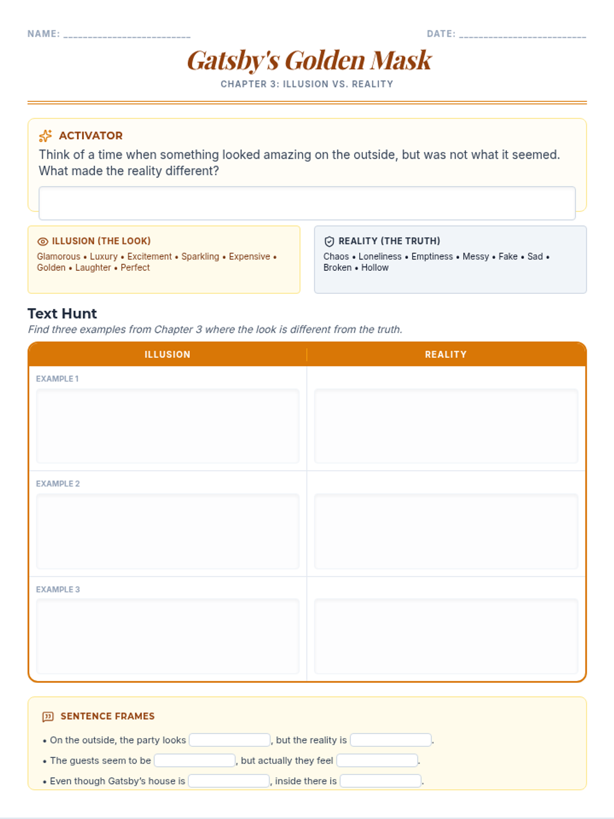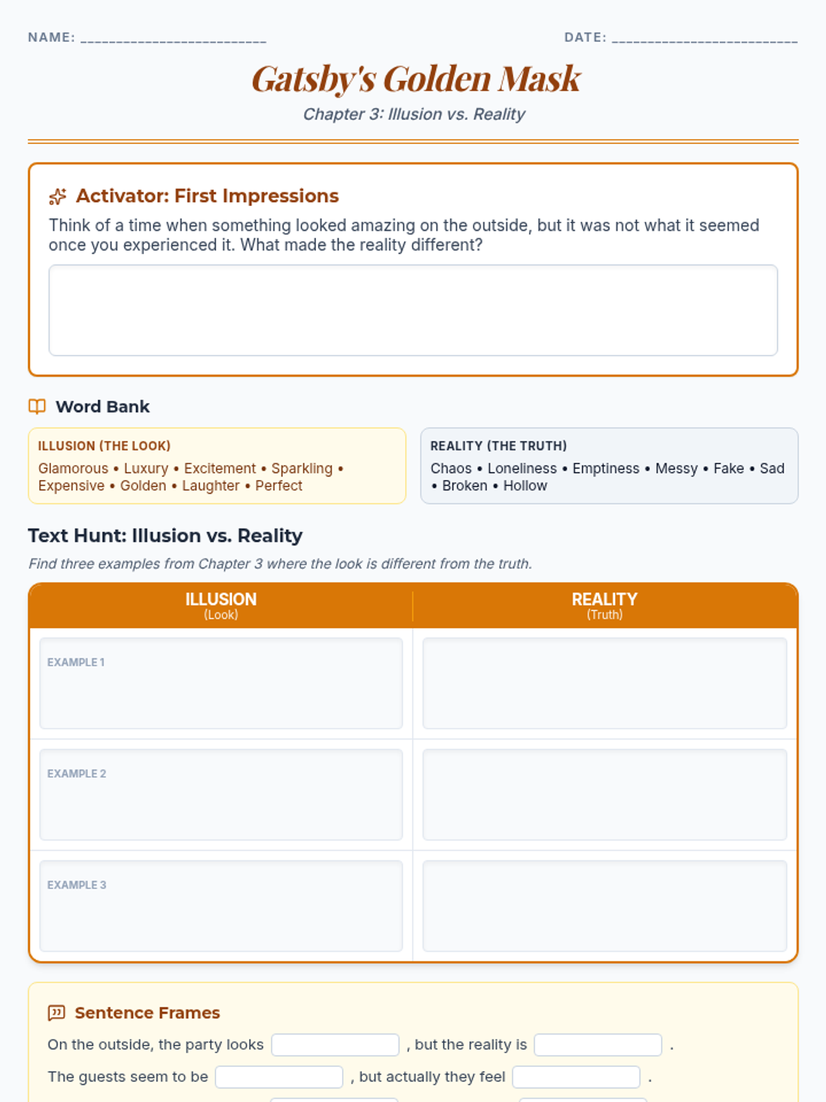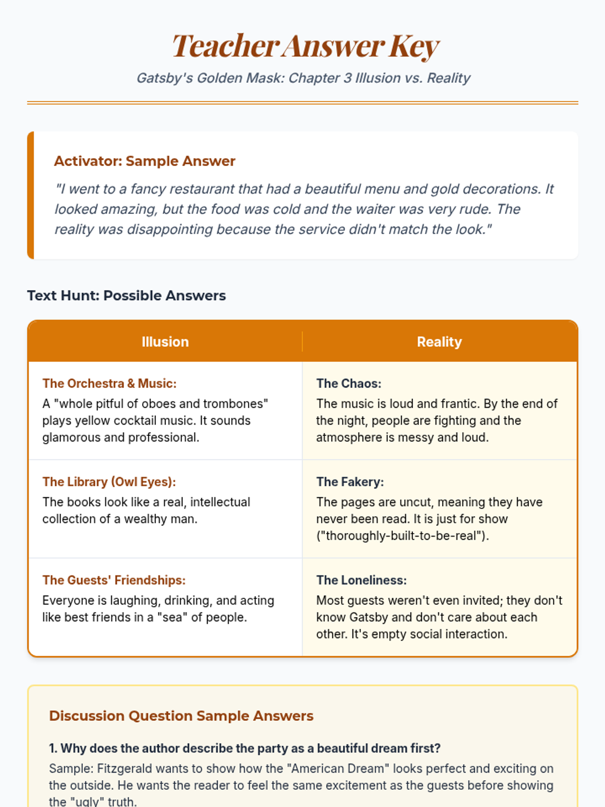 A lesson exploring the contrast between the glittering surface of Gatsby's parties and the underlying reality of the 1920s, designed for Level 2 English Language Learners.