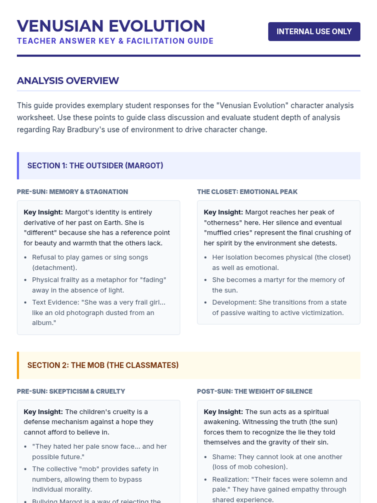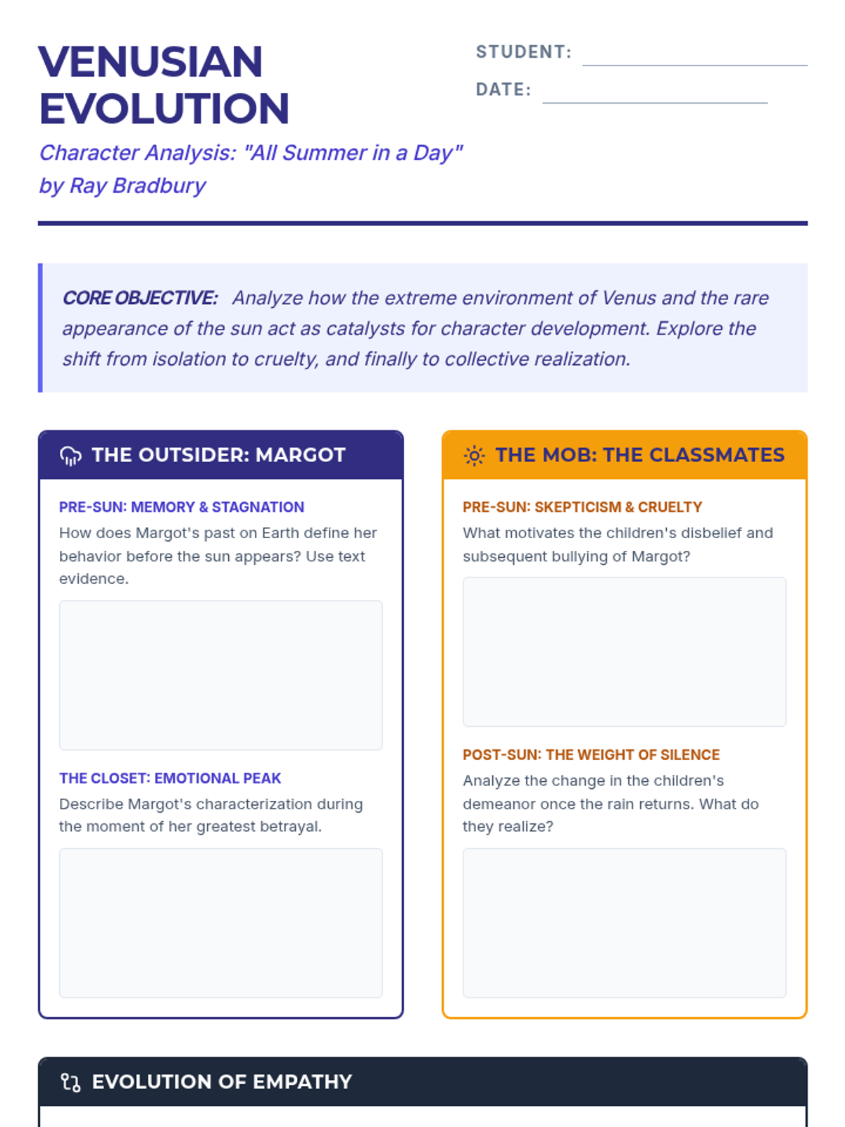 A high school ELA lesson focused on analyzing character development and the impact of setting in Ray Bradbury's 'All Summer in a Day'. Students examine Margot's isolation and the classmates' collective shift from cruelty to realization.