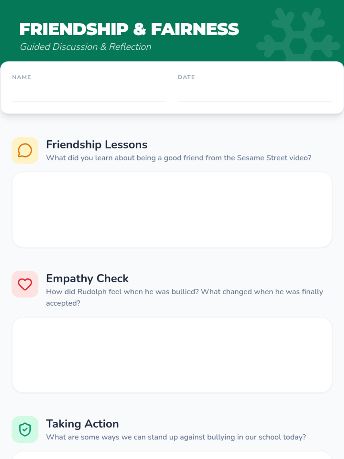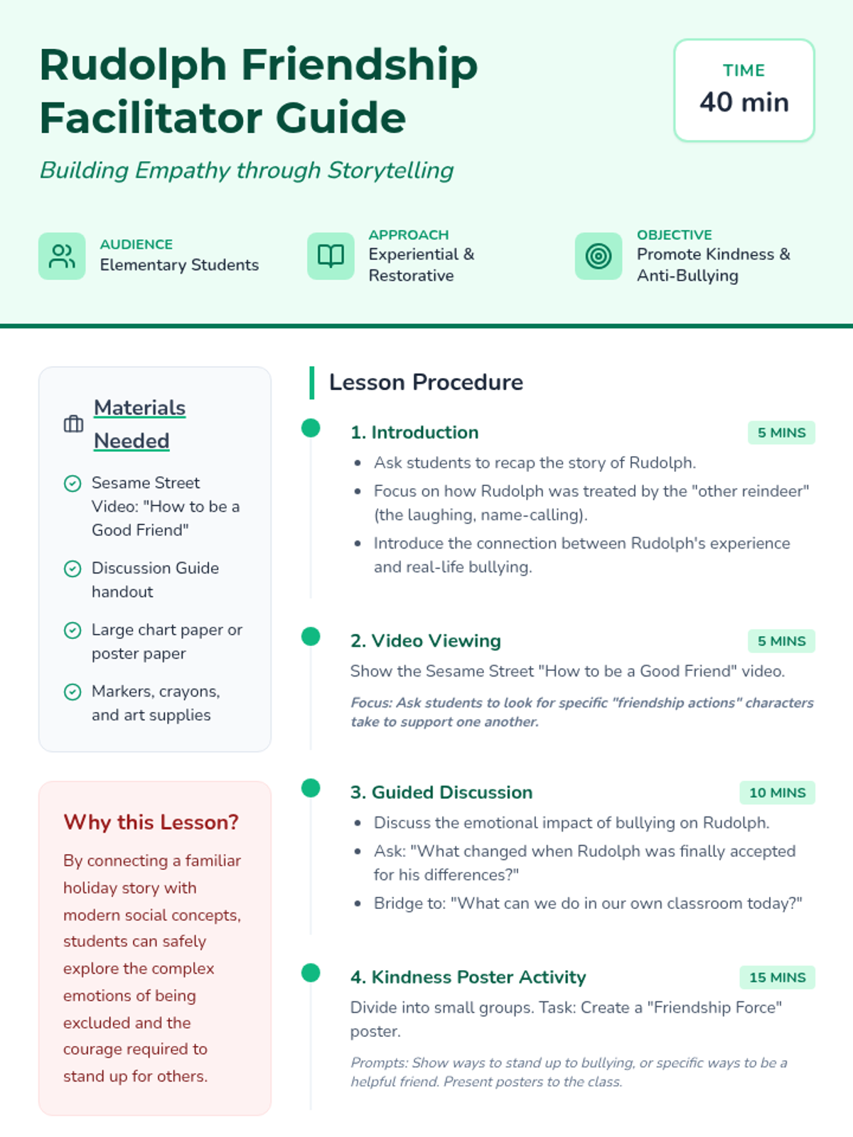 A social-emotional learning lesson using the story of Rudolph the Red-Nosed Reindeer to explore themes of friendship, empathy, and standing up to bullying. students participate in discussions and a creative poster activity to reinforce positive peer interactions.