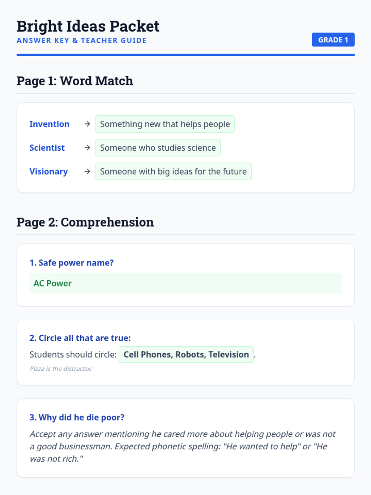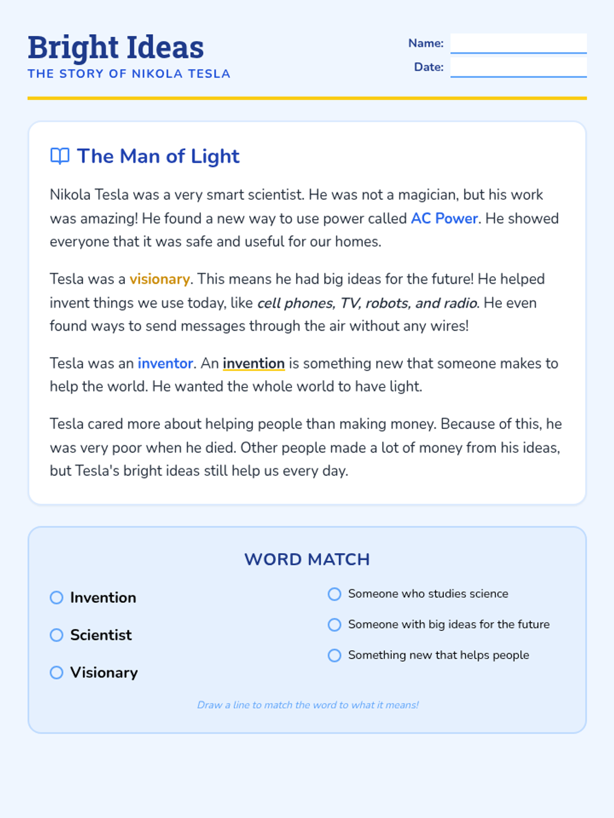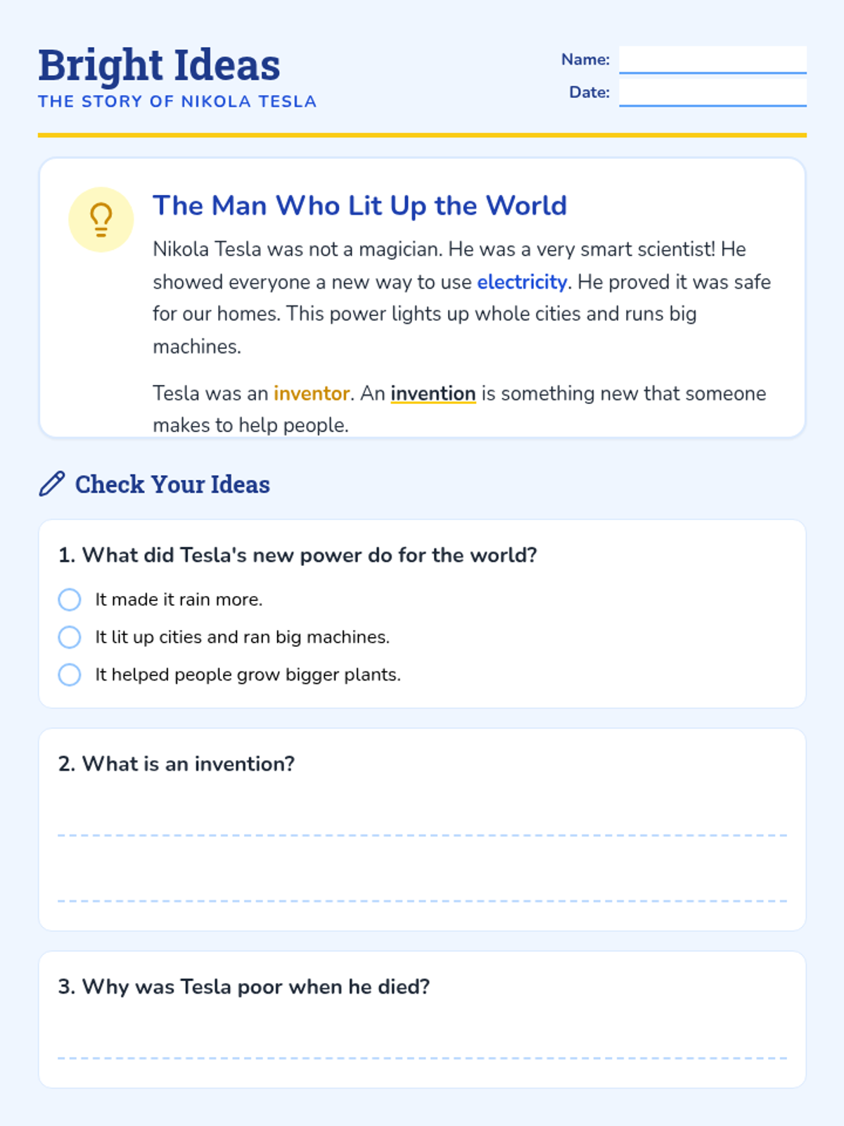 A lesson introducing 1st graders to Nikola Tesla and the concept of inventions through a simplified reading passage.