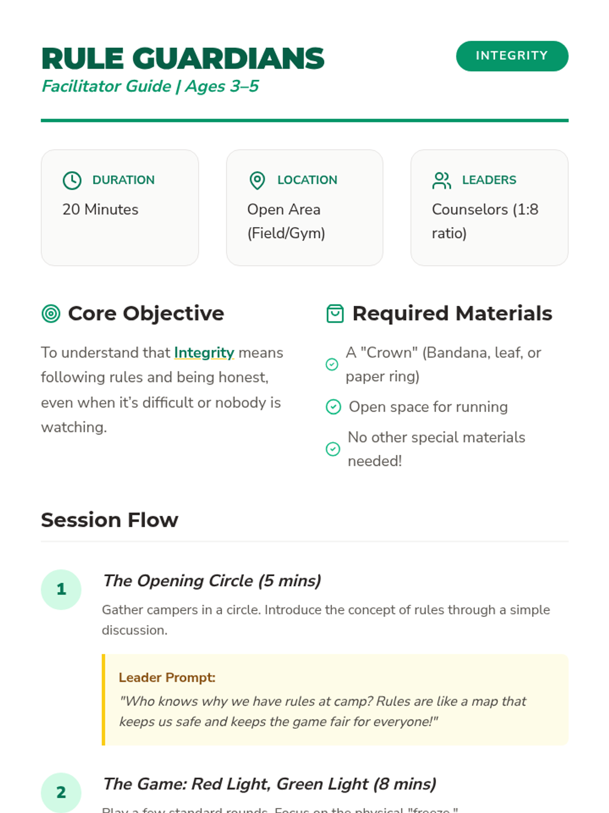 A 20-minute interactive session for children ages 3-5 that explores the value of integrity through a guided game and the role of the 'Keeper of the Rules.' Counselors (leaders) guide campers through 'Red Light, Green Light' while rotating a special leadership role to emphasize the importance of following rules even when it's hard.