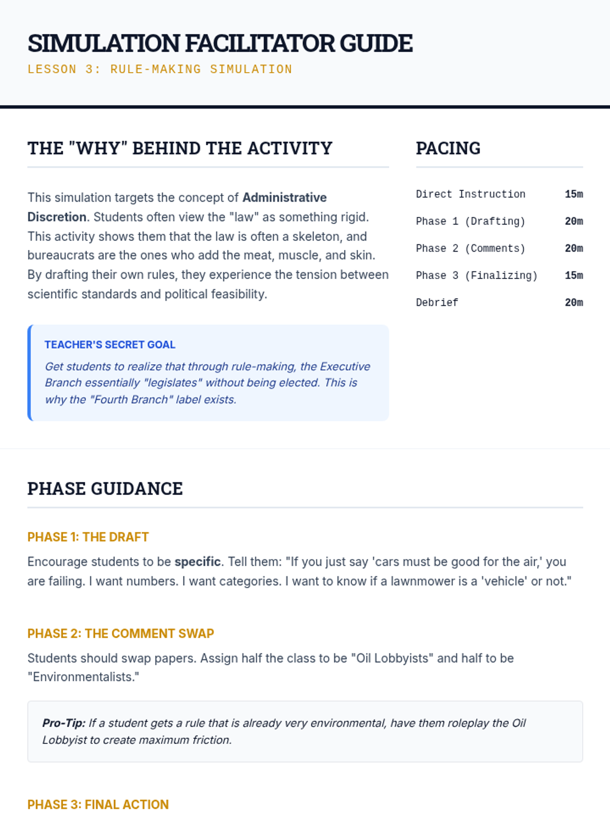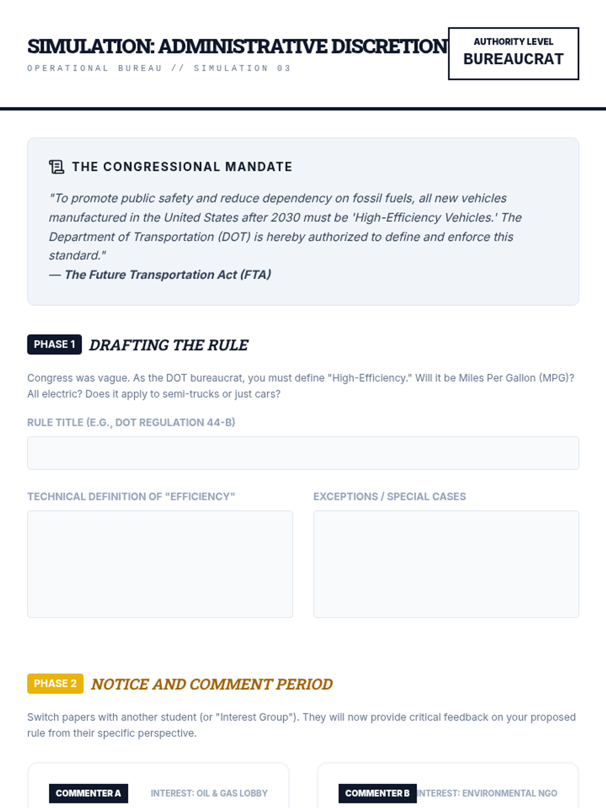 A hands-on simulation where students act as bureaucrats to interpret vague legislation and draft administrative rules, experiencing bureaucratic discretion firsthand.