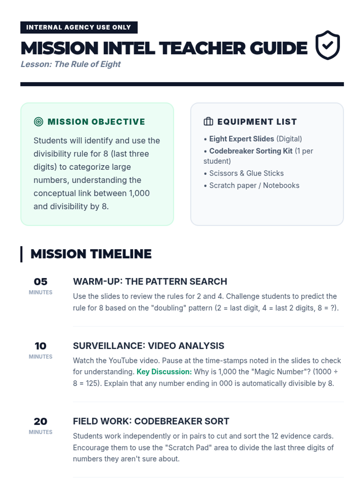 A lesson for 5th and 6th graders to master the divisibility rule for 8, exploring the conceptual link between 2, 4, and 8 and the significance of the number 1,000.