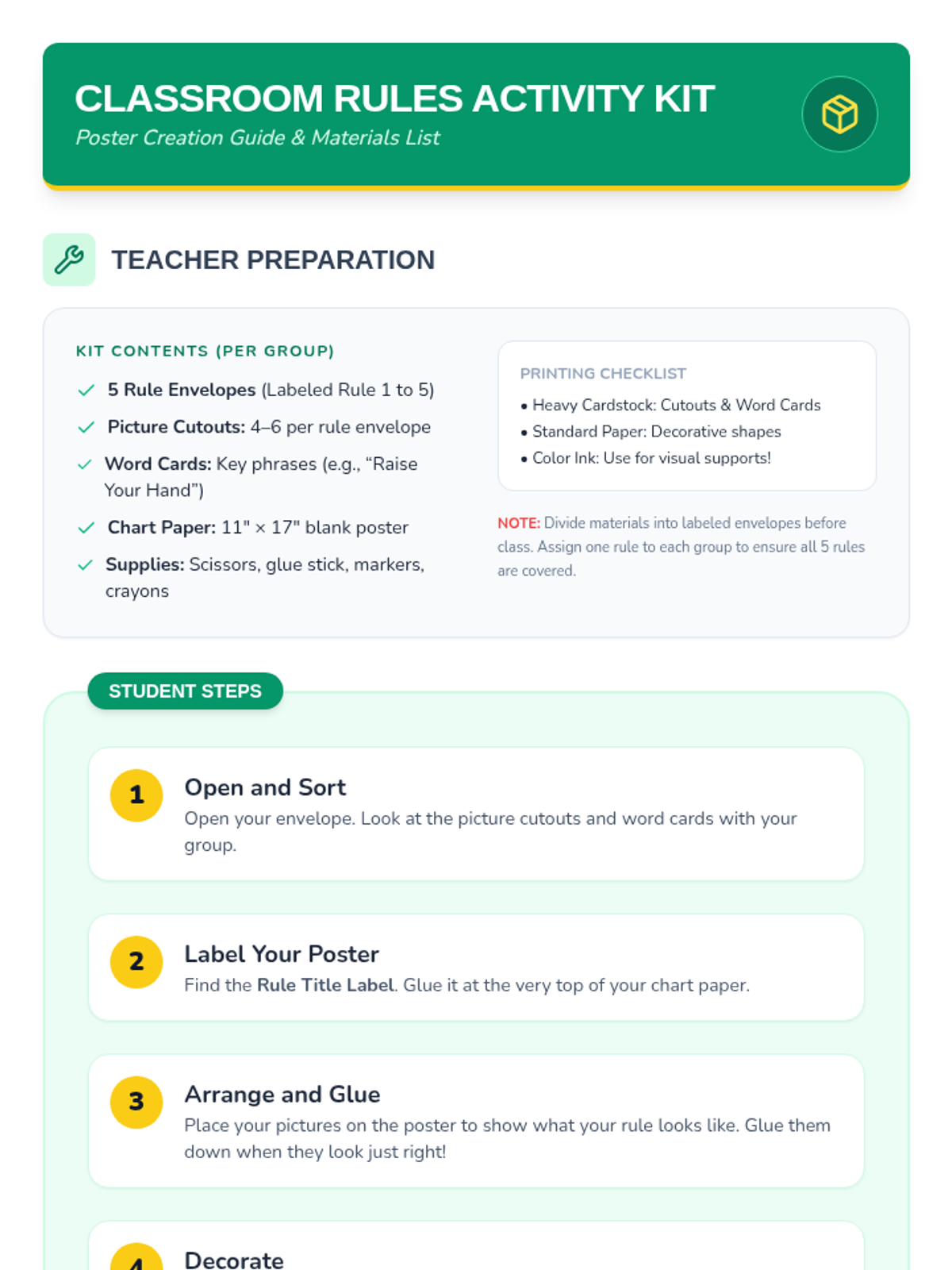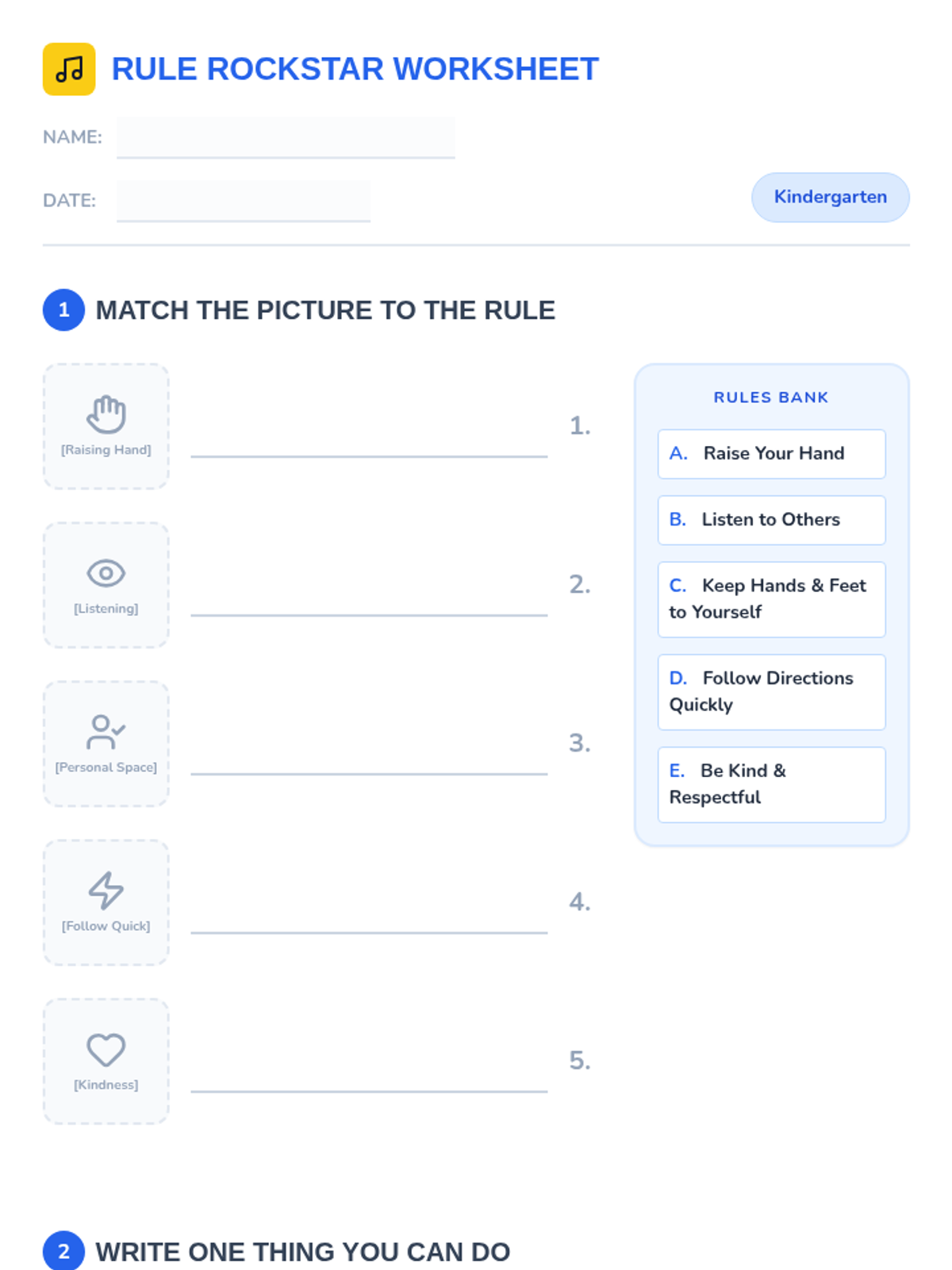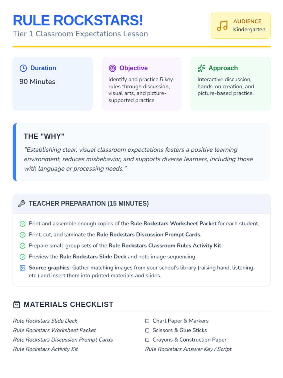 A fun, interactive 90-minute Tier 1 lesson designed for Kindergarten students to learn and practice five key classroom expectations through discussions, poster creation, and guided worksheets.