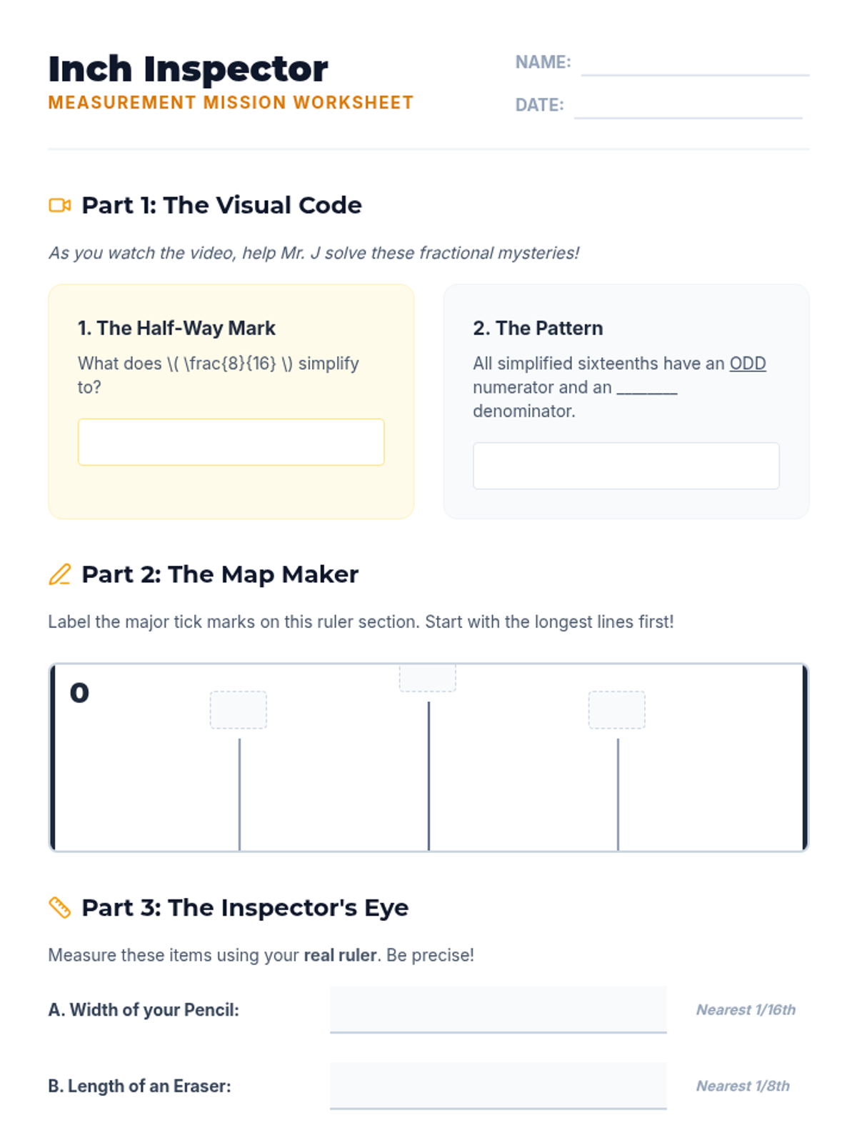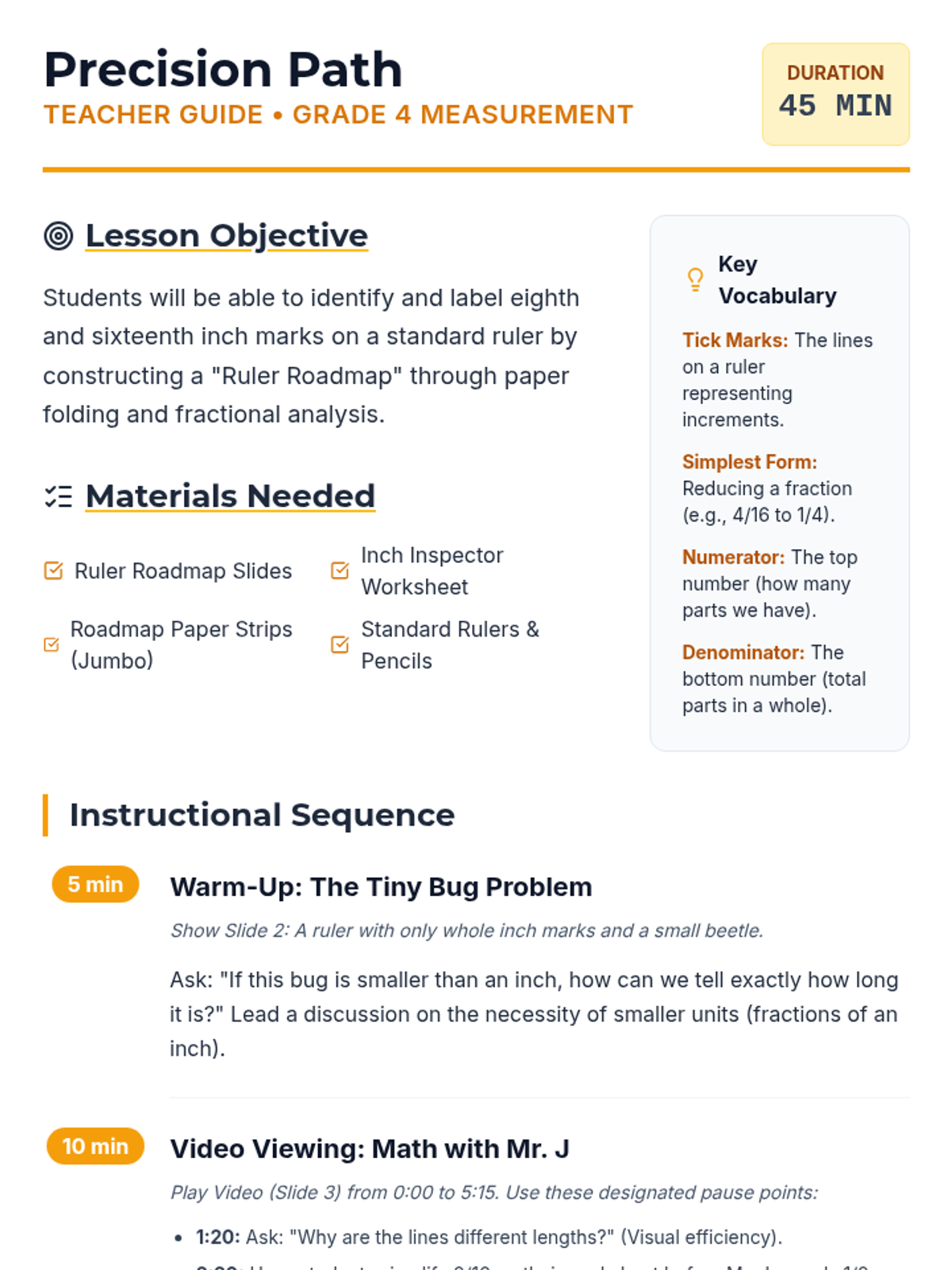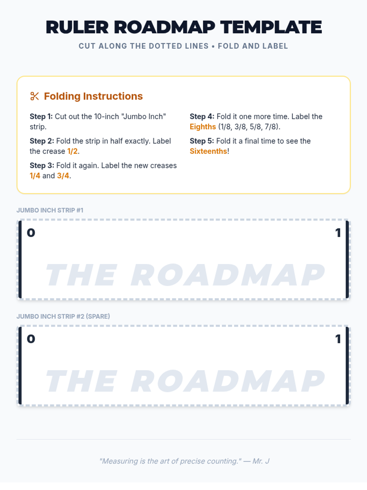 A hands-on lesson for 4th graders to master reading a ruler to the nearest 1/8th and 1/16th of an inch using the 'Ruler Roadmap' folding activity.
