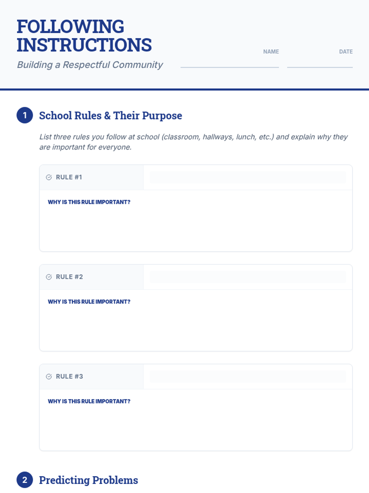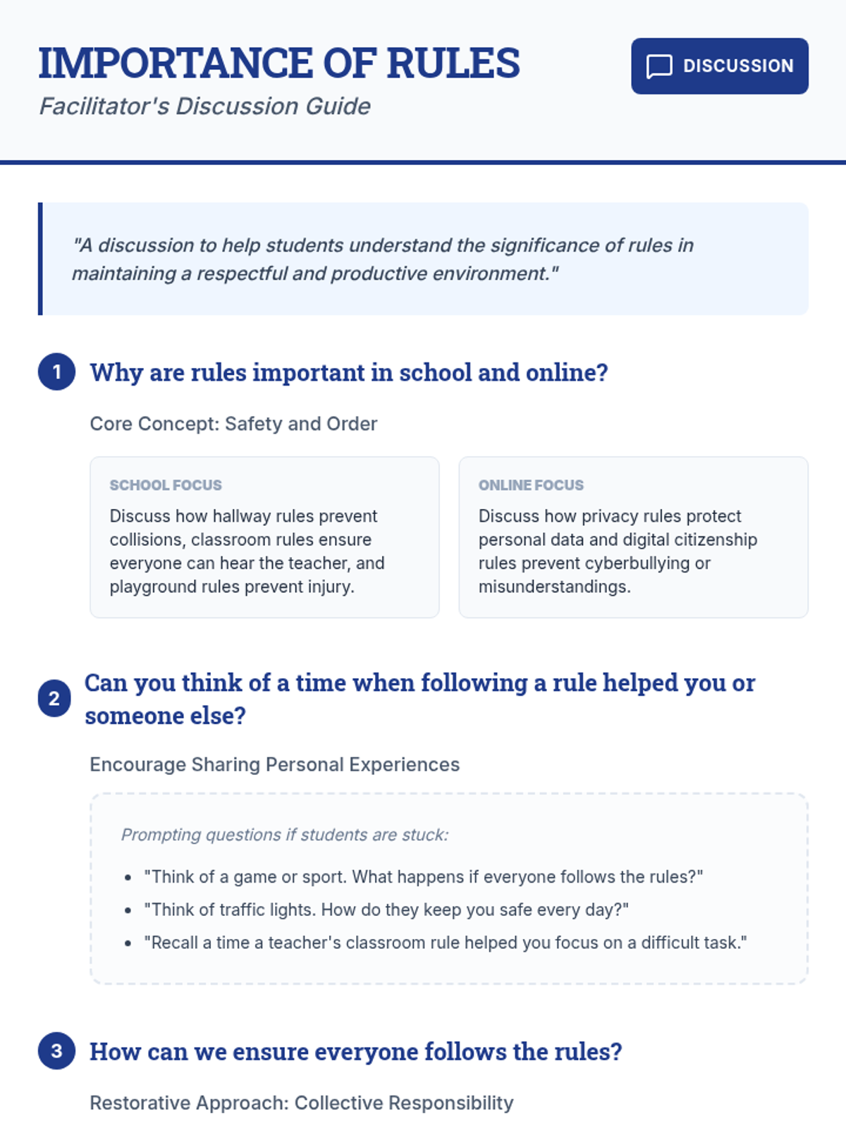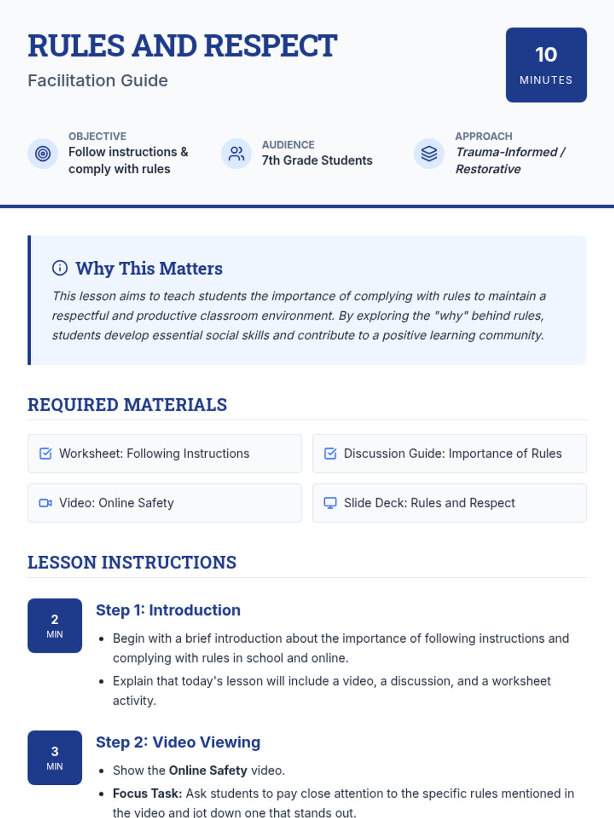 A 7th-grade lesson focused on the importance of following instructions and classroom rules using trauma-informed and restorative practices. Students explore the 'why' behind rules to foster a respectful and productive learning community.