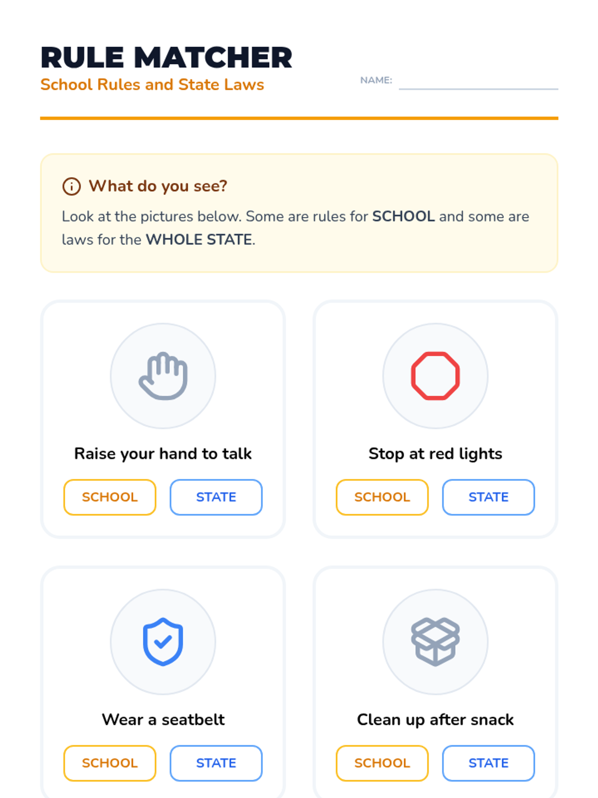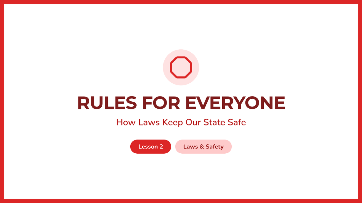 Students explore the concept of laws by comparing classroom rules to statewide rules, focusing on safety and common good.