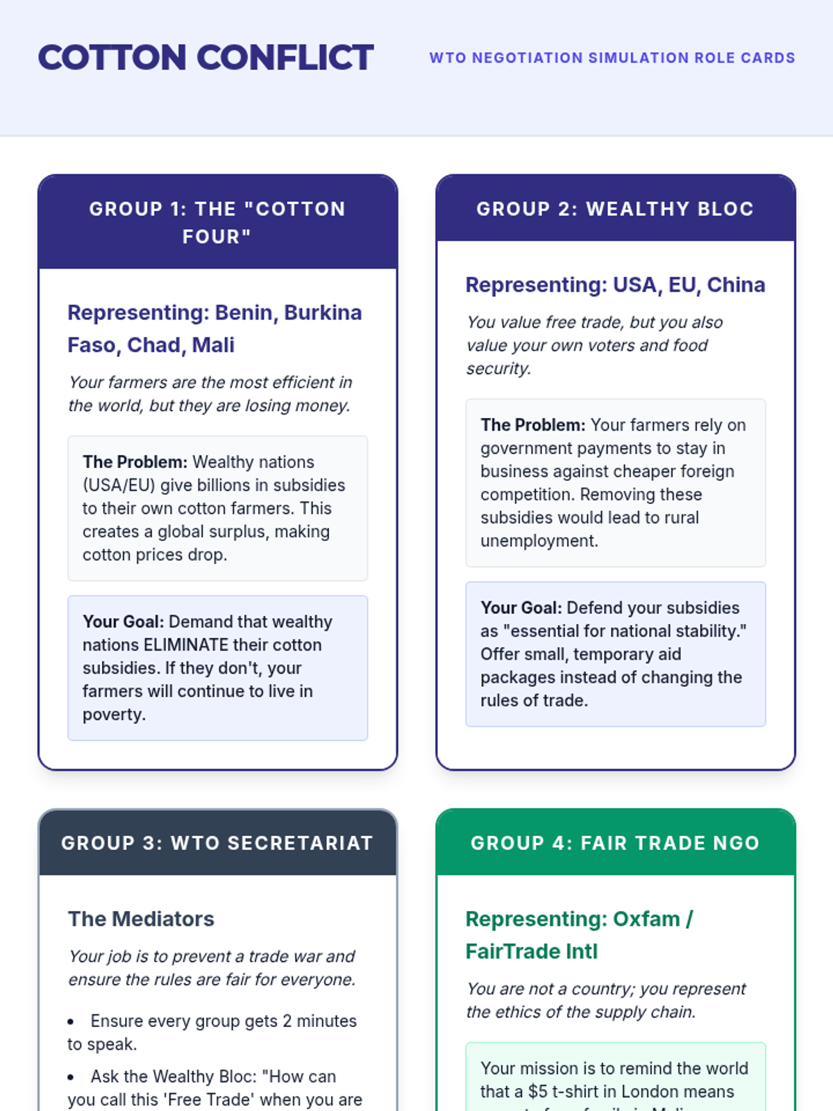 Examination of international trade policies, tariffs, and subsidies through a WTO negotiation simulation and a global supply chain analysis.