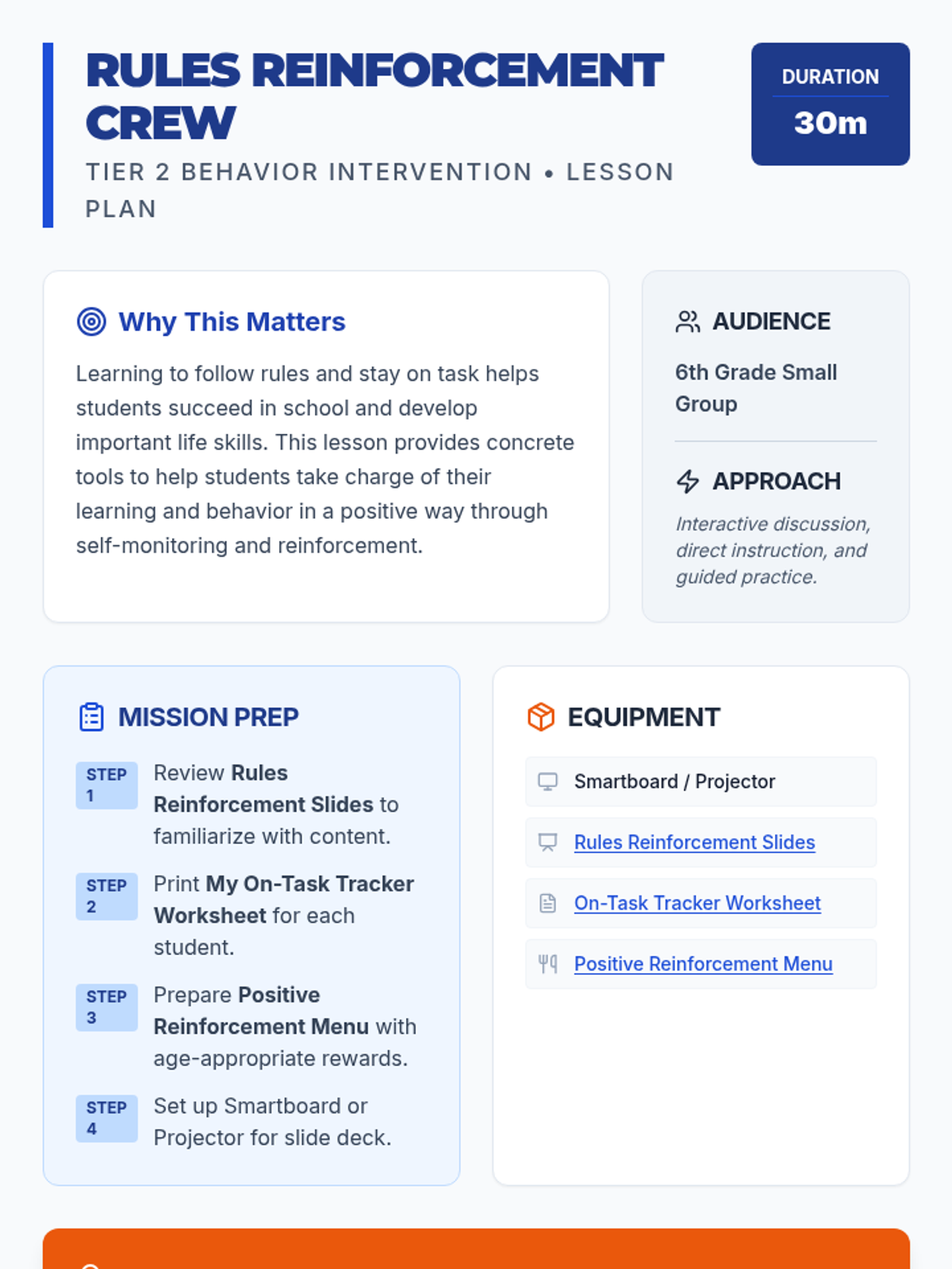 A 30-minute Tier 2 small group intervention for 6th graders focusing on self-monitoring, following directives, and positive reinforcement to improve classroom behavior and focus.