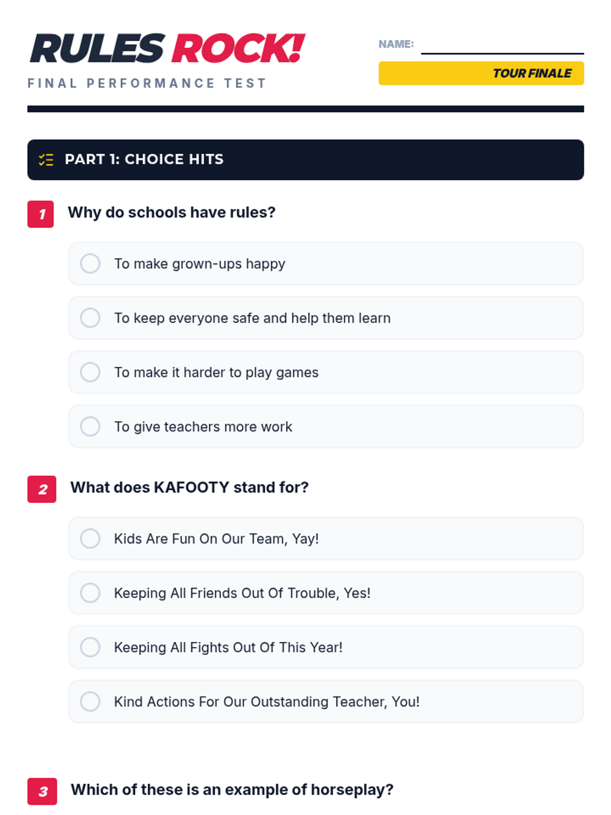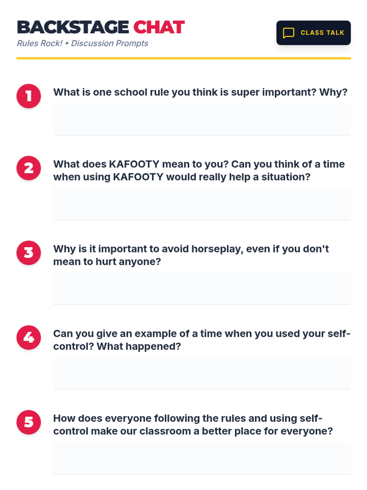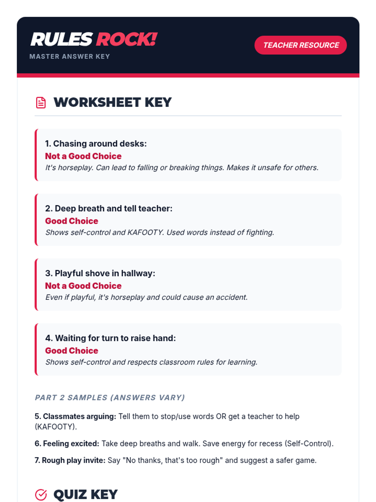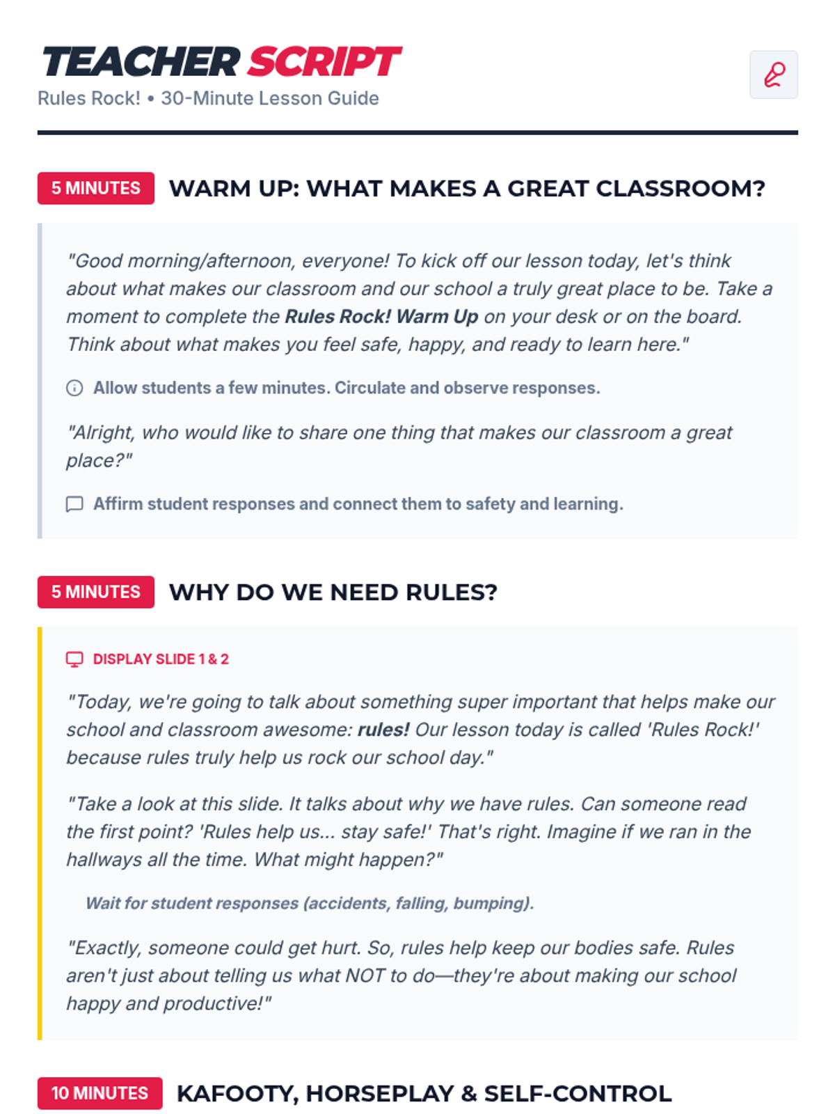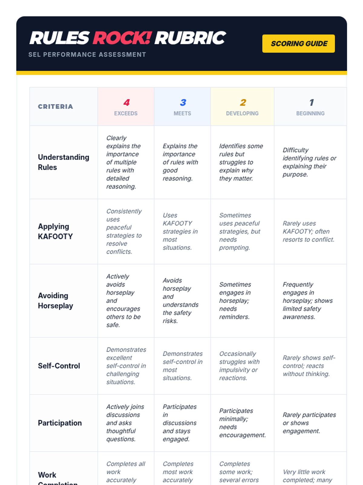 A 30-minute Tier 1 SEL lesson for 3rd graders on the importance of school rules, KAFOOTY, avoiding horseplay, and practicing self-control through a rock-and-roll themed approach.