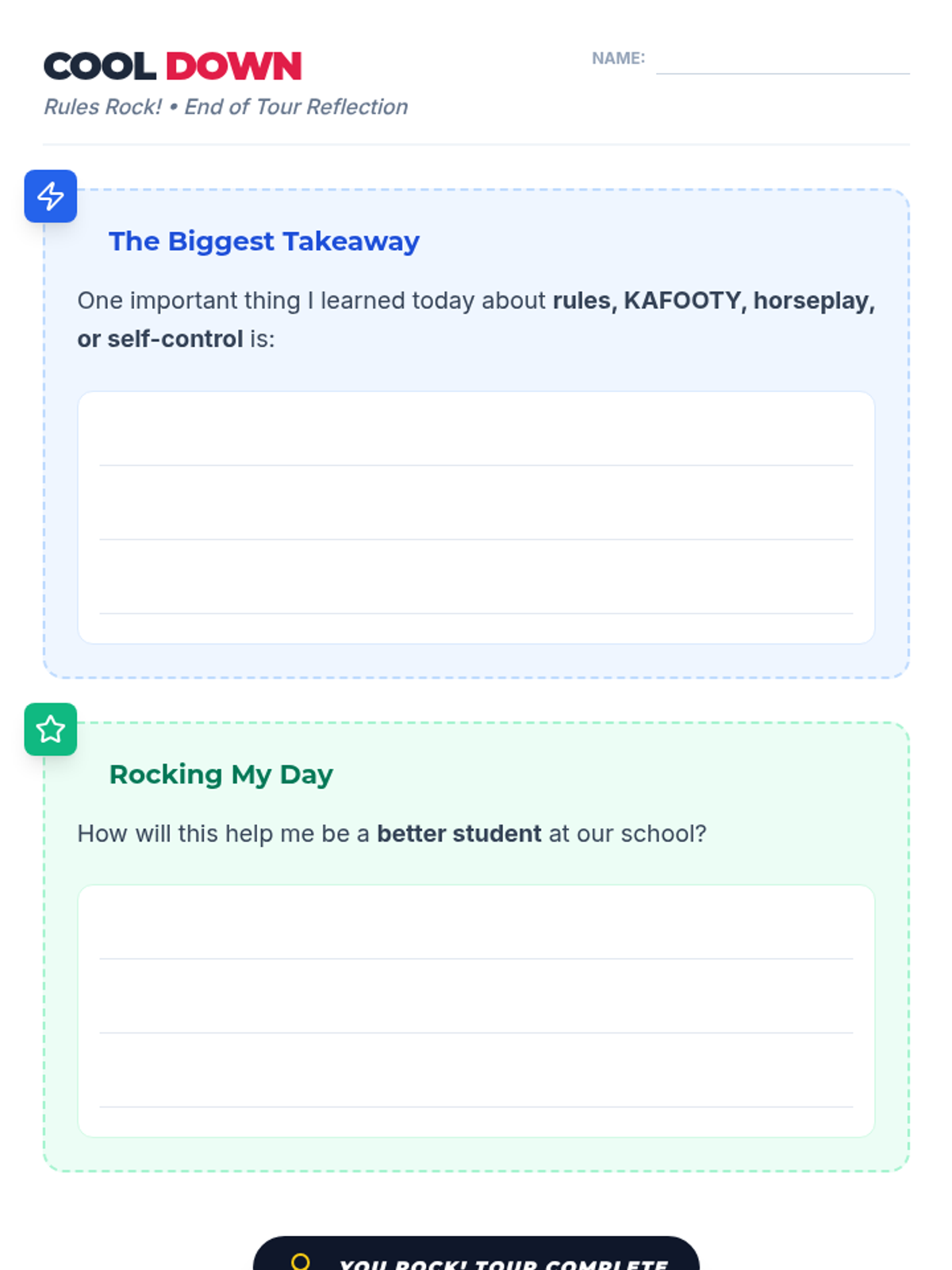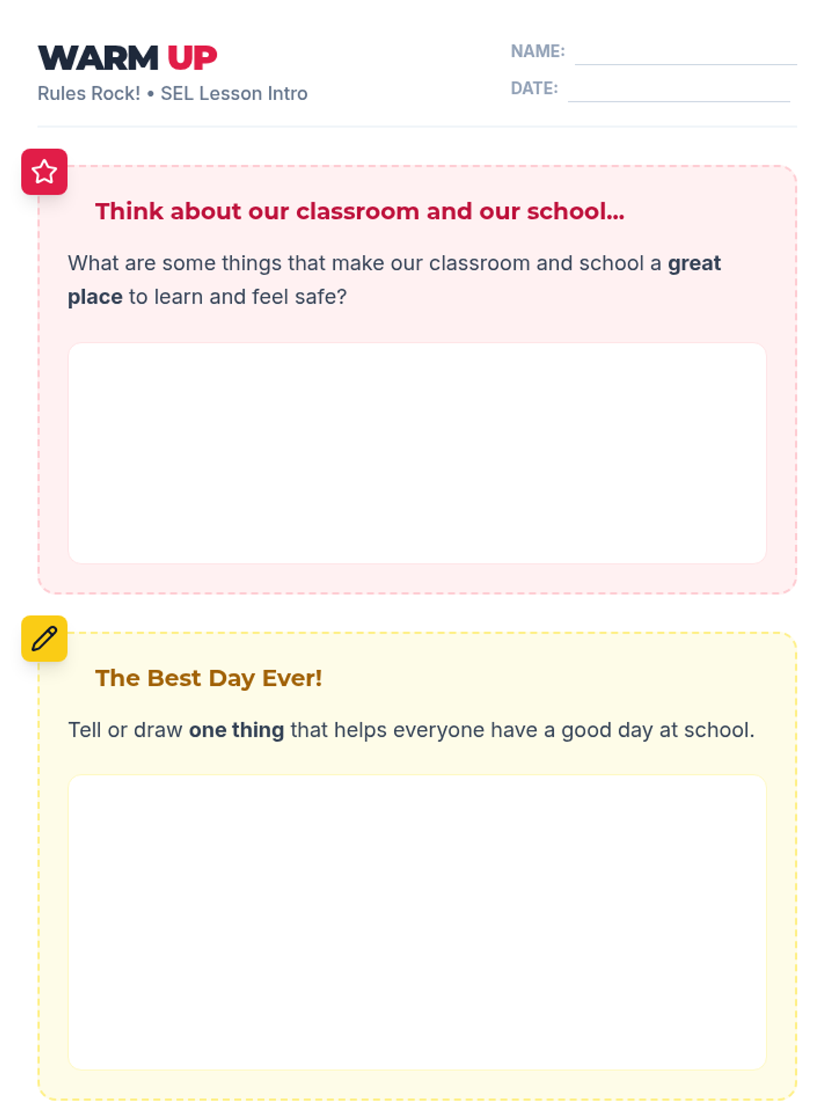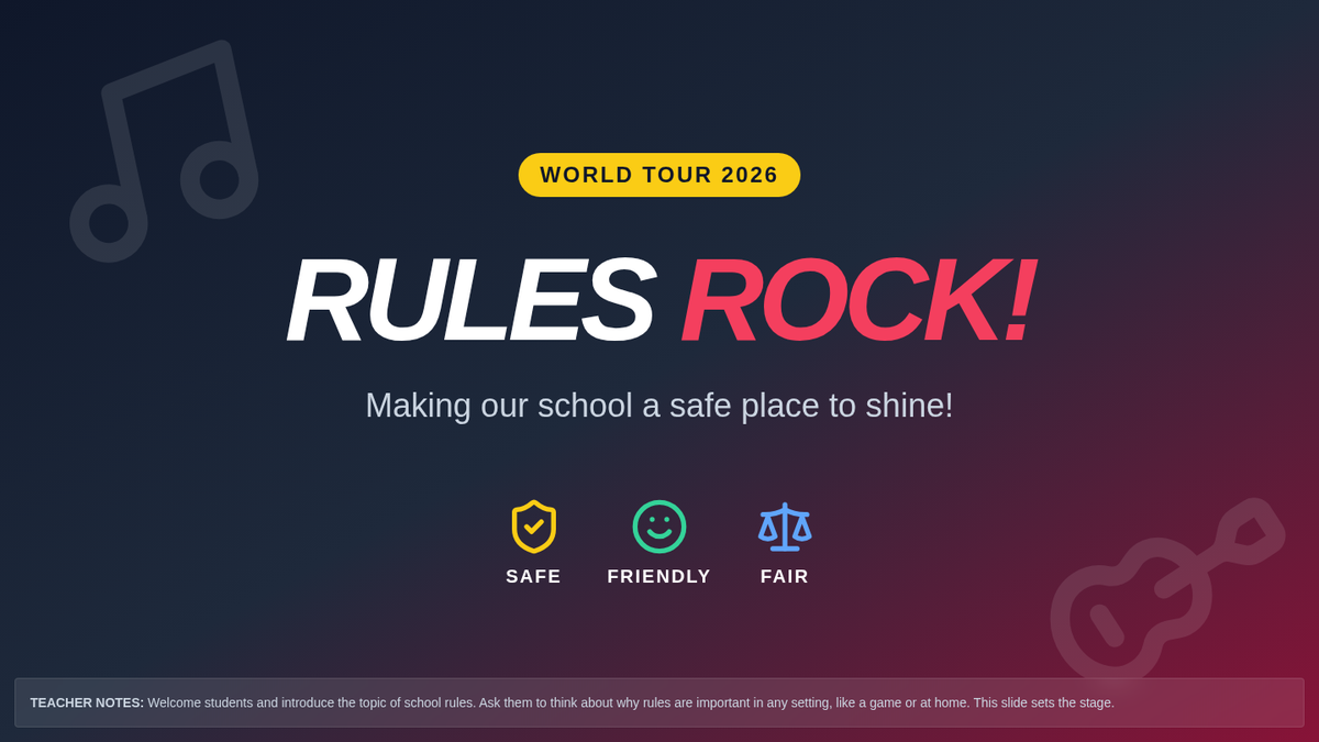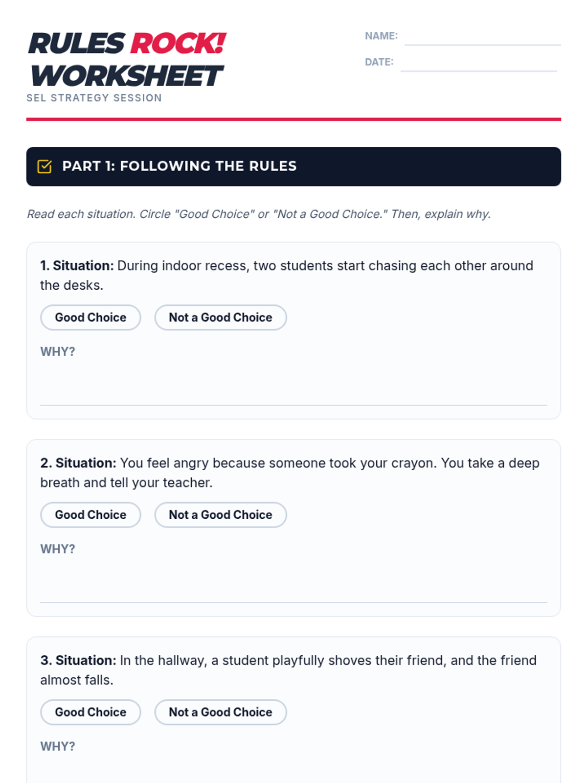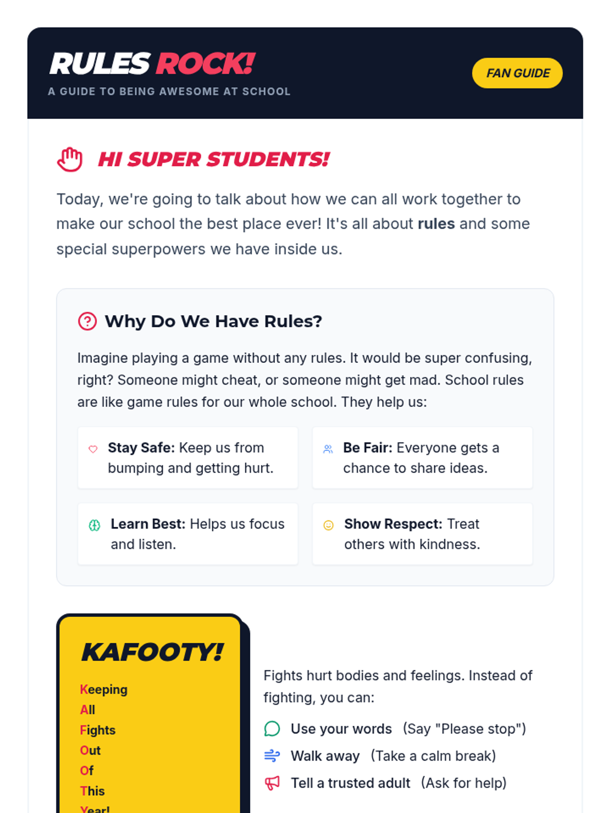 A 30-minute Tier 1 SEL lesson for 3rd graders on the importance of school rules, KAFOOTY, avoiding horseplay, and practicing self-control through a rock-and-roll themed approach.