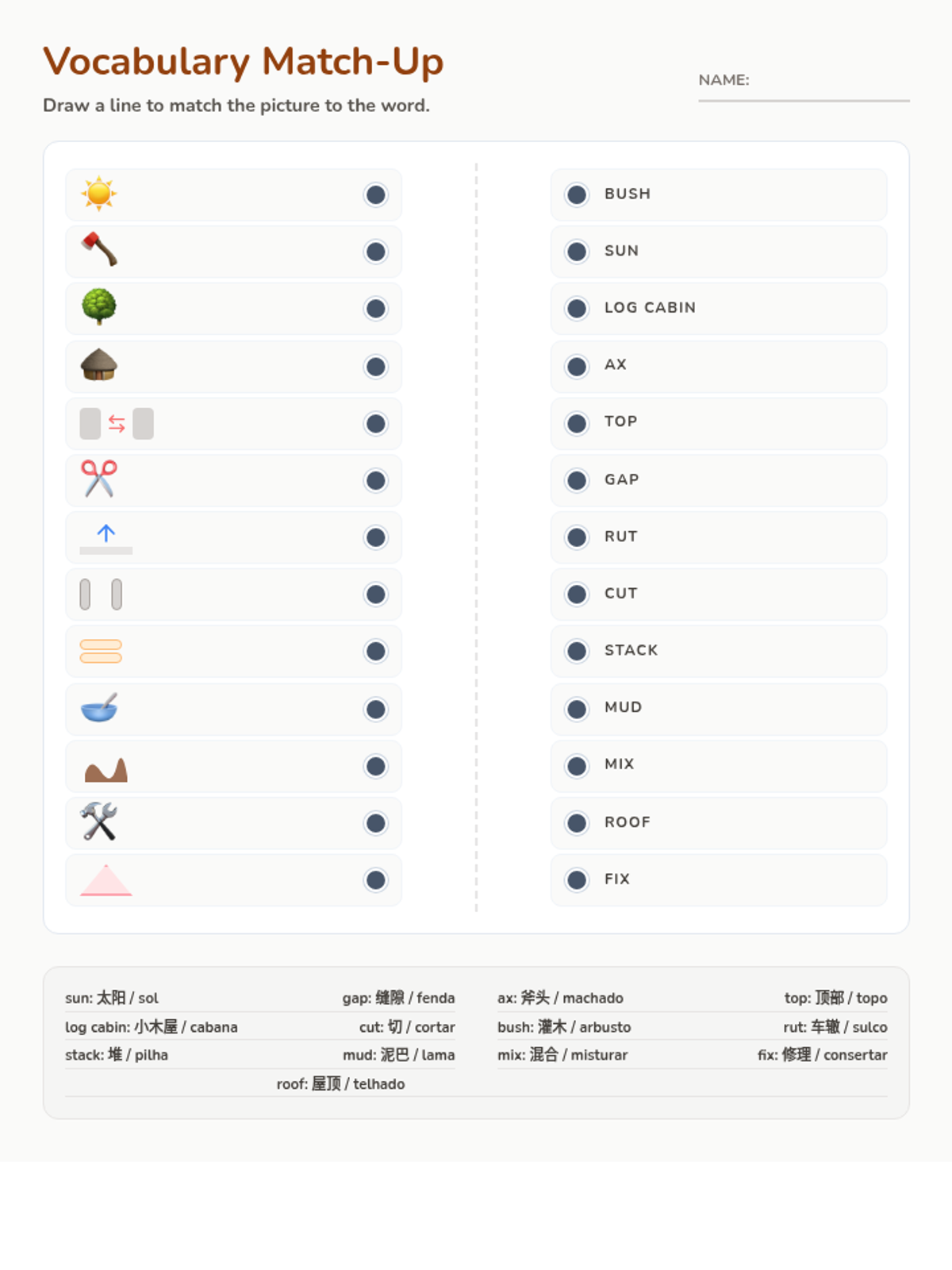 A collection of materials designed to help early readers master vocabulary words related to rustic life and nature, featuring bilingual support in English, Chinese, and Portuguese.