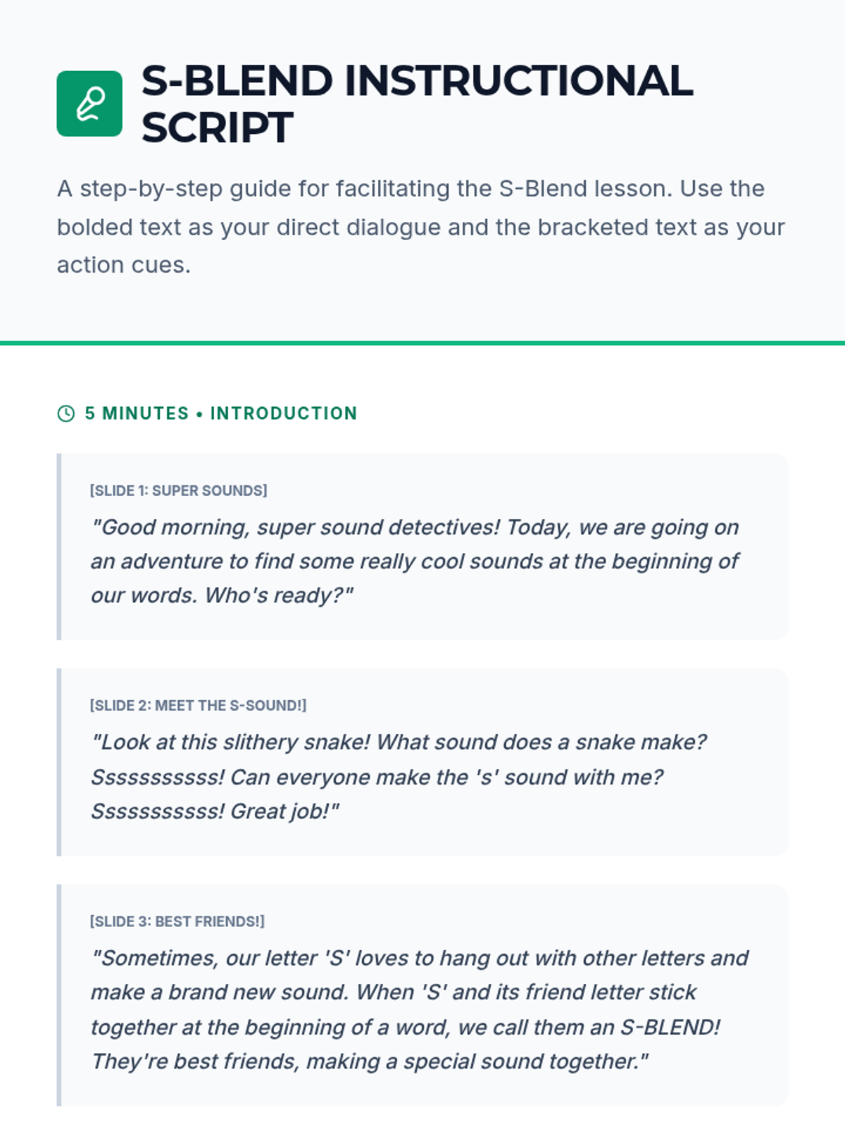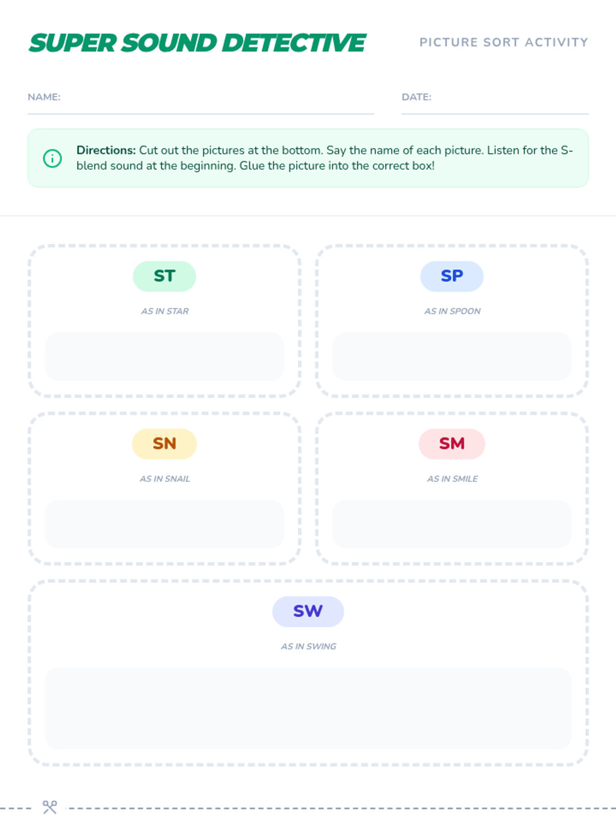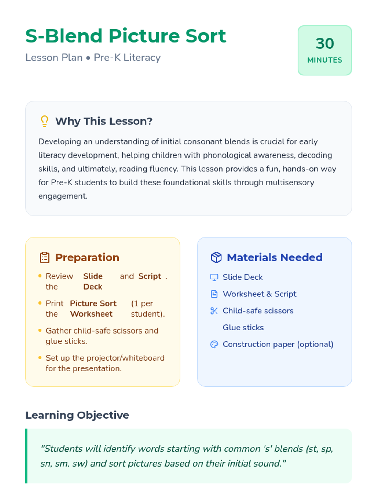 A fun, interactive lesson for Pre-K students to identify and sort words with 's' blends. This lesson helps early learners develop phonological awareness and early literacy skills through a 'Super Sound Detective' theme.