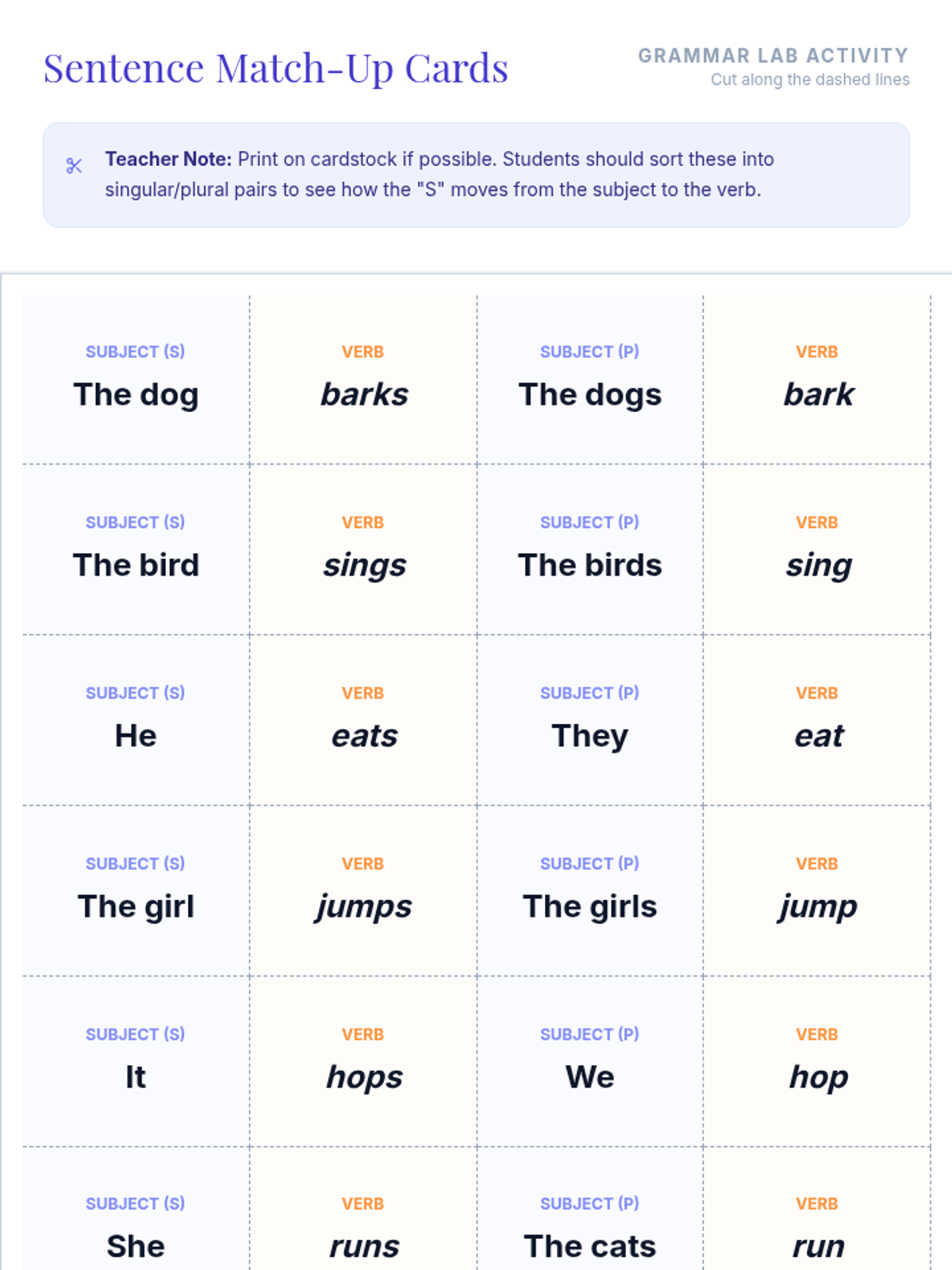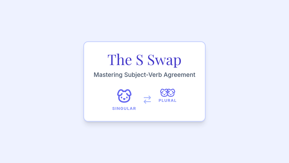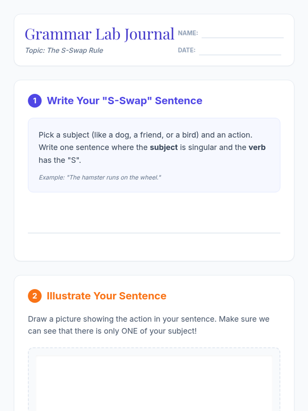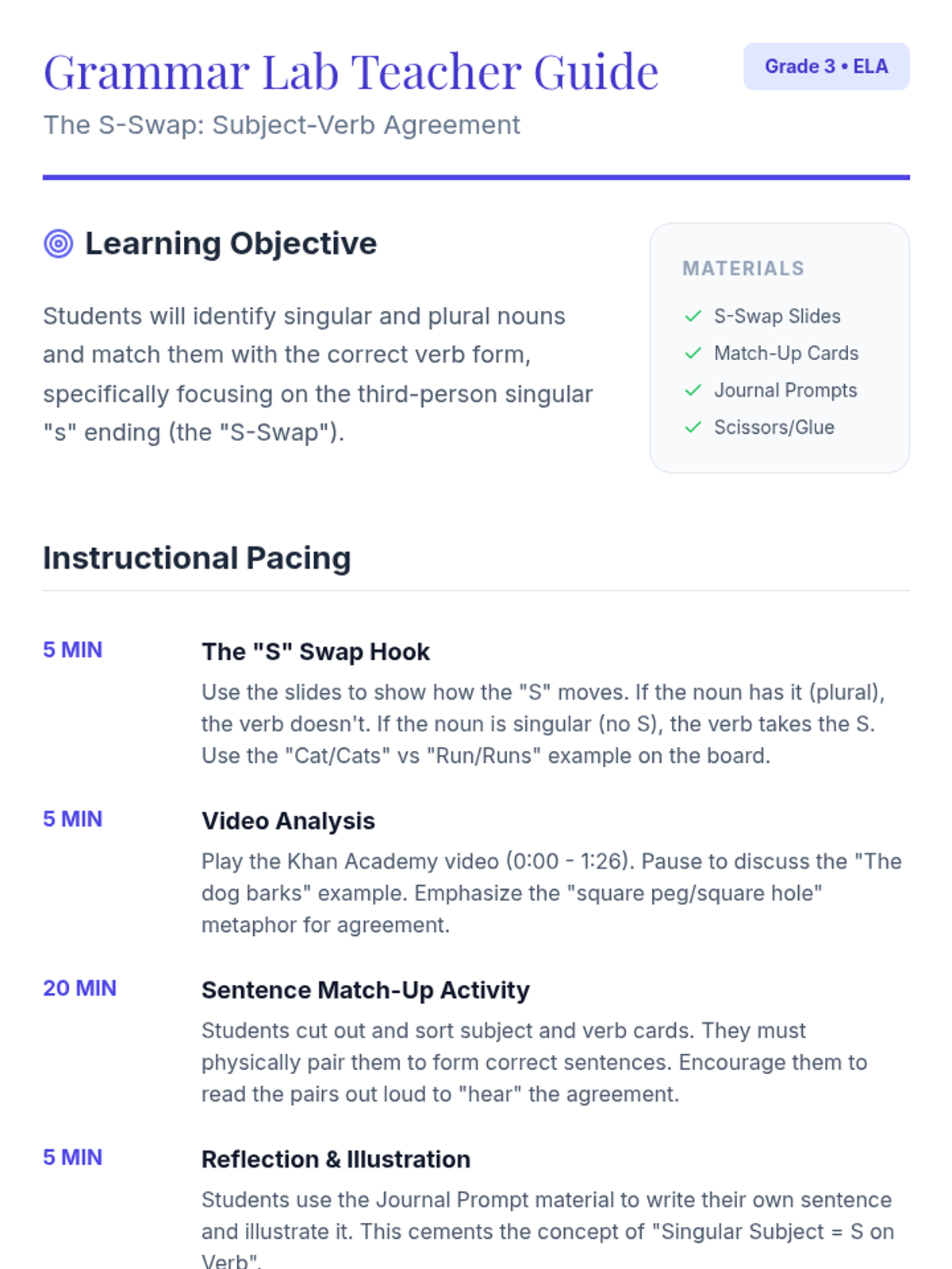A 3rd-grade grammar lesson on subject-verb agreement focusing on the 'S-Swap' rule where the 's' moves from noun to verb. Includes a hook, instructional video, a hands-on card-matching activity, and a reflection journal.
