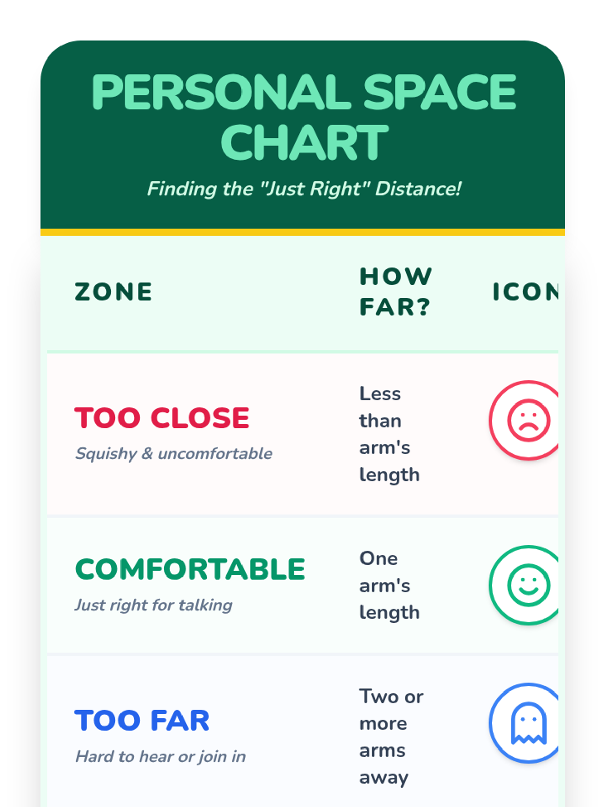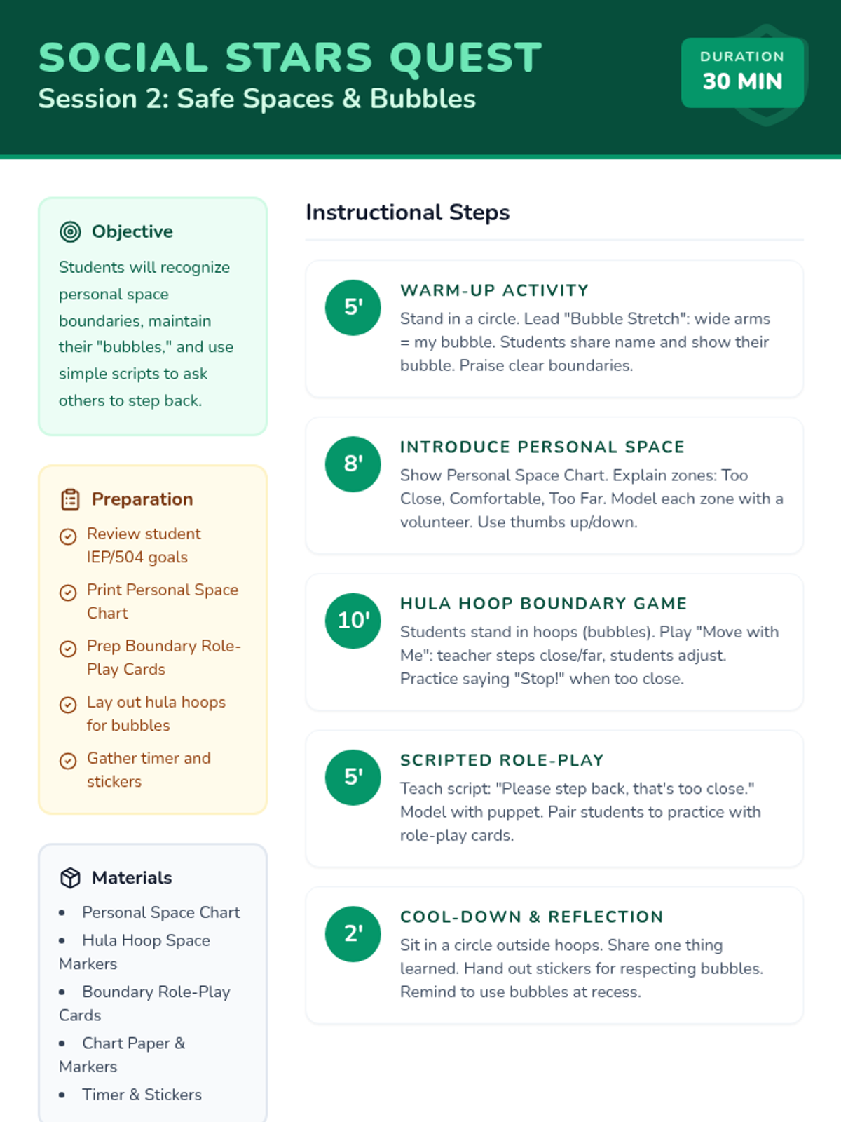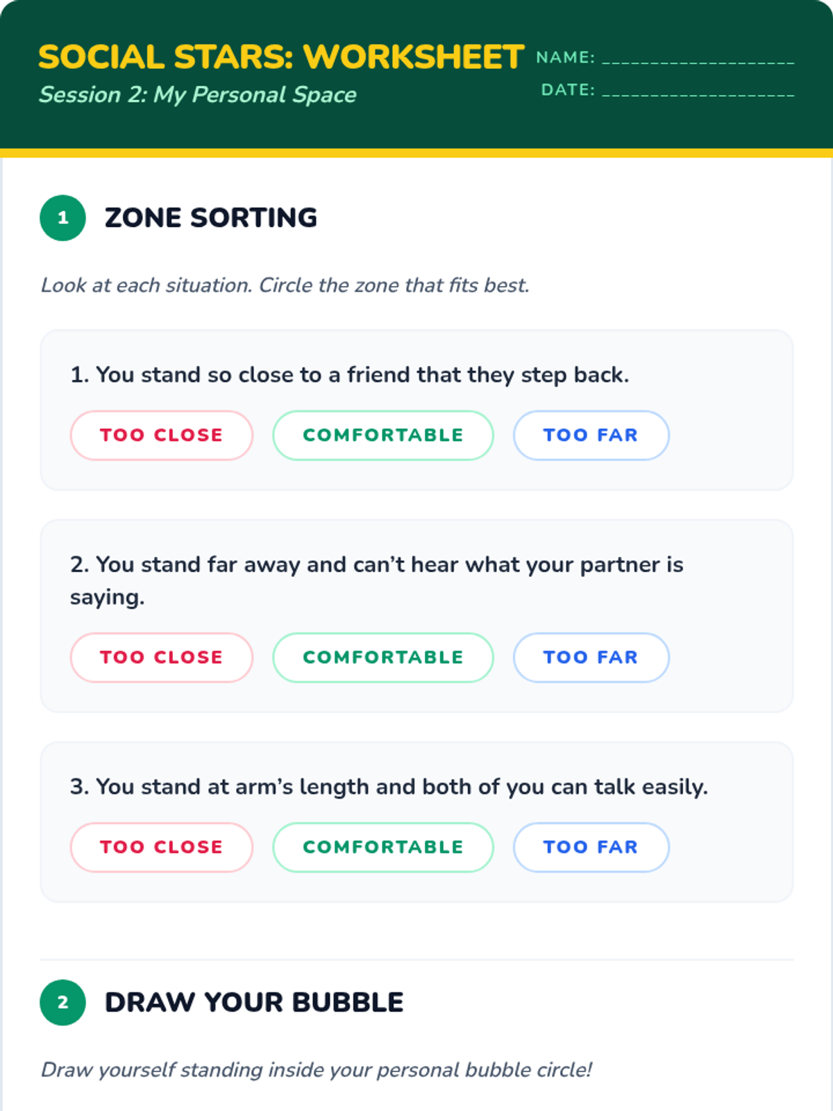 Students learn about personal space bubbles and practice maintaining a comfortable distance from others.