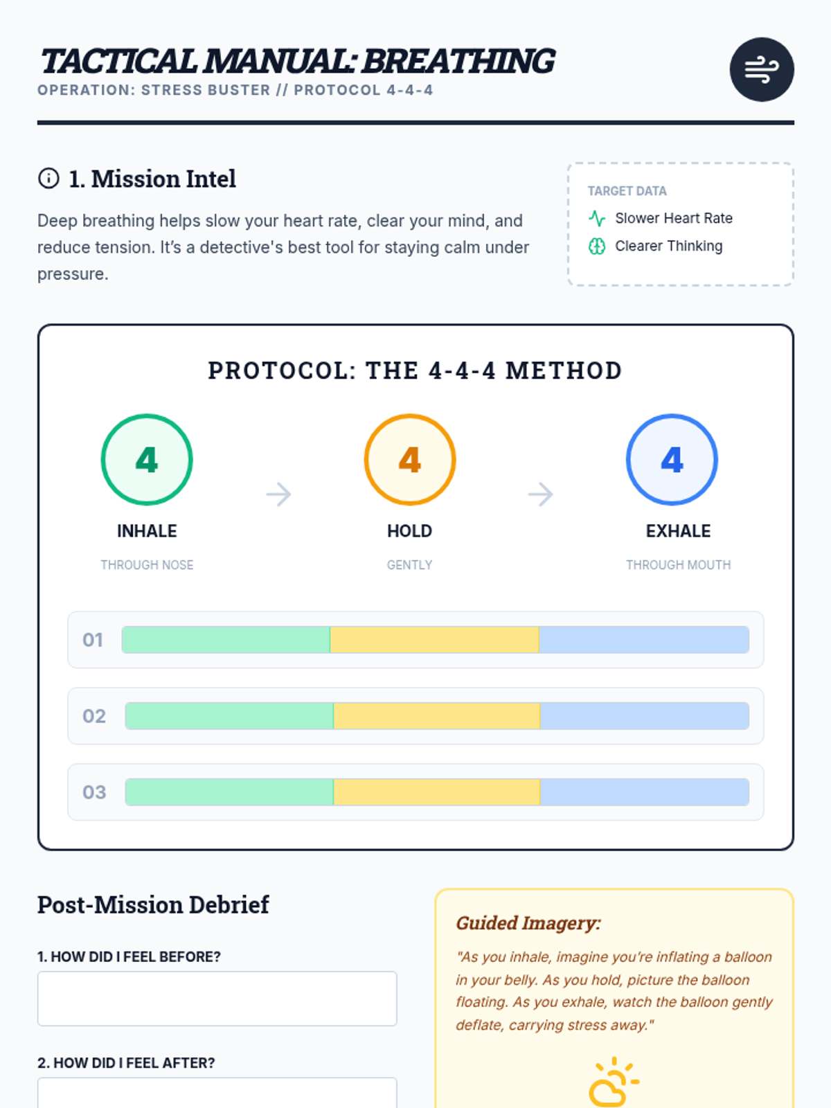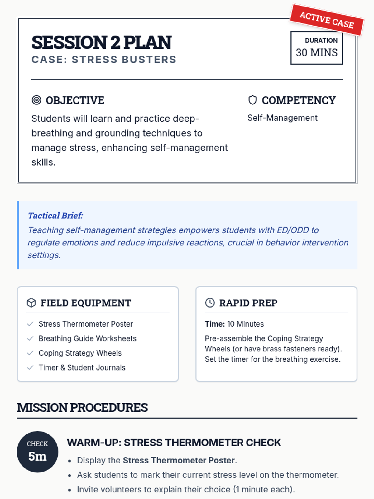 Students learn self-management strategies to regulate emotions and reduce impulsive reactions through deep-breathing and grounding techniques.