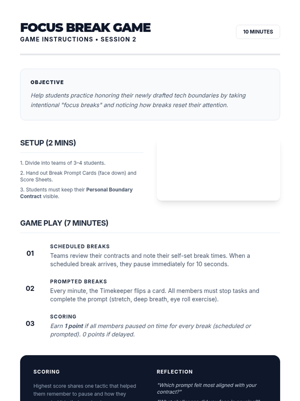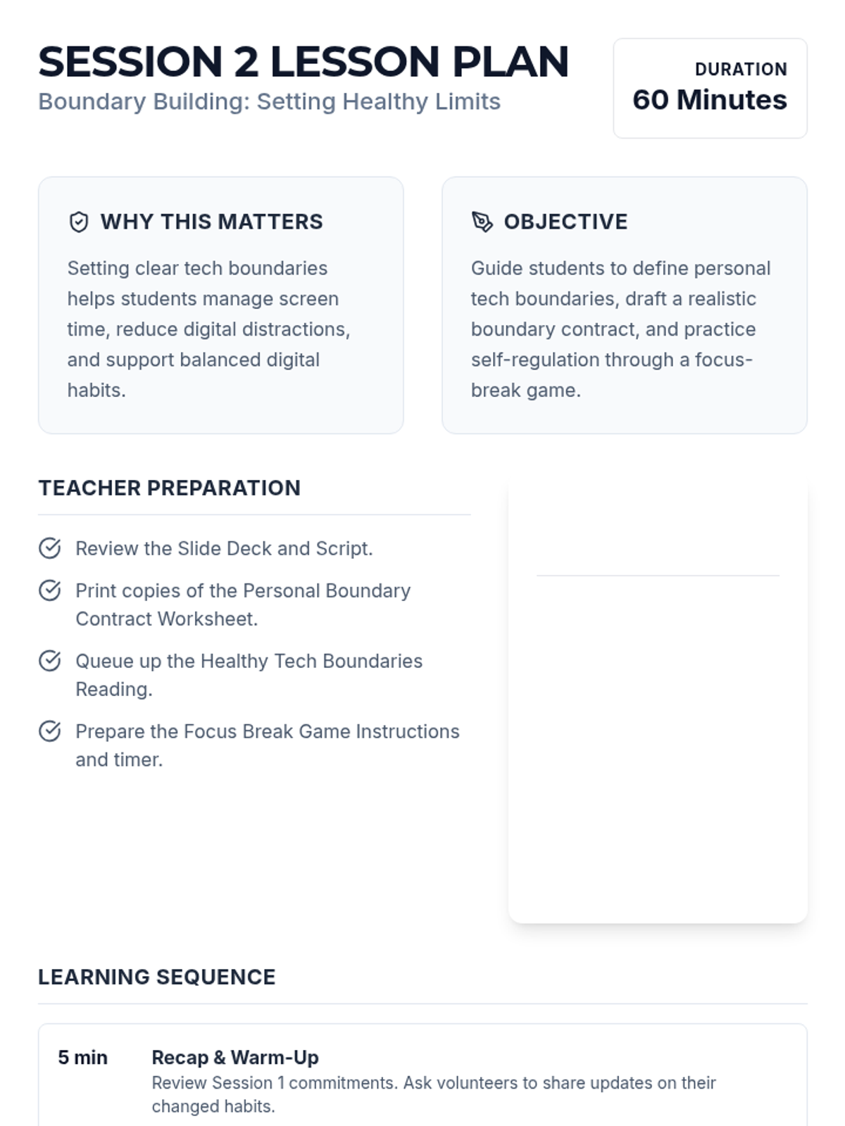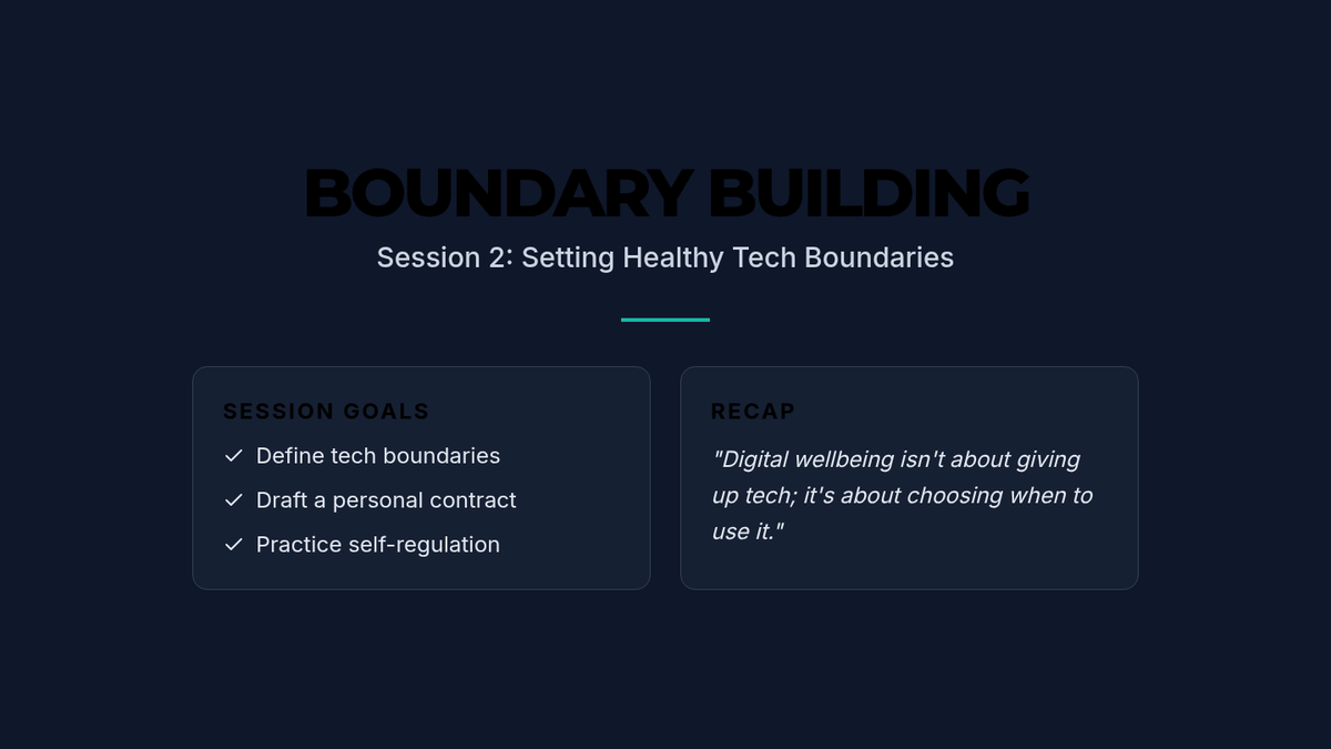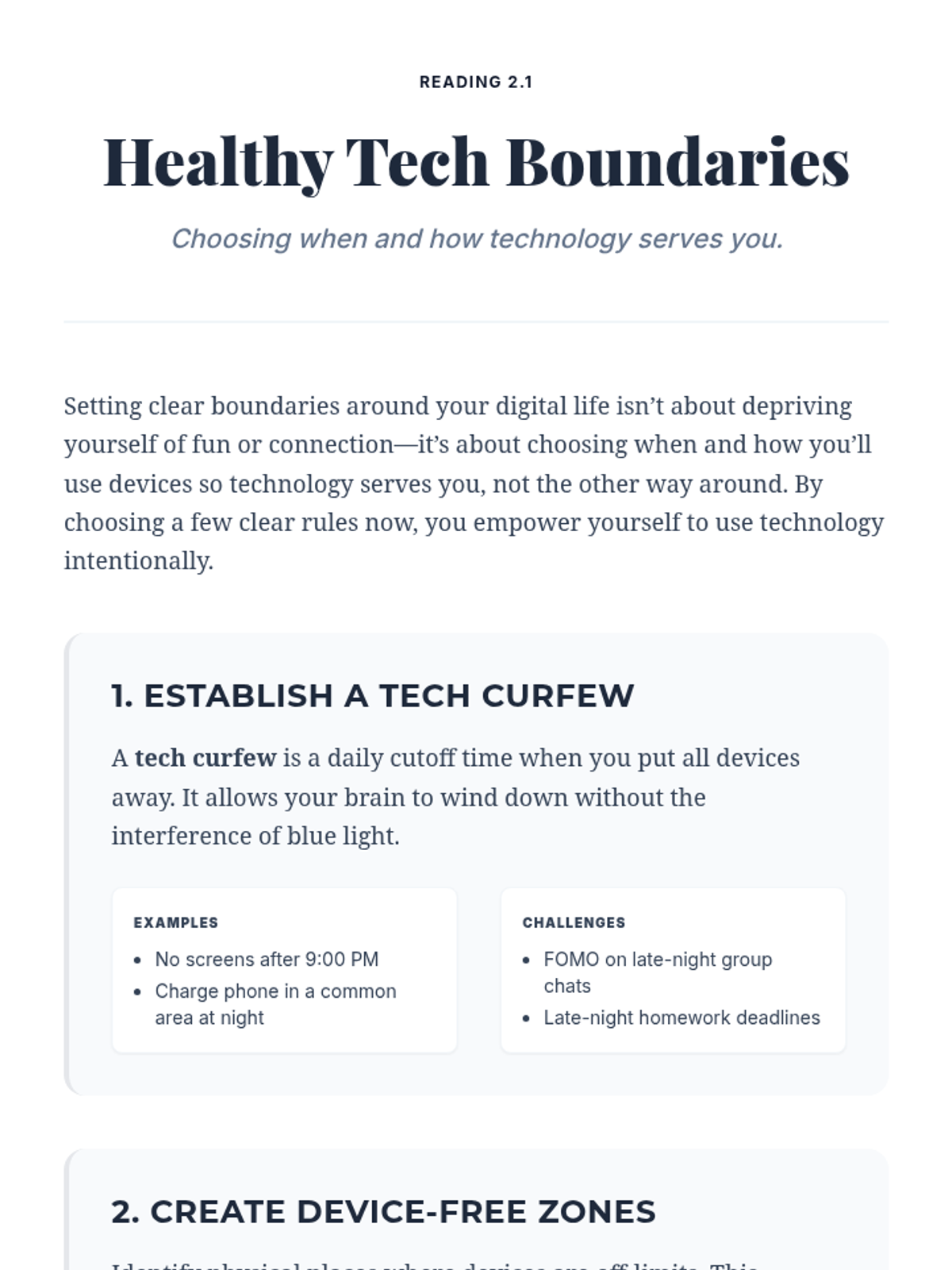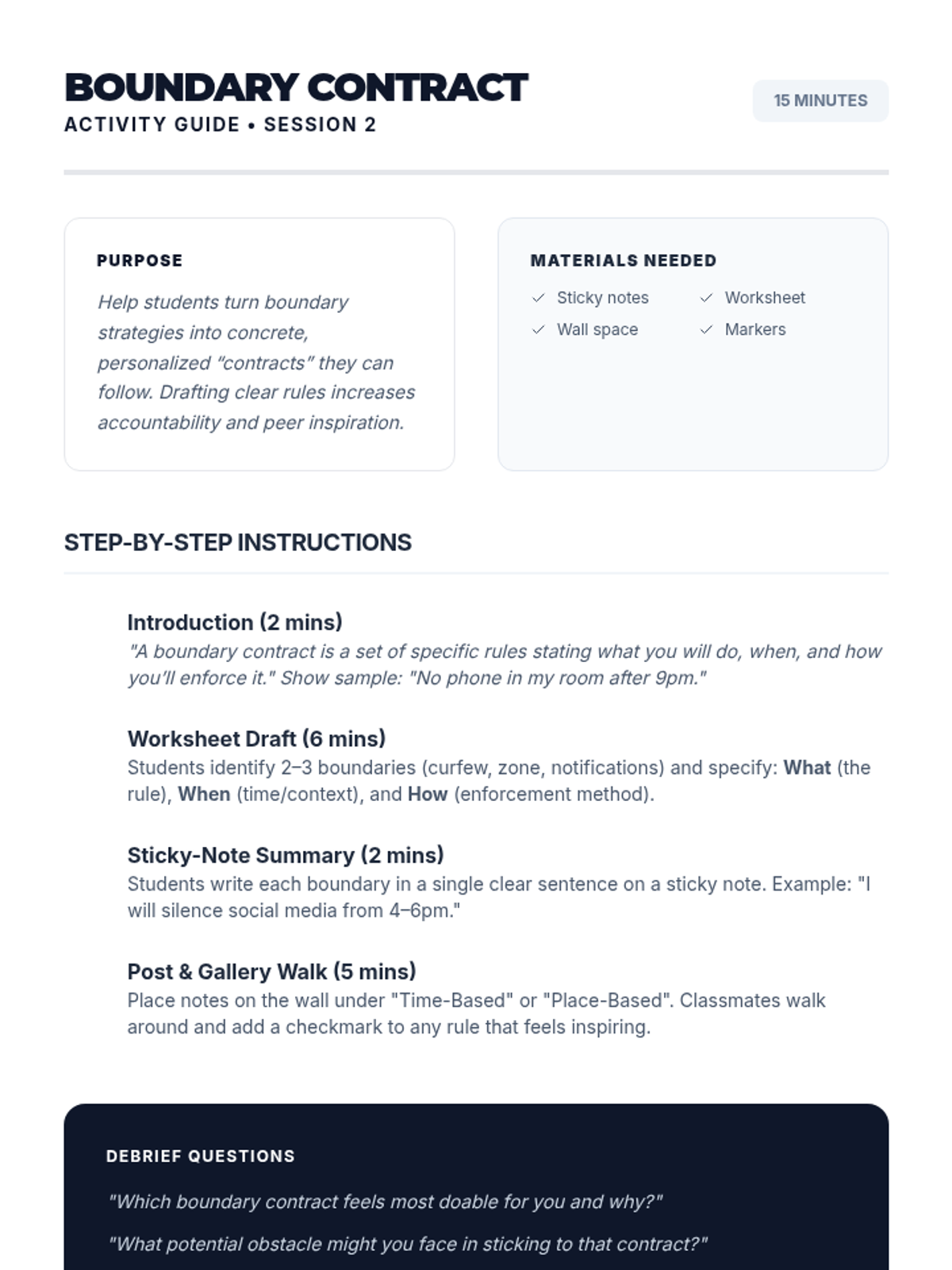Students learn to set healthy tech boundaries through personal contracts and practice self-regulation techniques.