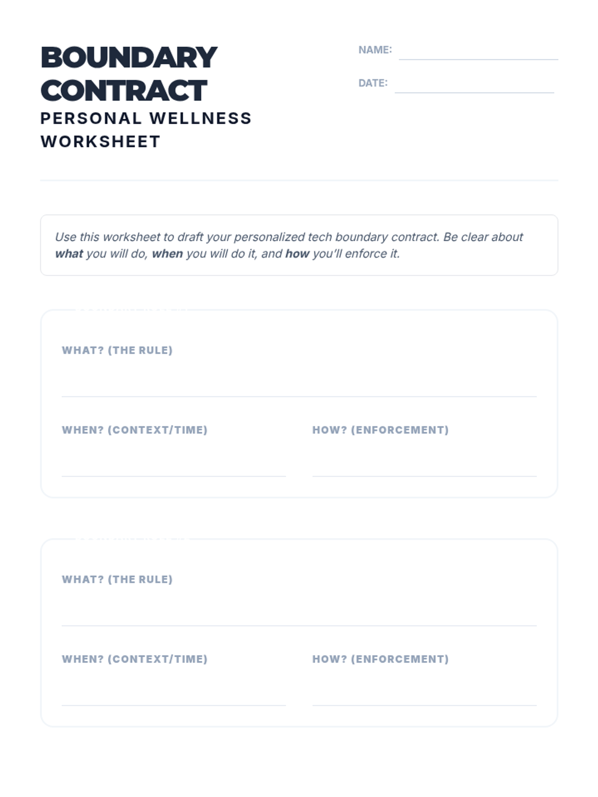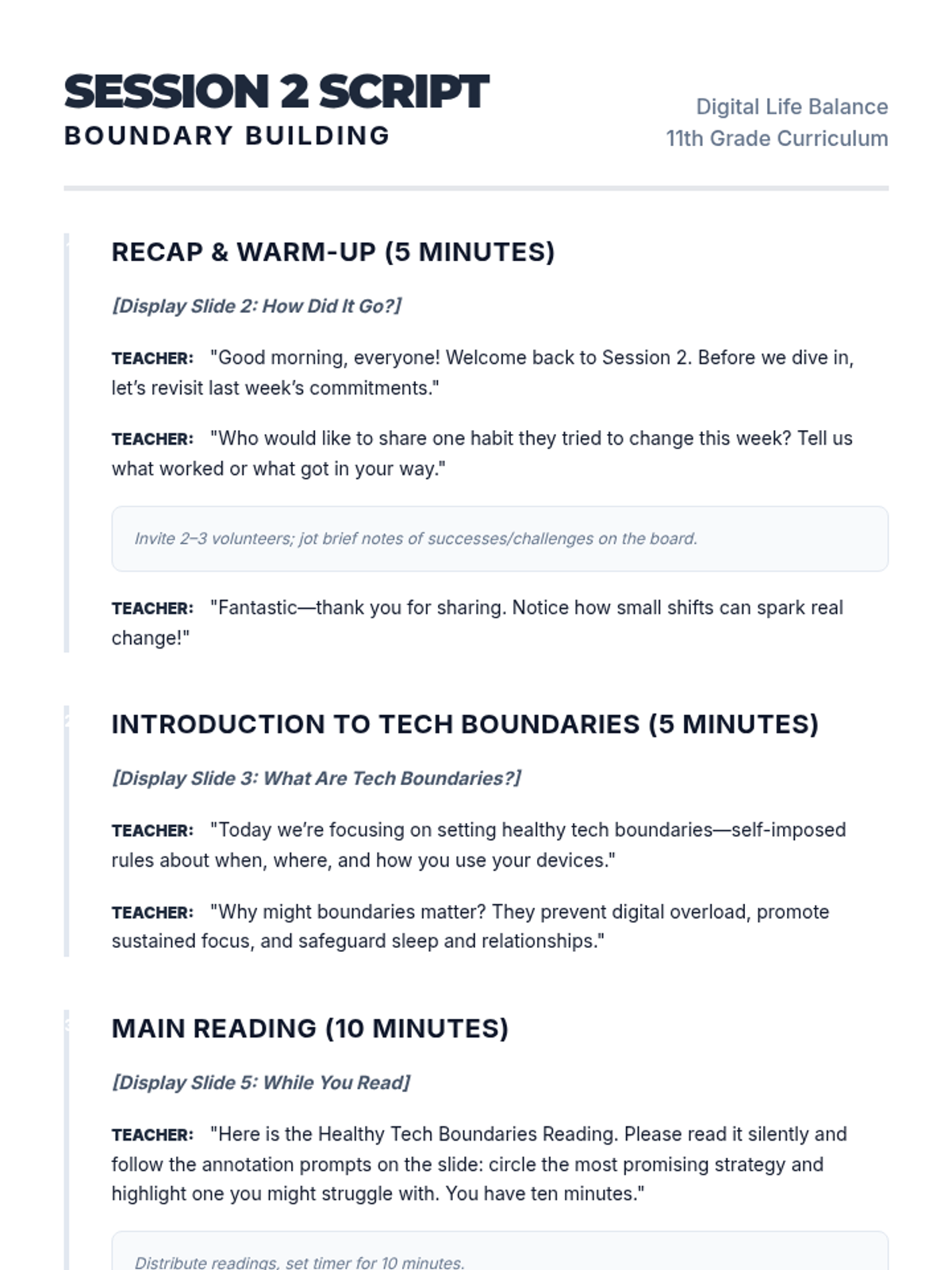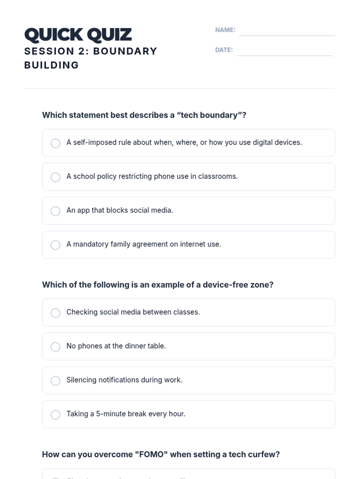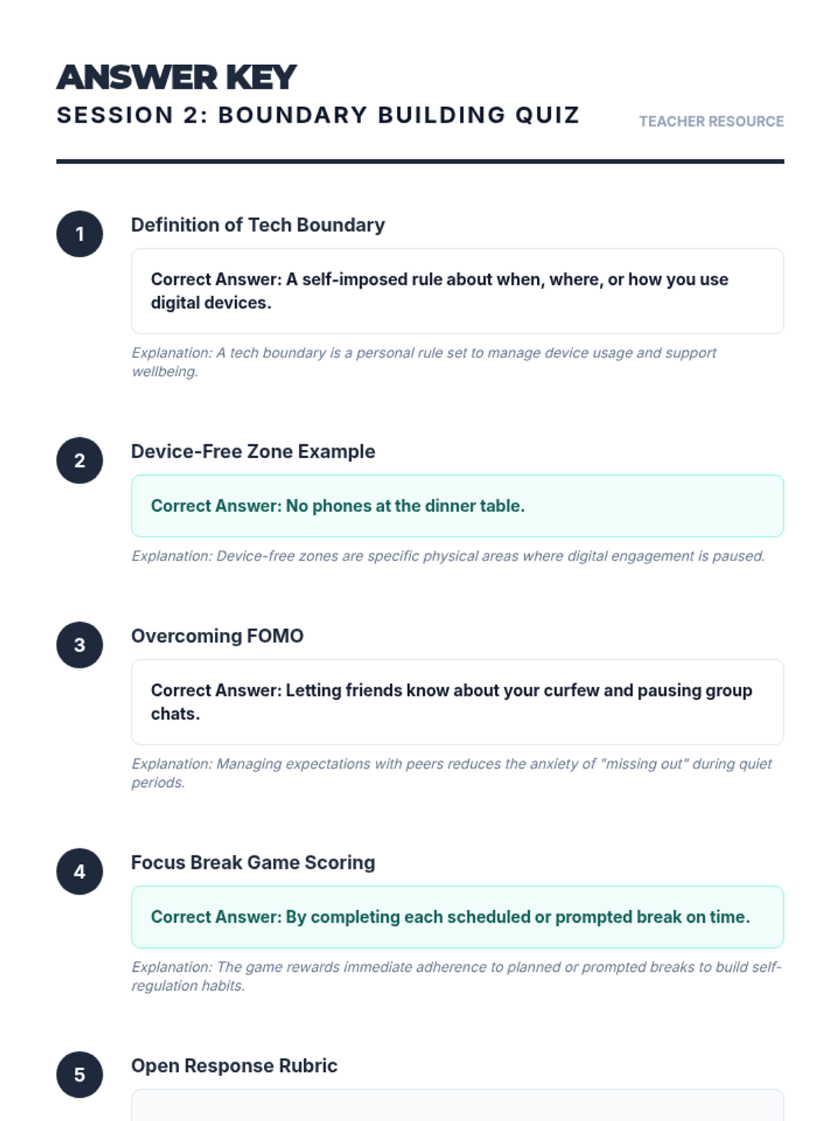Students learn to set healthy tech boundaries through personal contracts and practice self-regulation techniques.