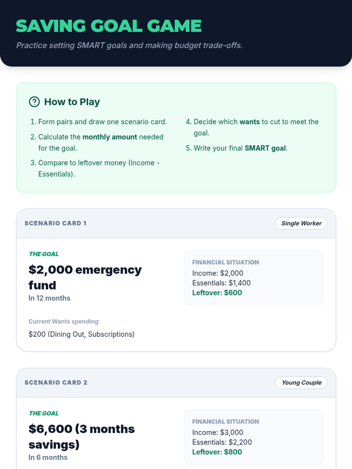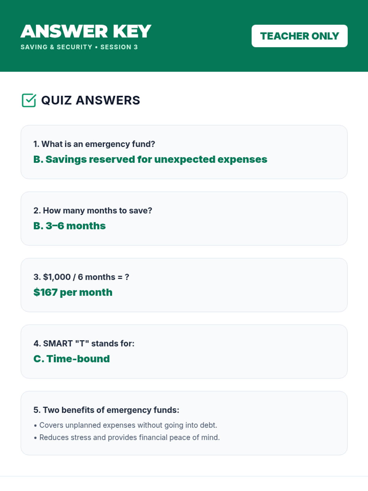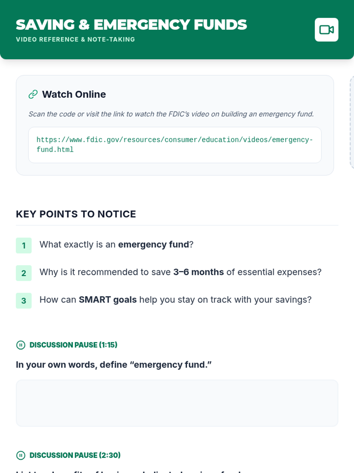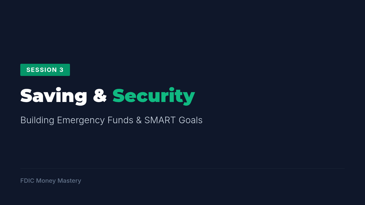 Focuses on the importance of saving and building an emergency fund. Students learn to set SMART saving goals and plan for unexpected financial challenges.