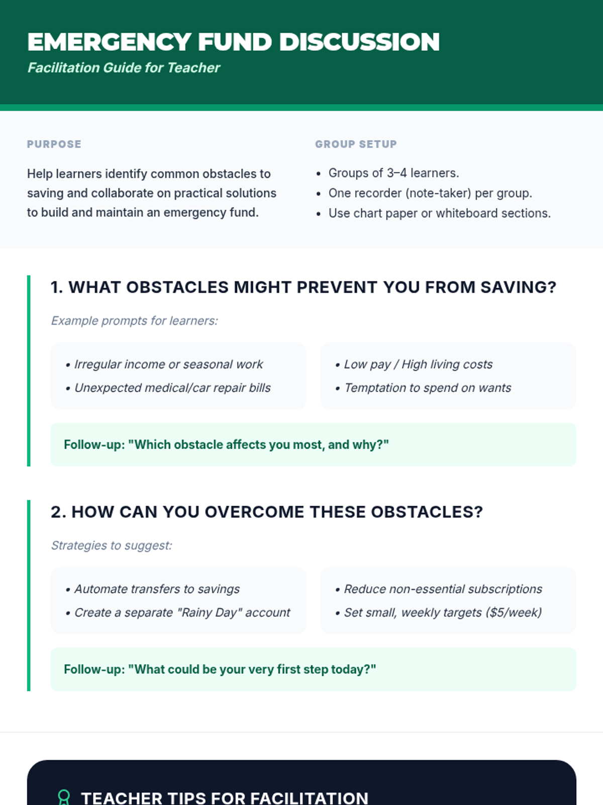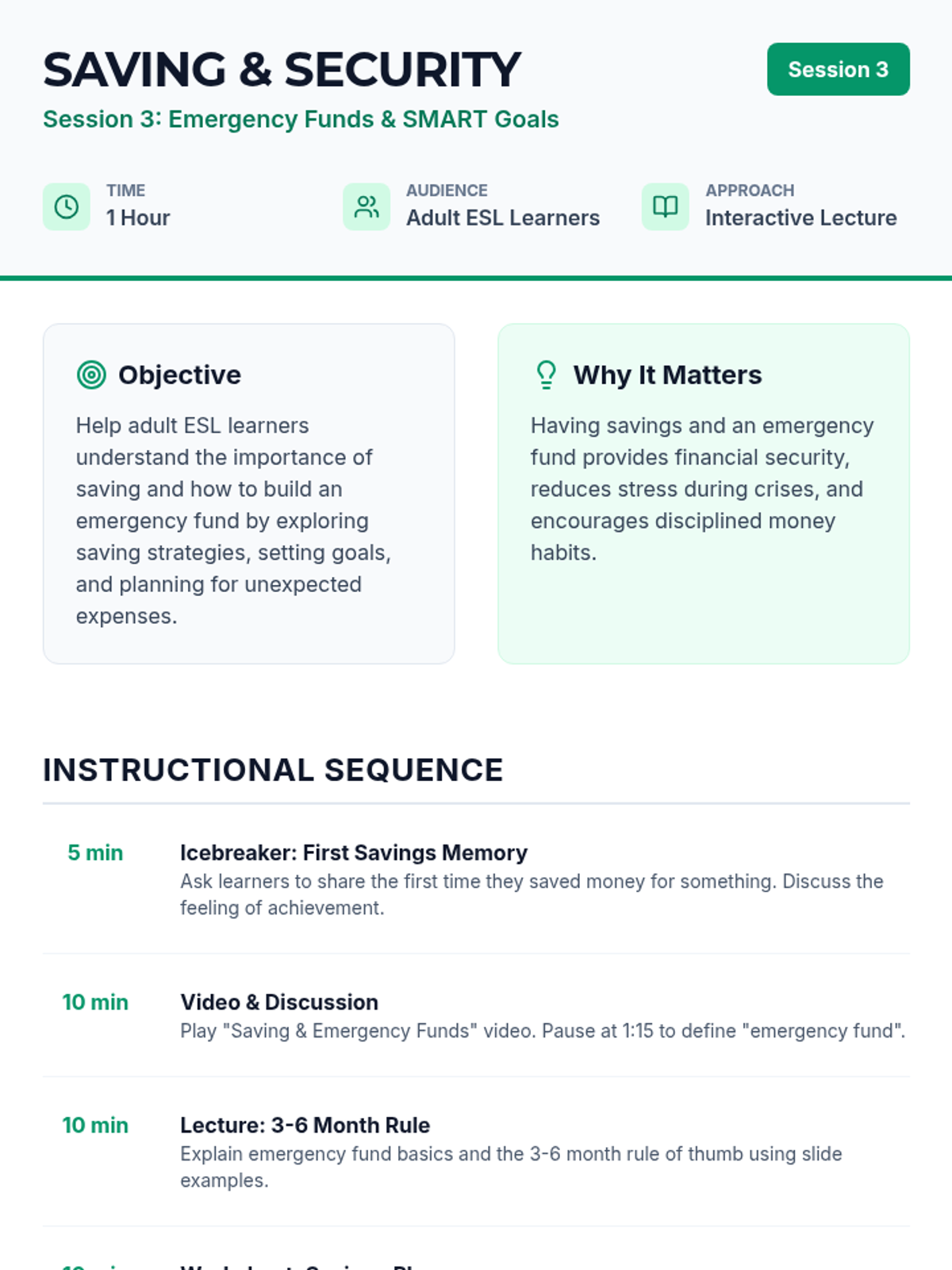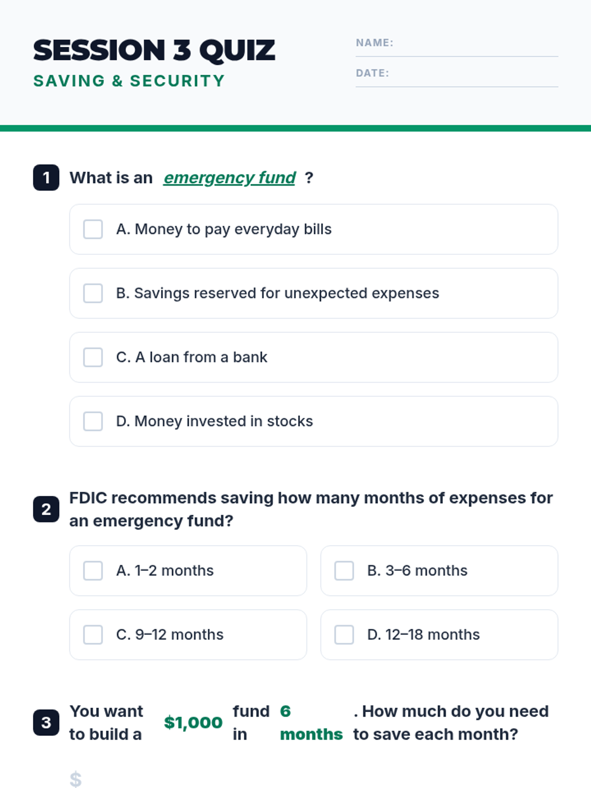 Focuses on the importance of saving and building an emergency fund. Students learn to set SMART saving goals and plan for unexpected financial challenges.