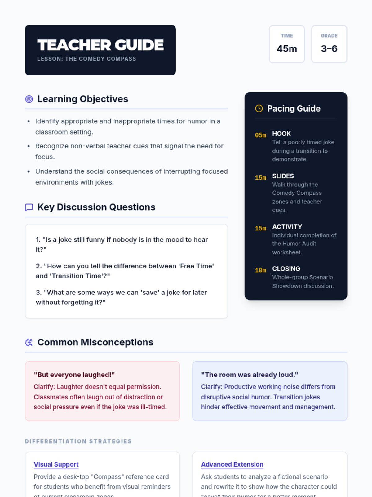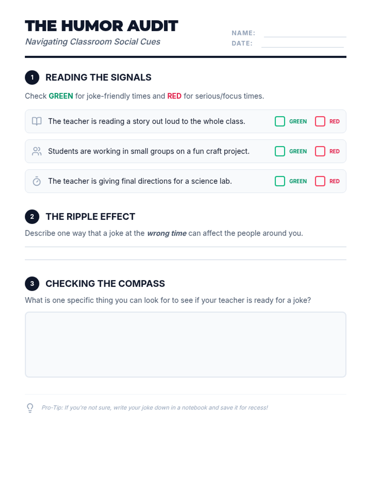 This lesson helps students navigate the social complexities of humor within a school setting. It focuses on identifying appropriate times for jokes, recognizing social cues from teachers, and understanding how timing affects classroom dynamics and respect.