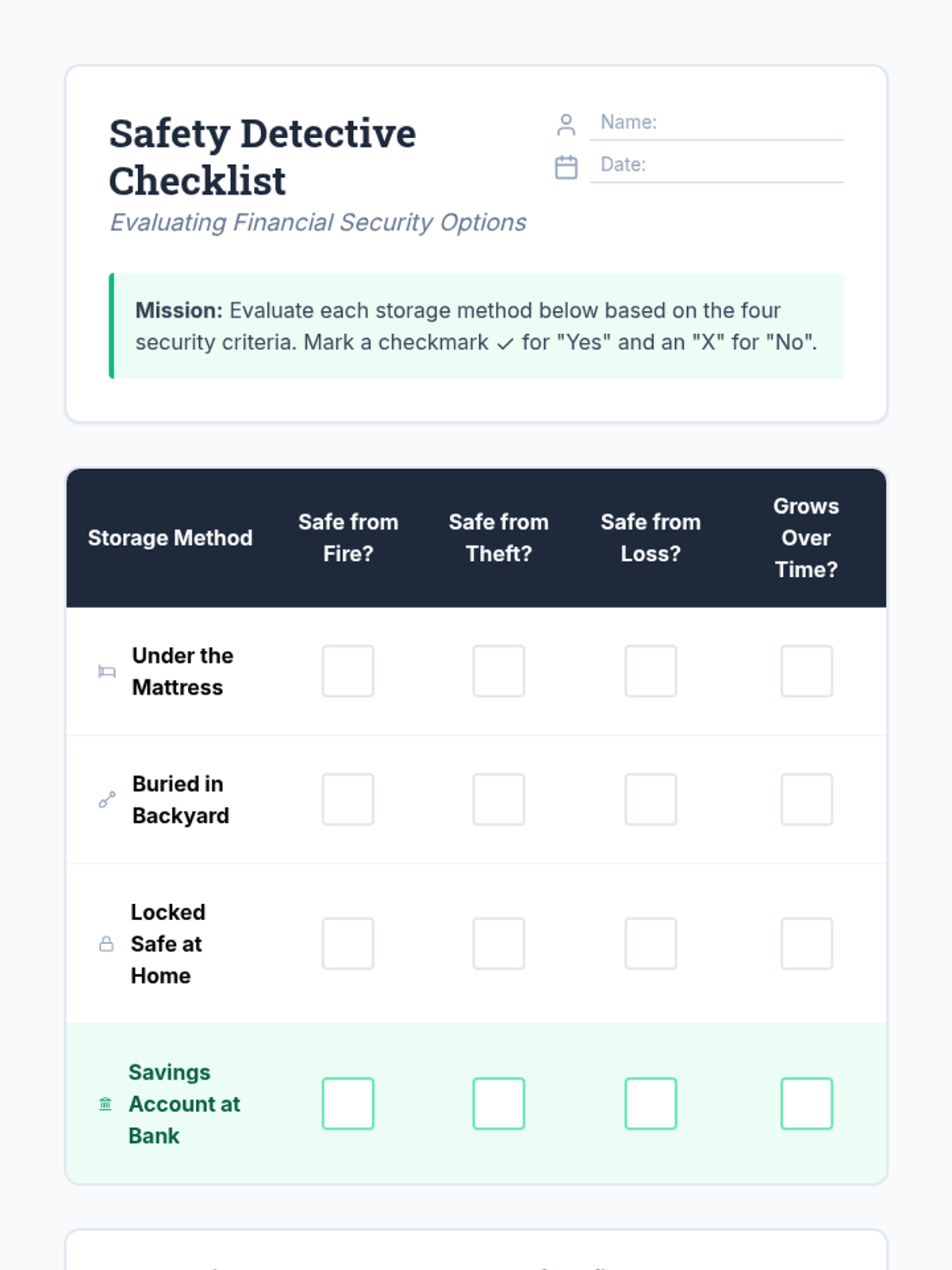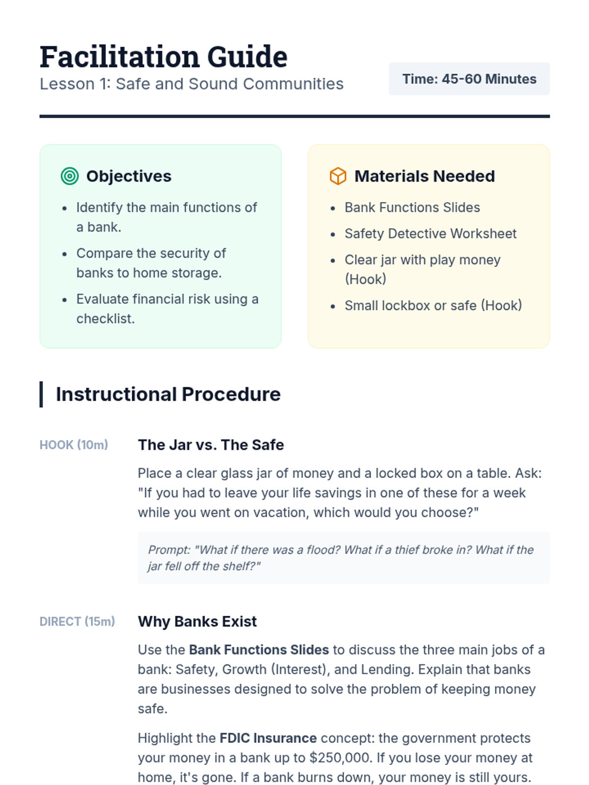 Students explore the fundamental functions of banks, comparing the security of financial institutions to keeping cash at home through an inquiry-based approach.