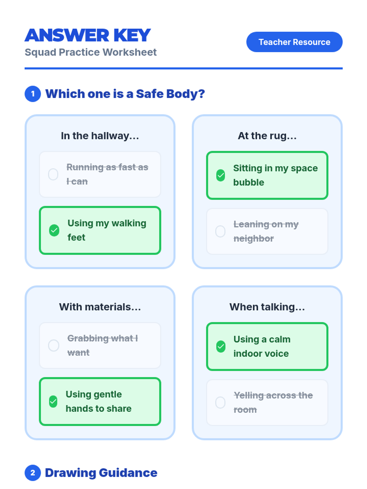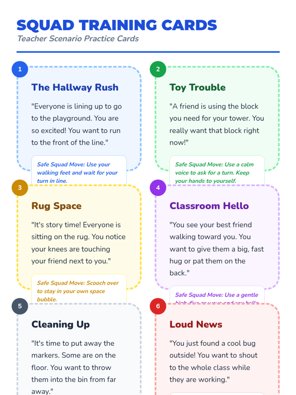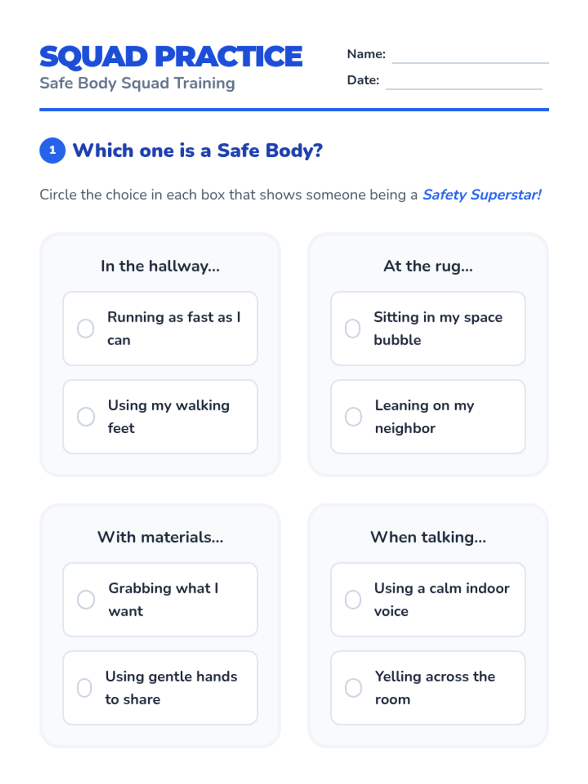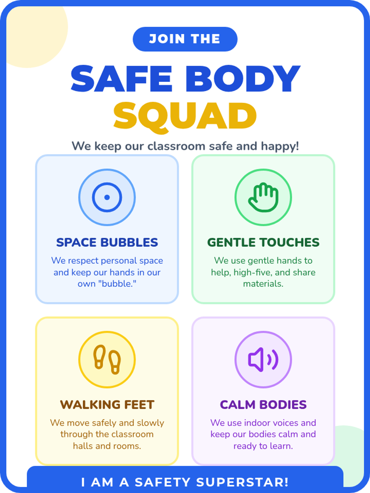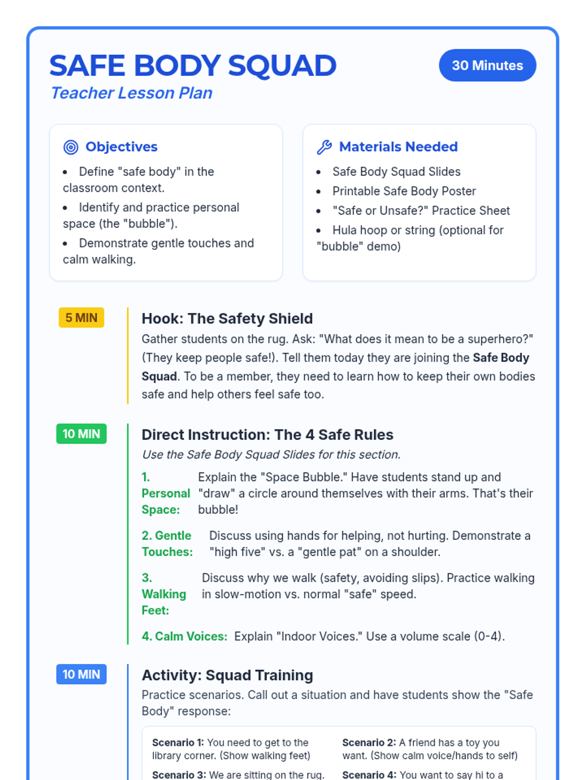A lesson focused on teaching early elementary students how to maintain a 'safe body' through personal space, gentle touches, and calm movement.