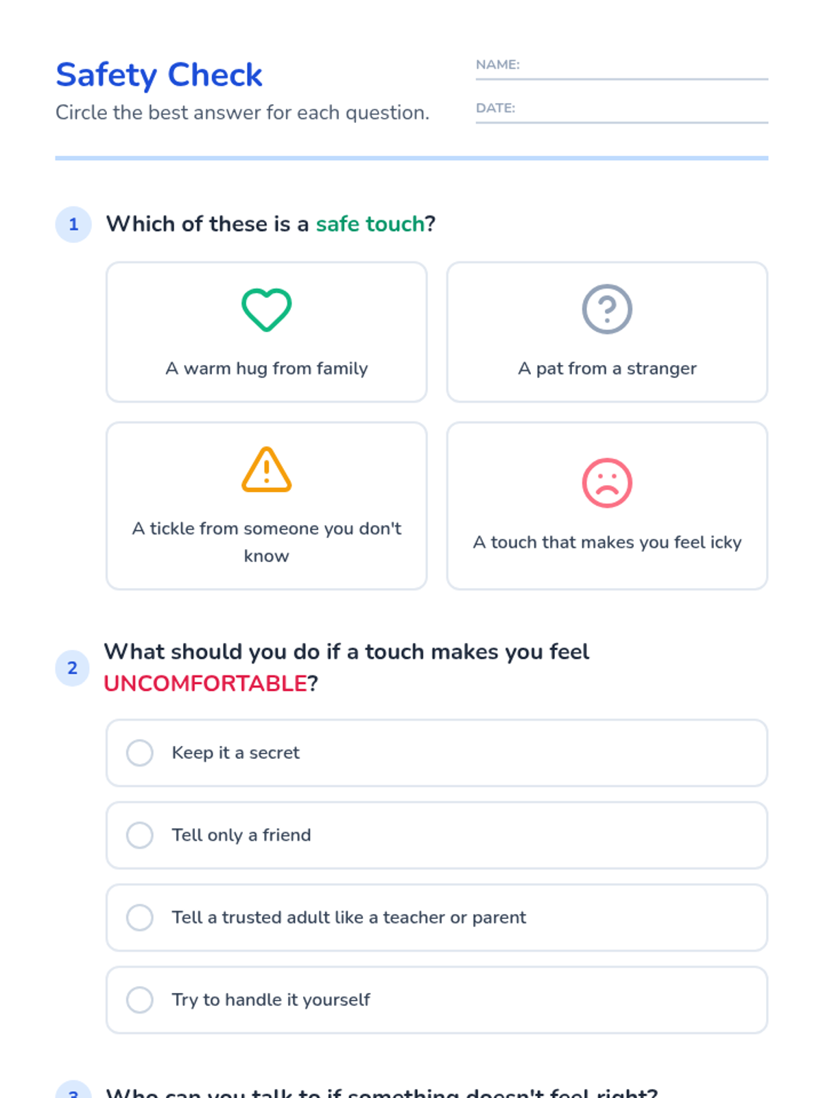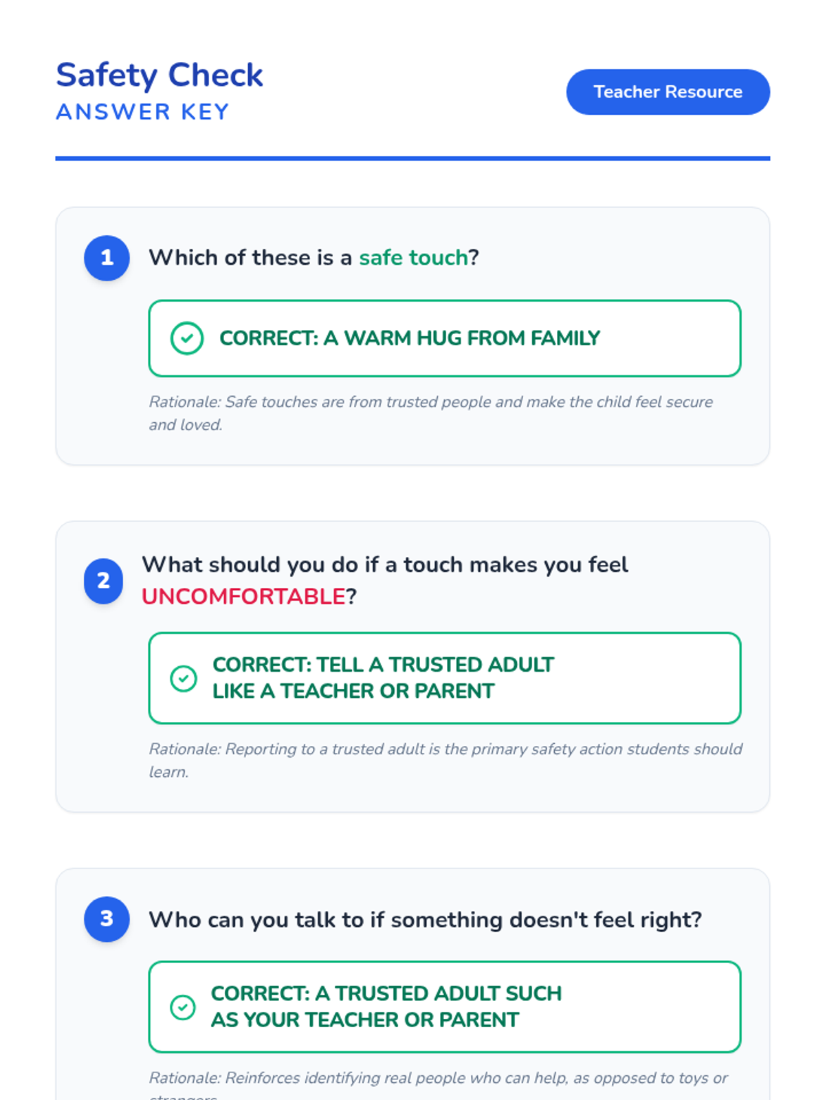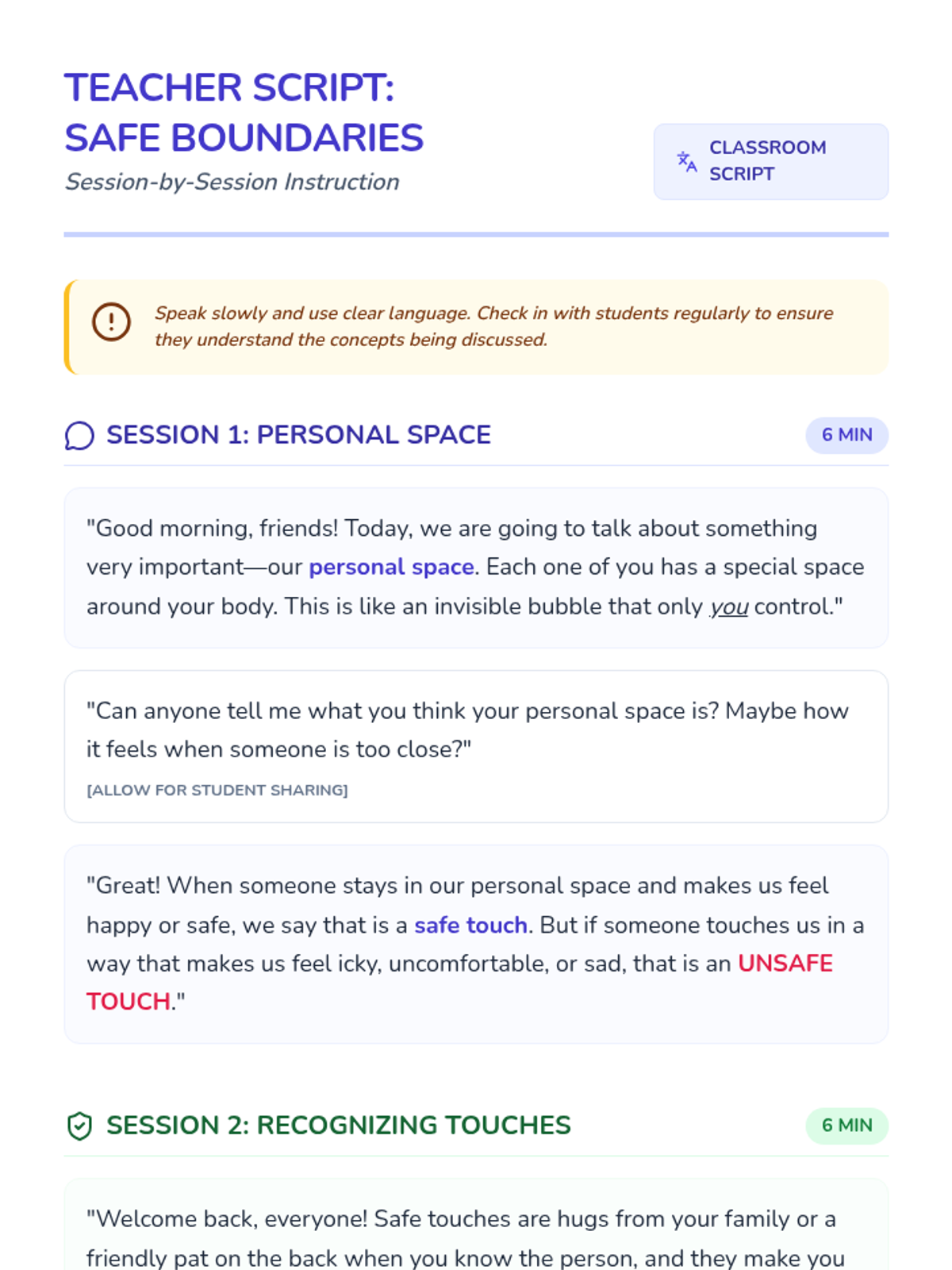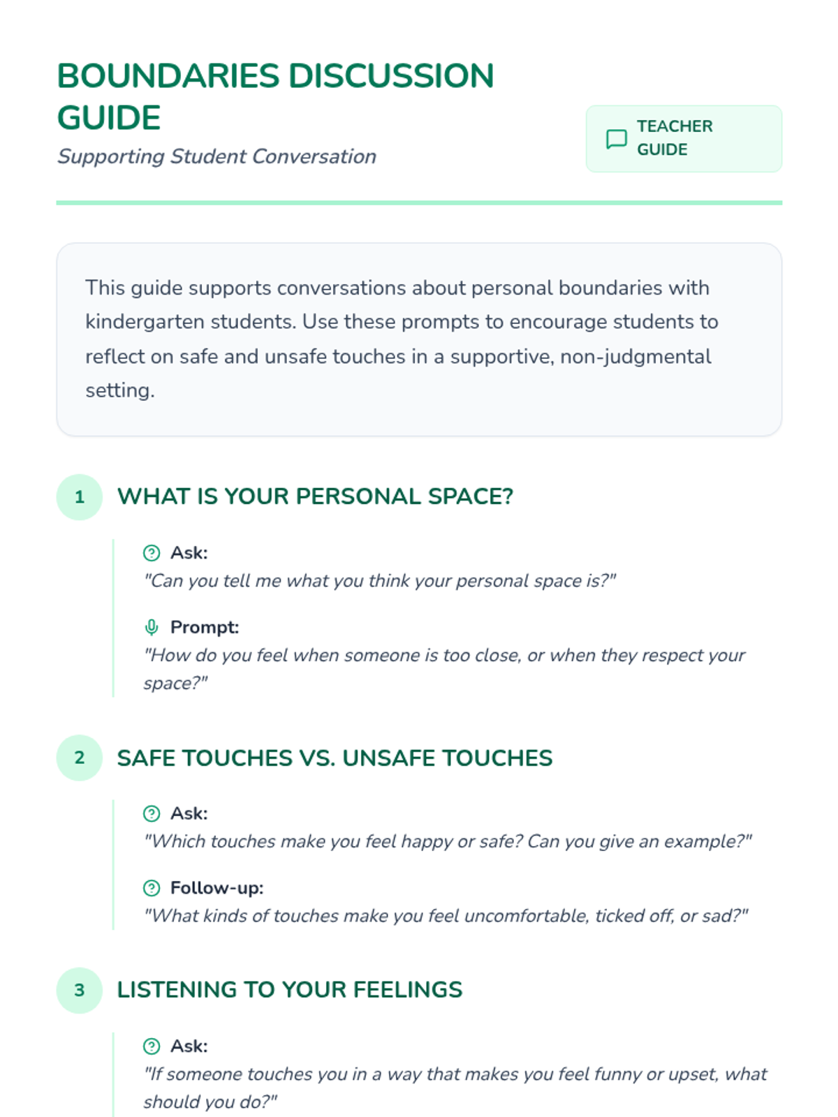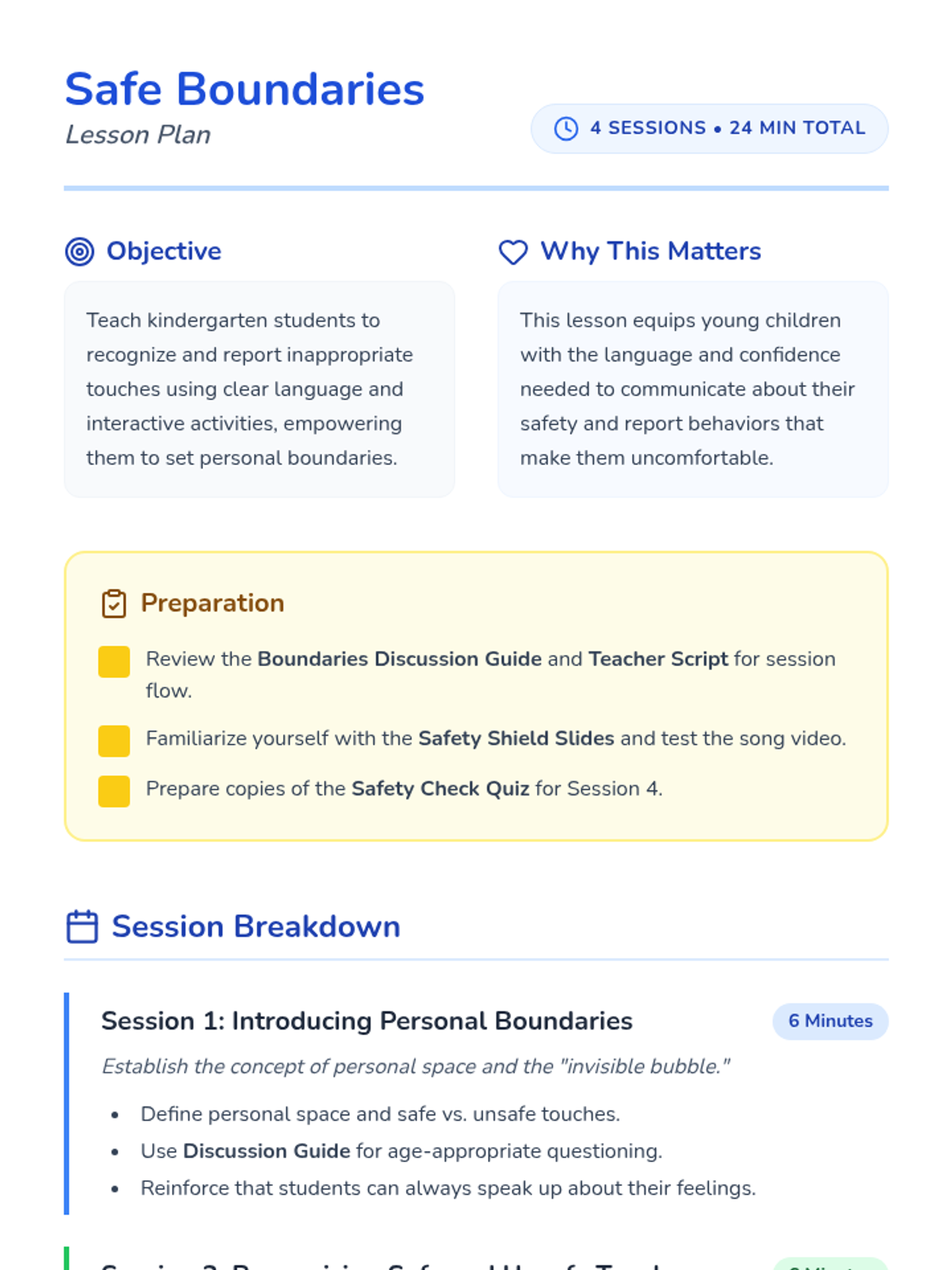 A four-session series for kindergarten students focused on personal boundaries, identifying safe and unsafe touches, and the importance of reporting discomfort to trusted adults.