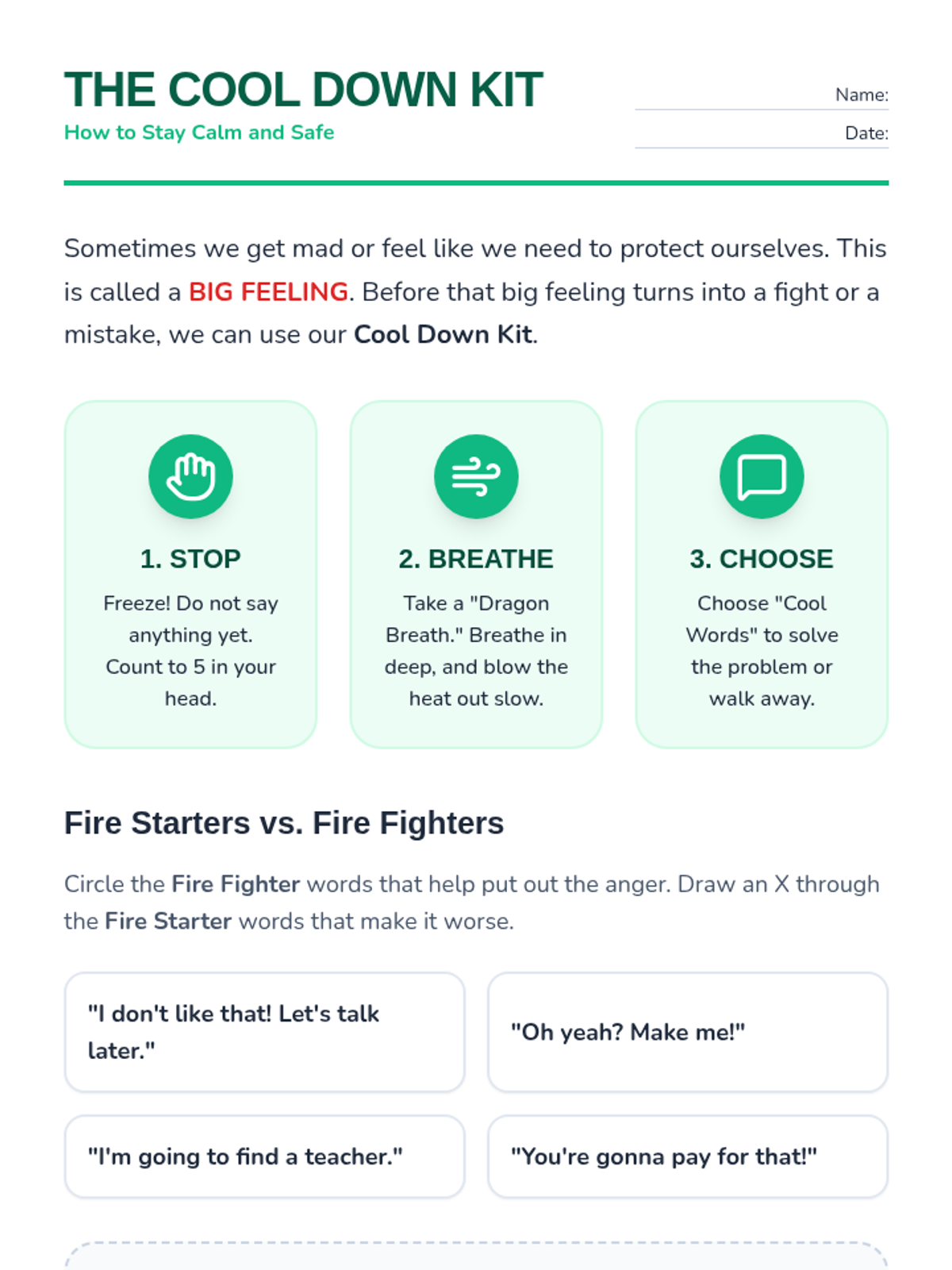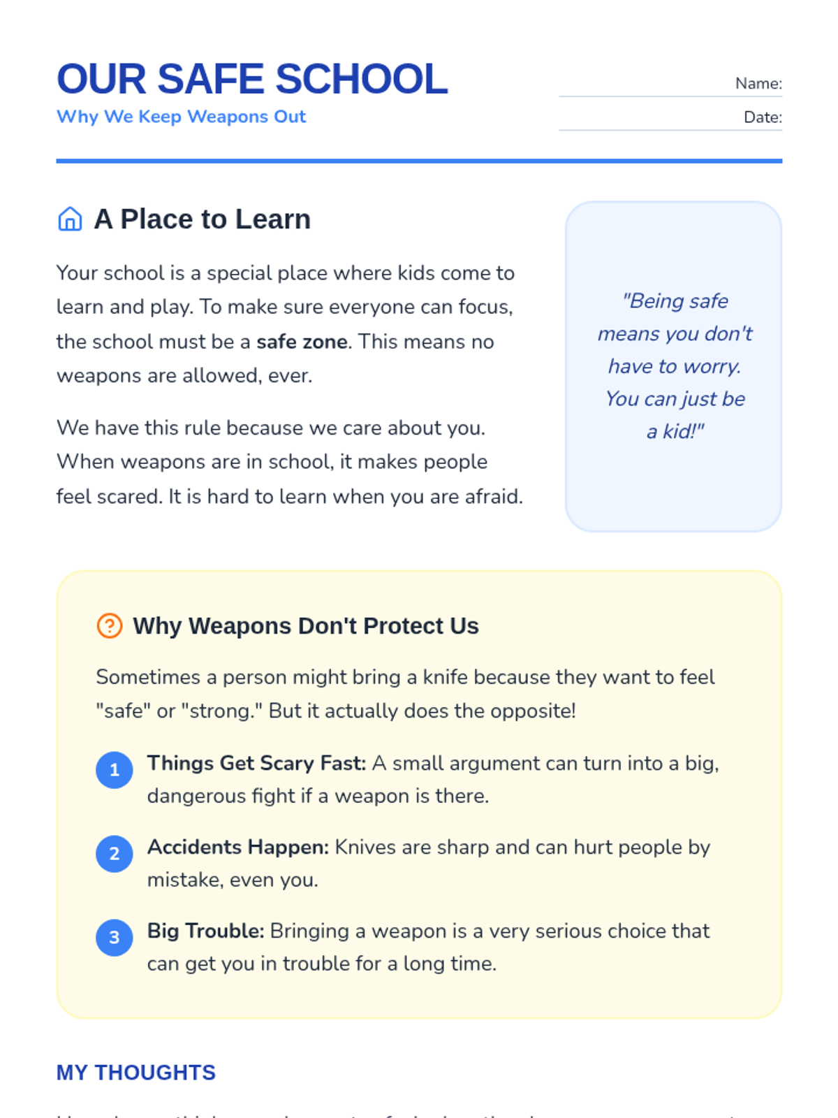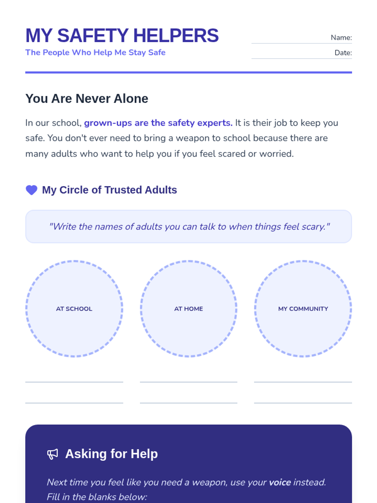 A comprehensive packet designed for a student to reflect on school safety, learn de-escalation strategies, and identify a support network after a weapon-related incident.