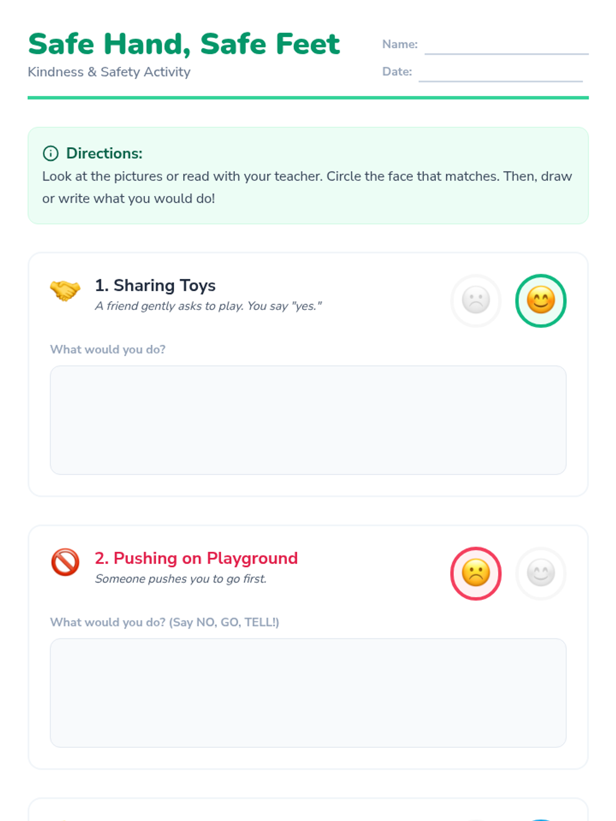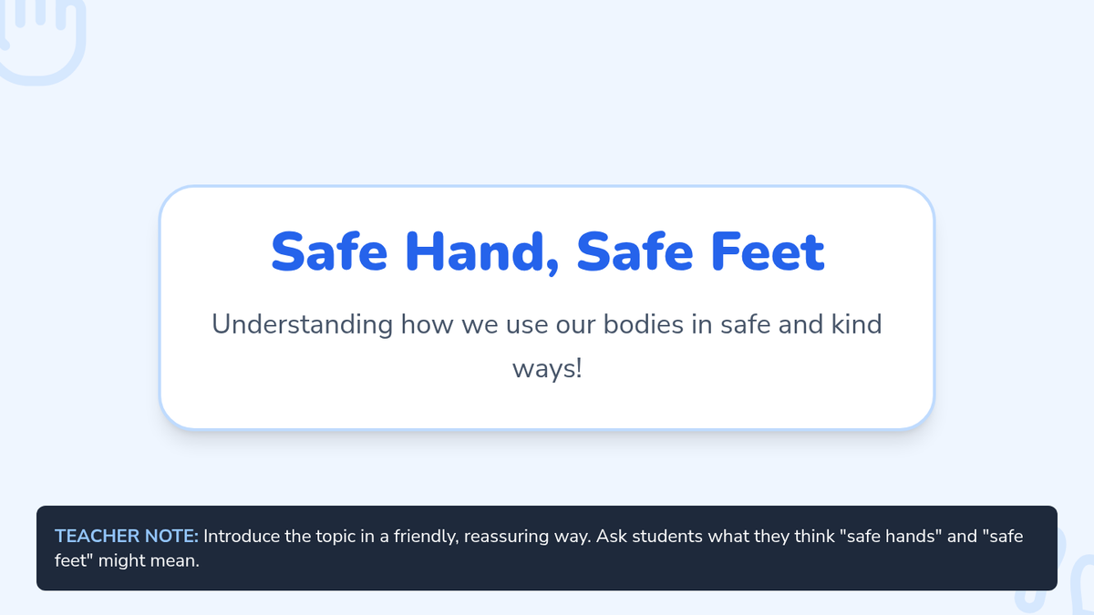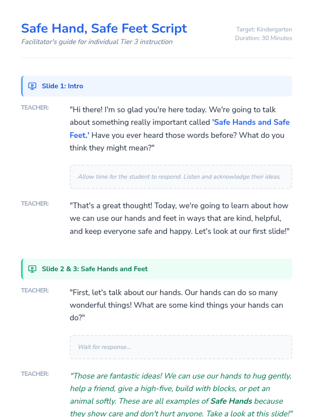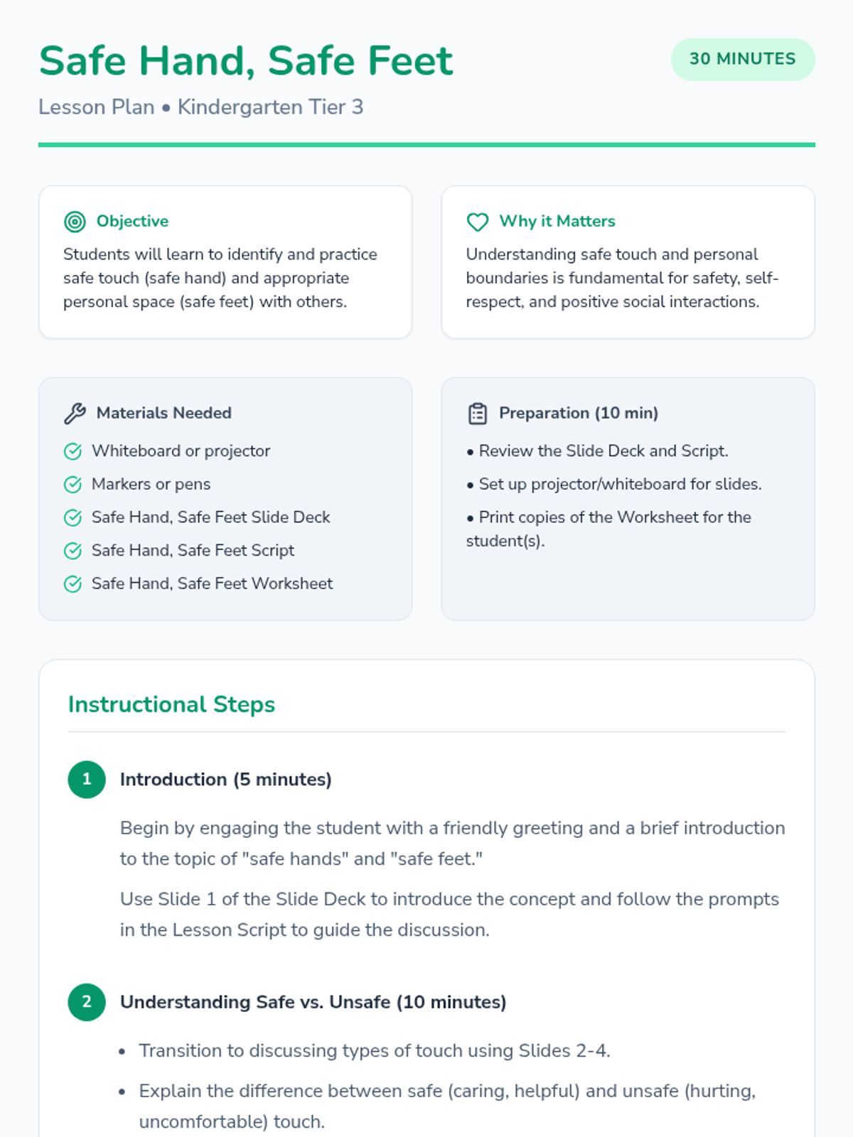 A 30-minute Tier 3 social-emotional lesson for Kindergarten students focusing on identifying safe versus unsafe touch and practicing personal boundaries using the 'Say No, Go, Tell' strategy.