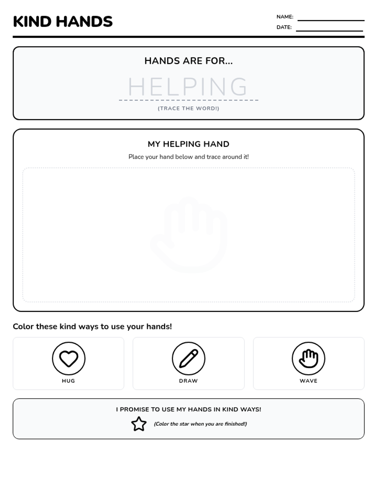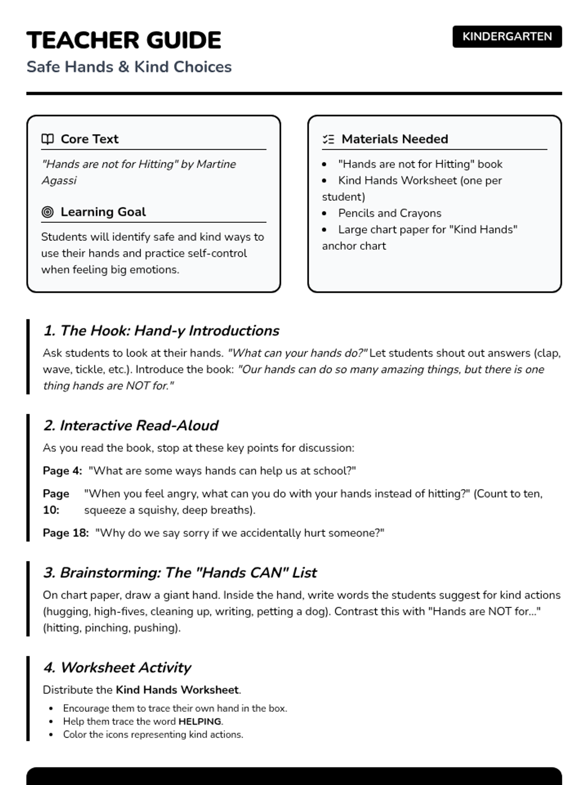 A kindergarten lesson focused on self-control and using hands for kind actions, centered around the book 'Hands are not for Hitting' by Martine Agassi.