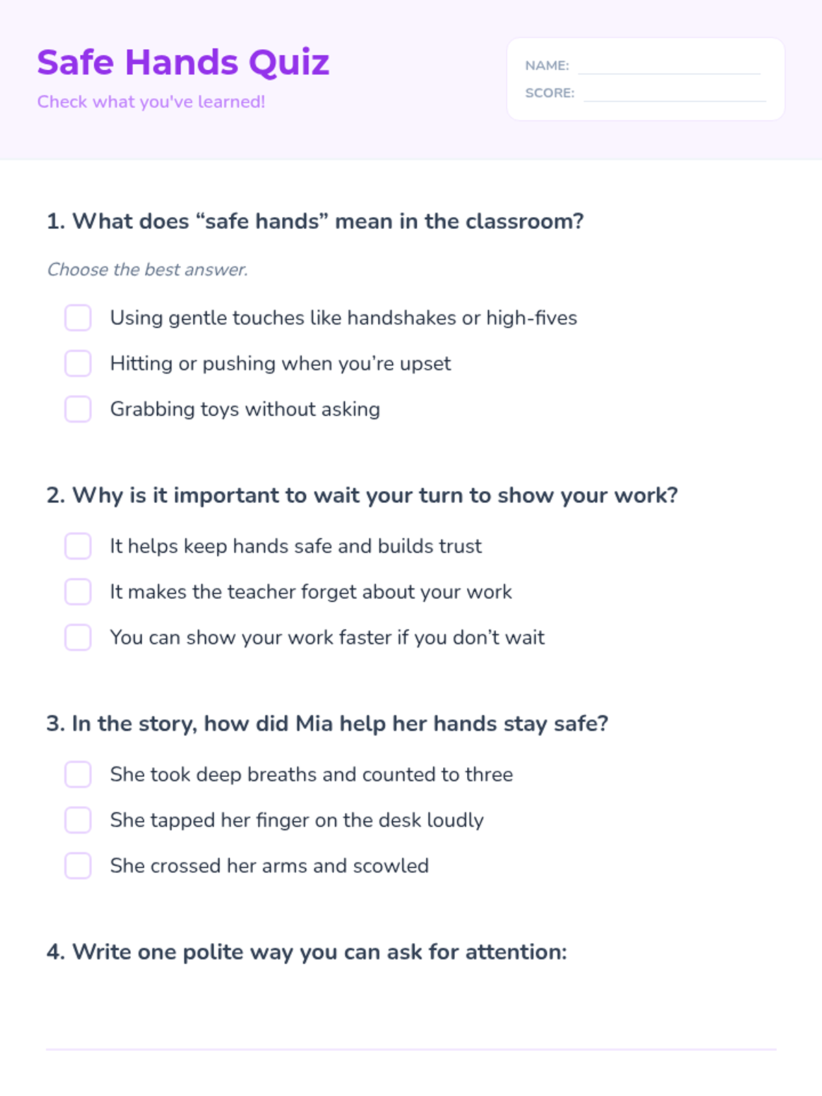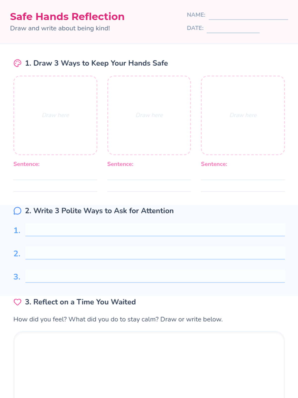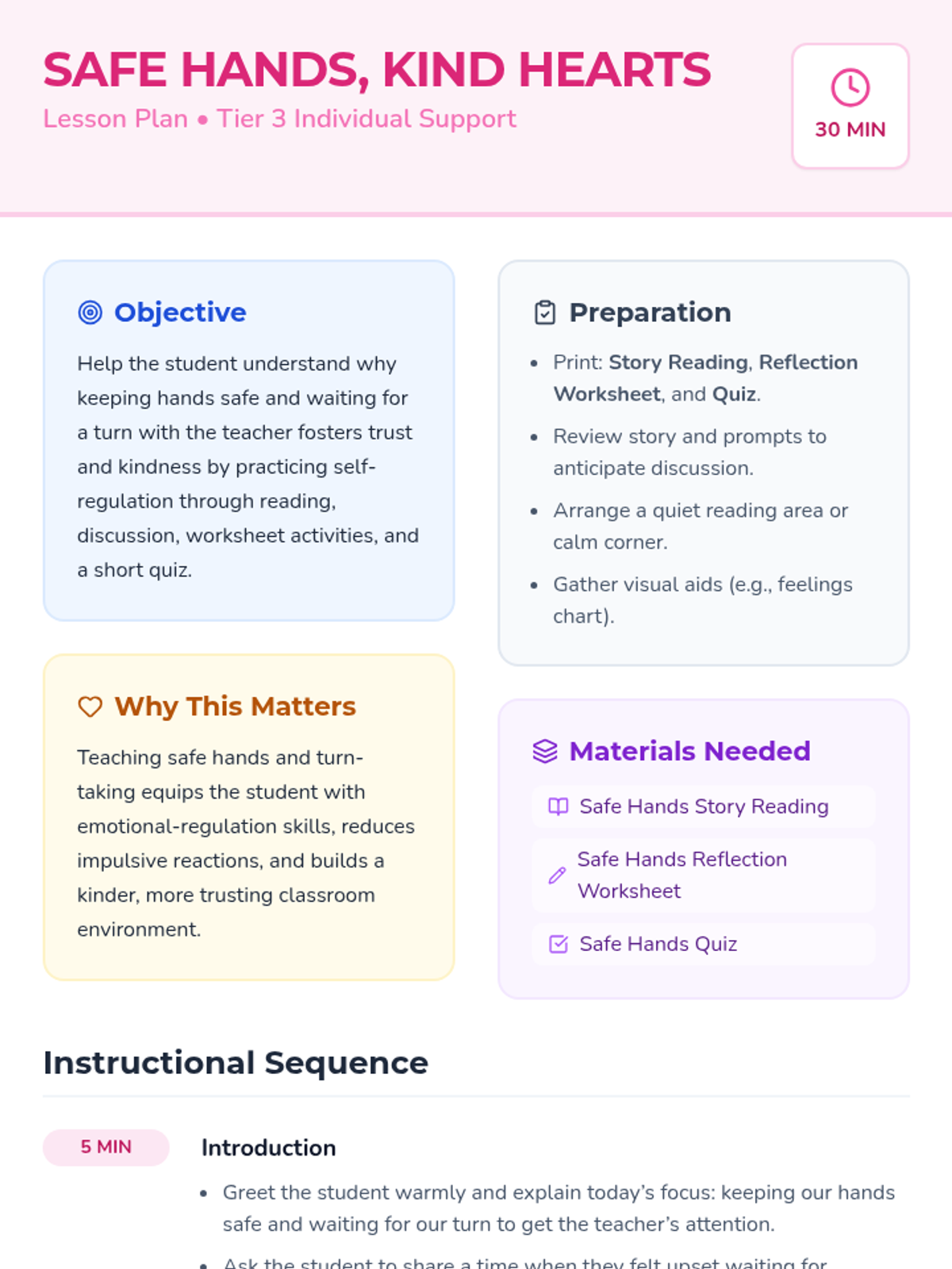 A 30-minute Tier 3 individual lesson for 1st grade students focused on self-regulation, keeping hands safe, and waiting for turns with teacher attention.